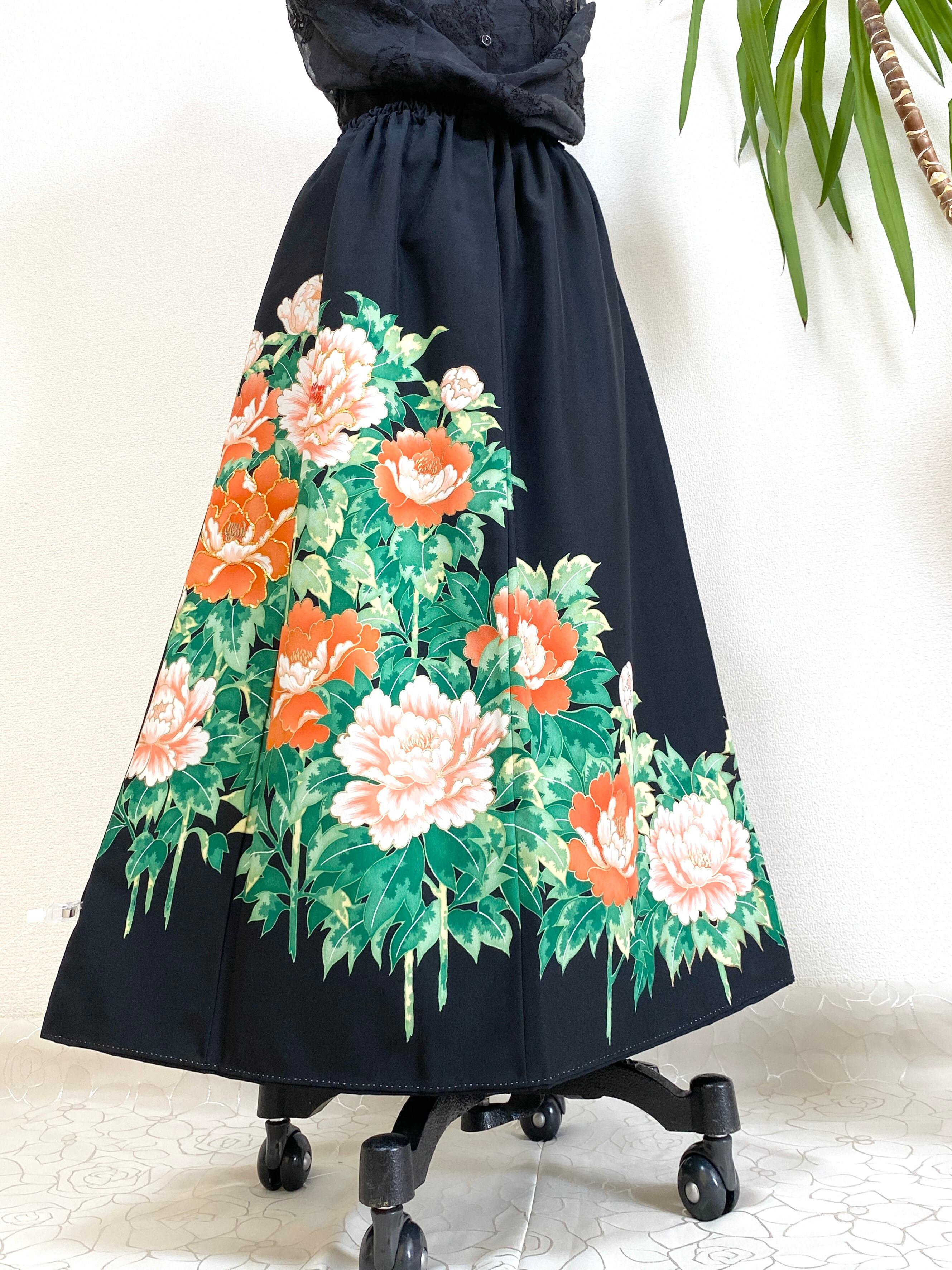 大人可愛いセレブ着物スカートフリーサイズ黒留袖着物リメイクウエストゴムロングスカート