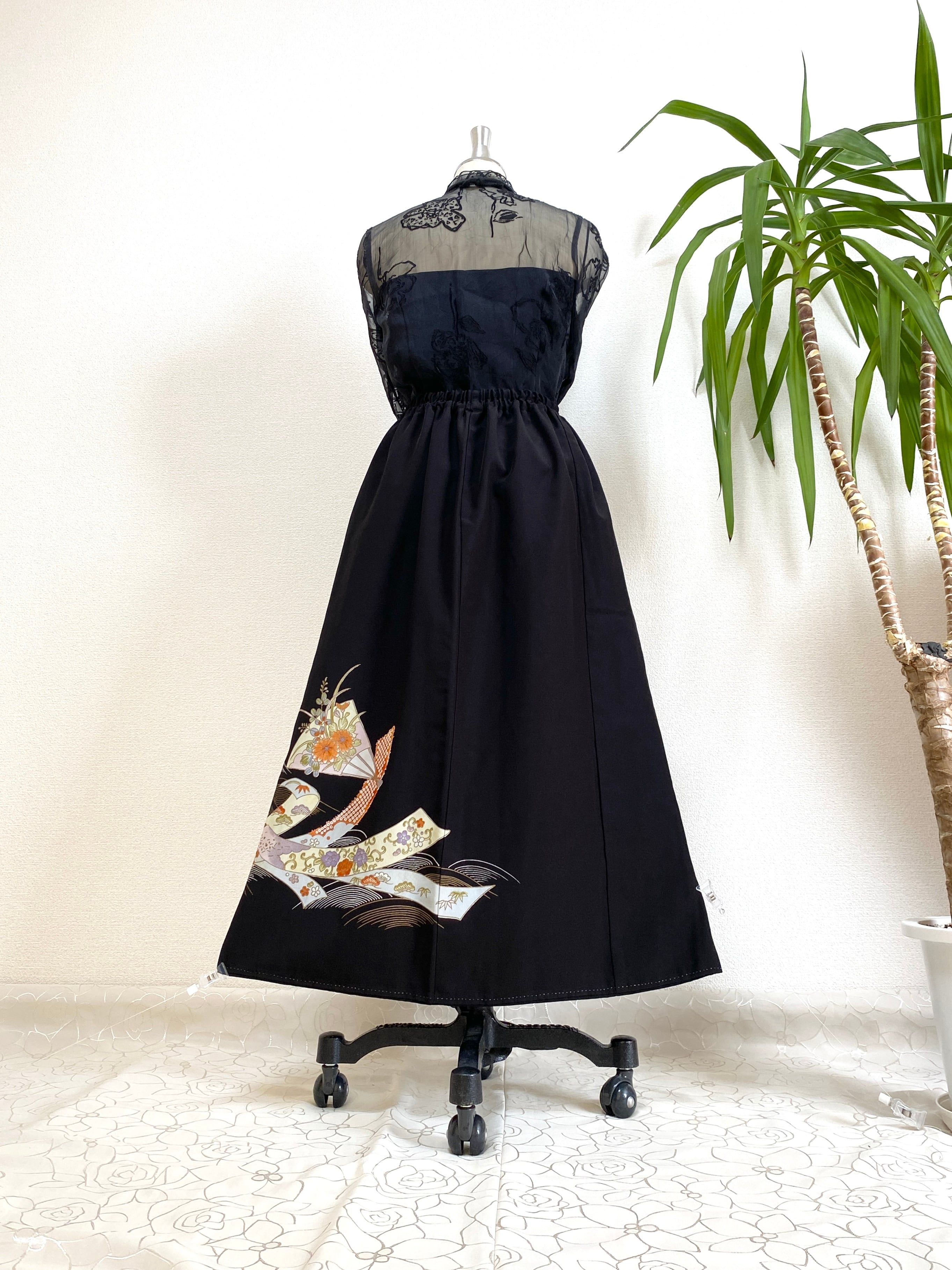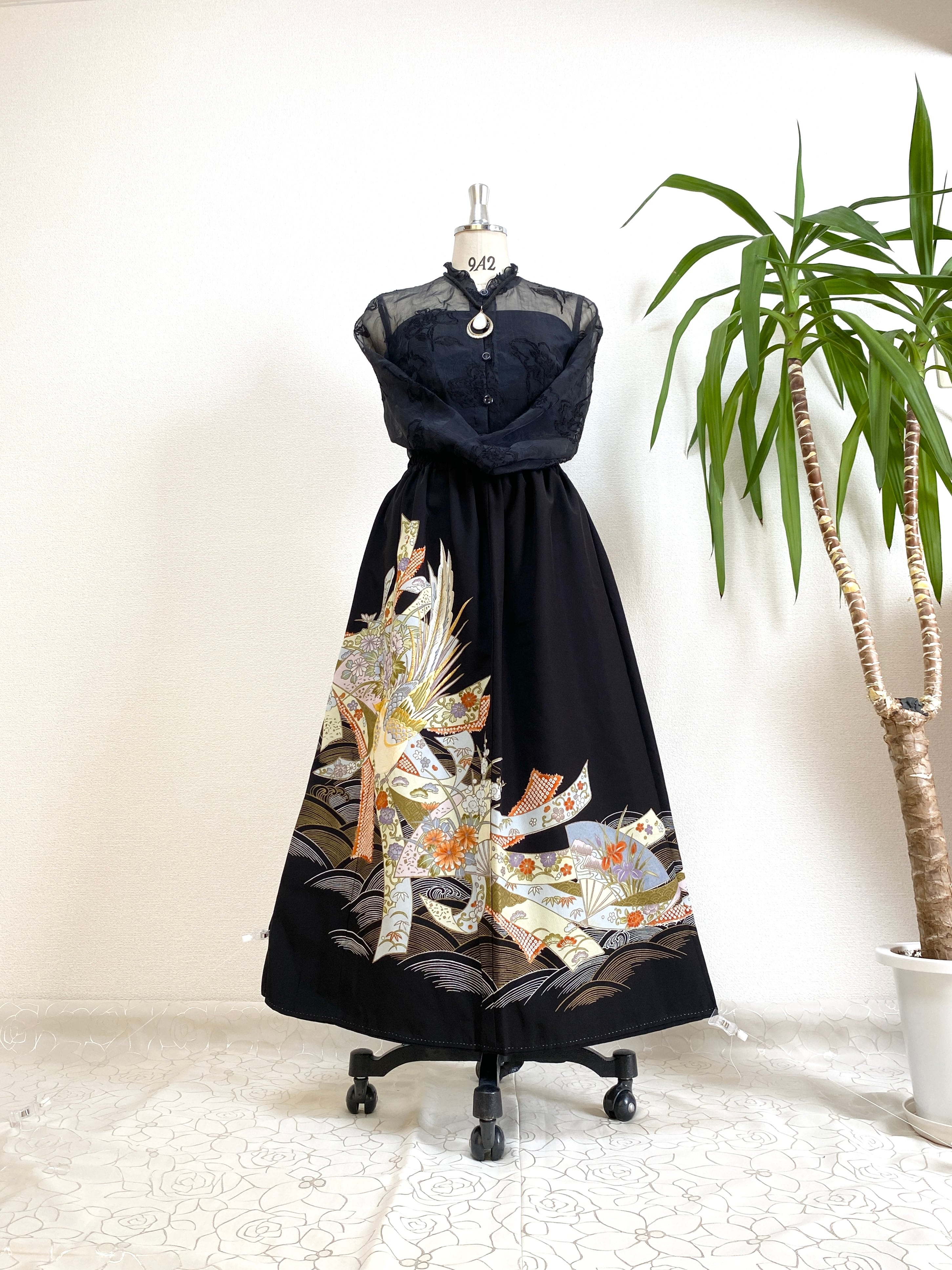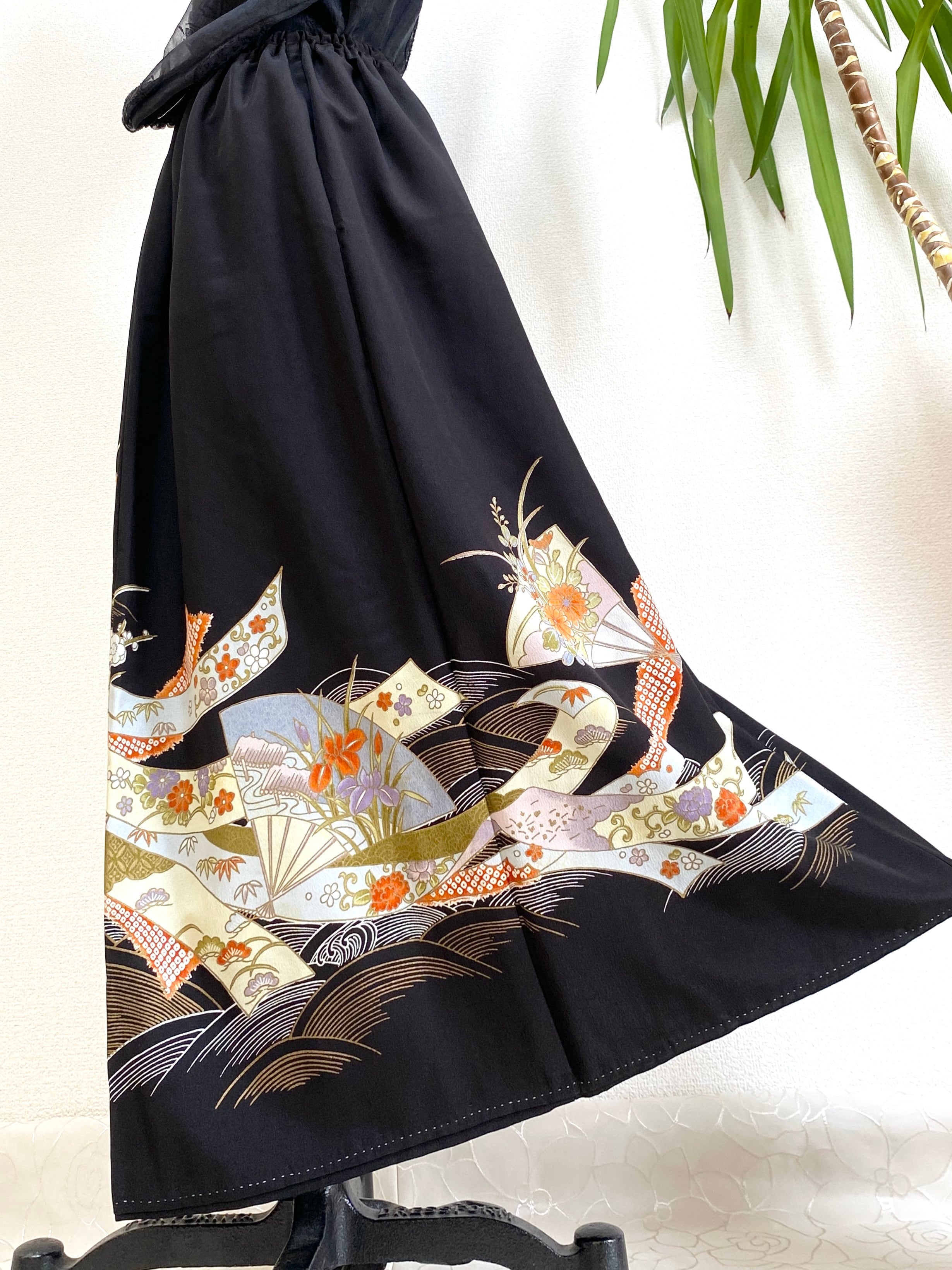大人可愛いセレブ着物スカートフリーサイズ黒留袖着物リメイクウエストゴムロングスカート