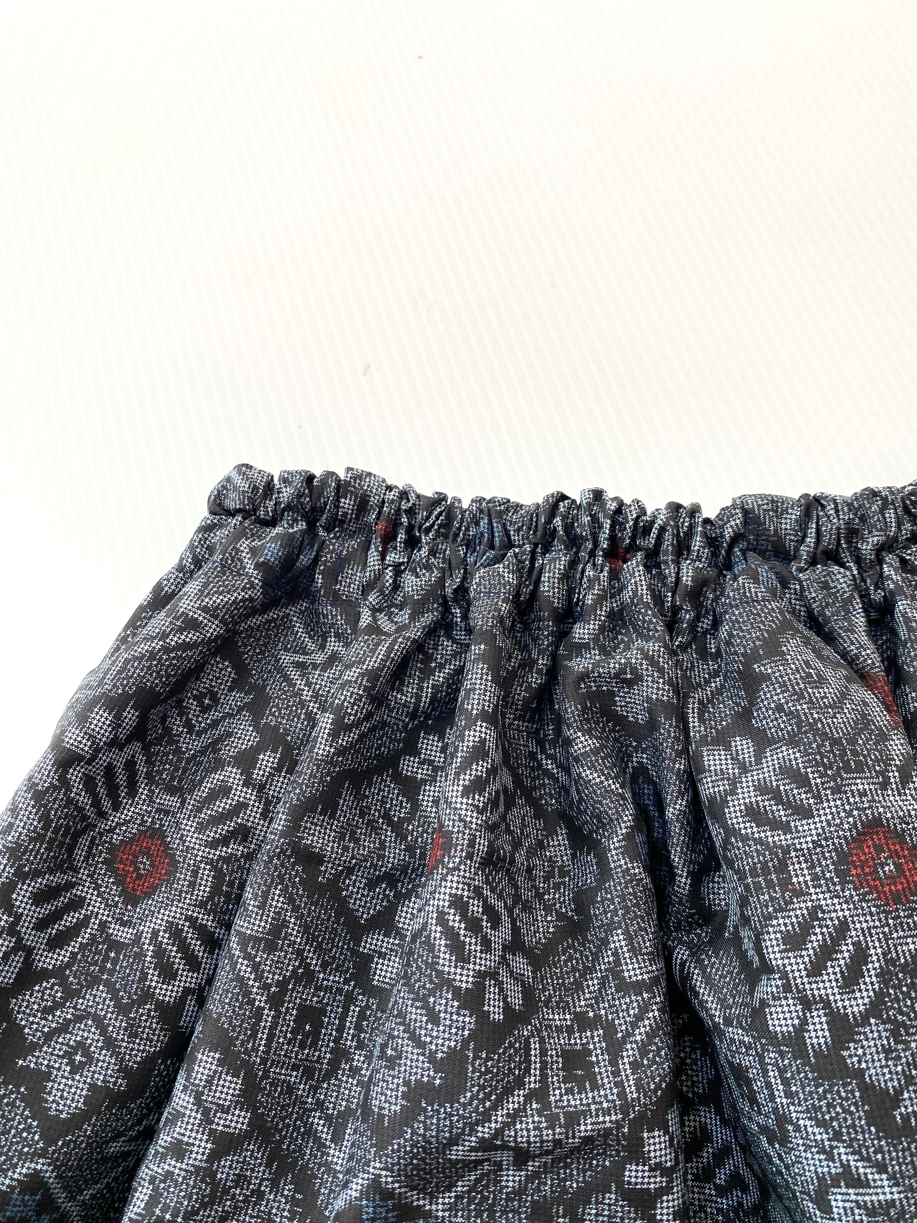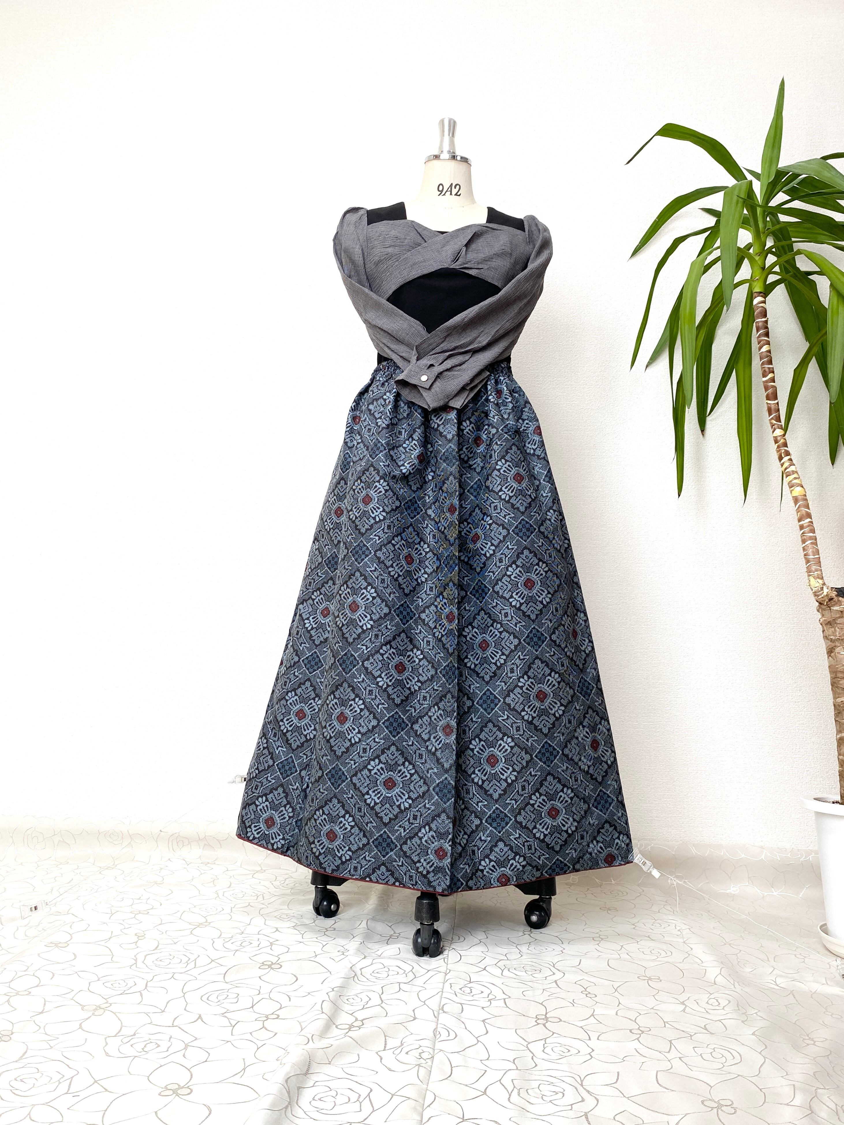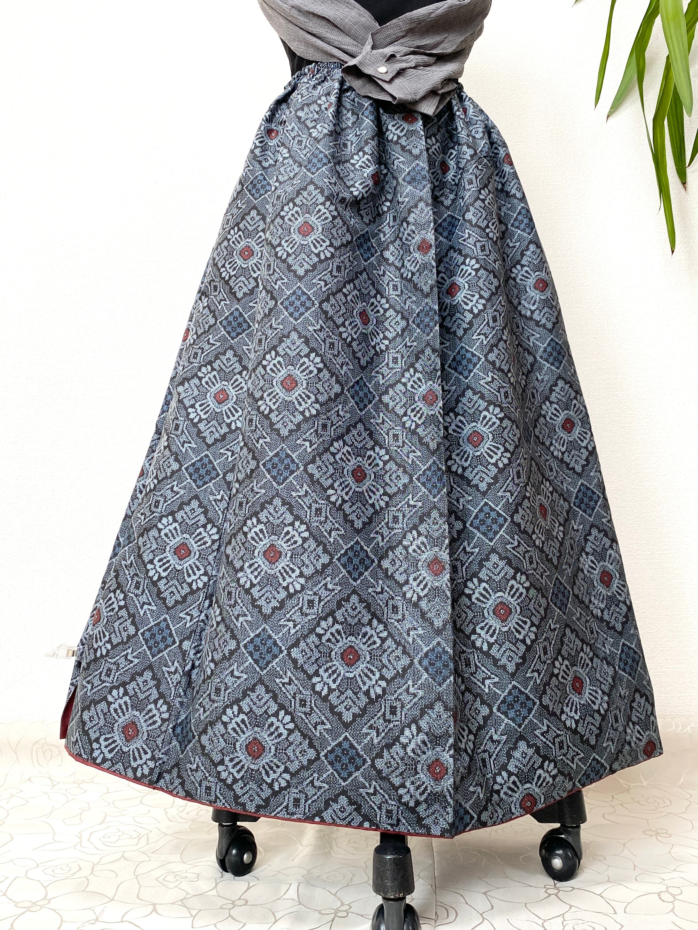 大島紬の着物をリメイクして作製したウエストゴムロングドレススカートフリーサイズです。
