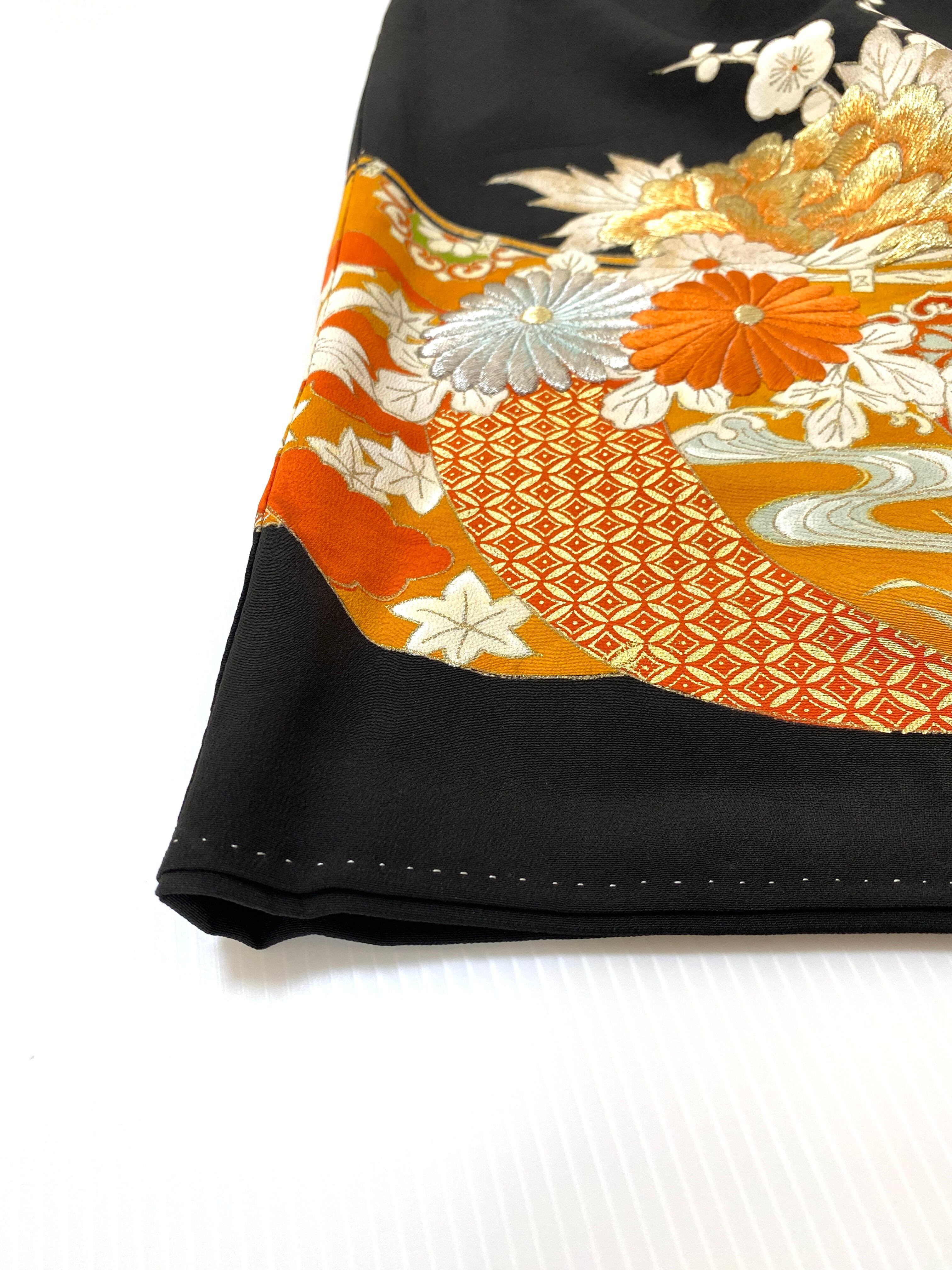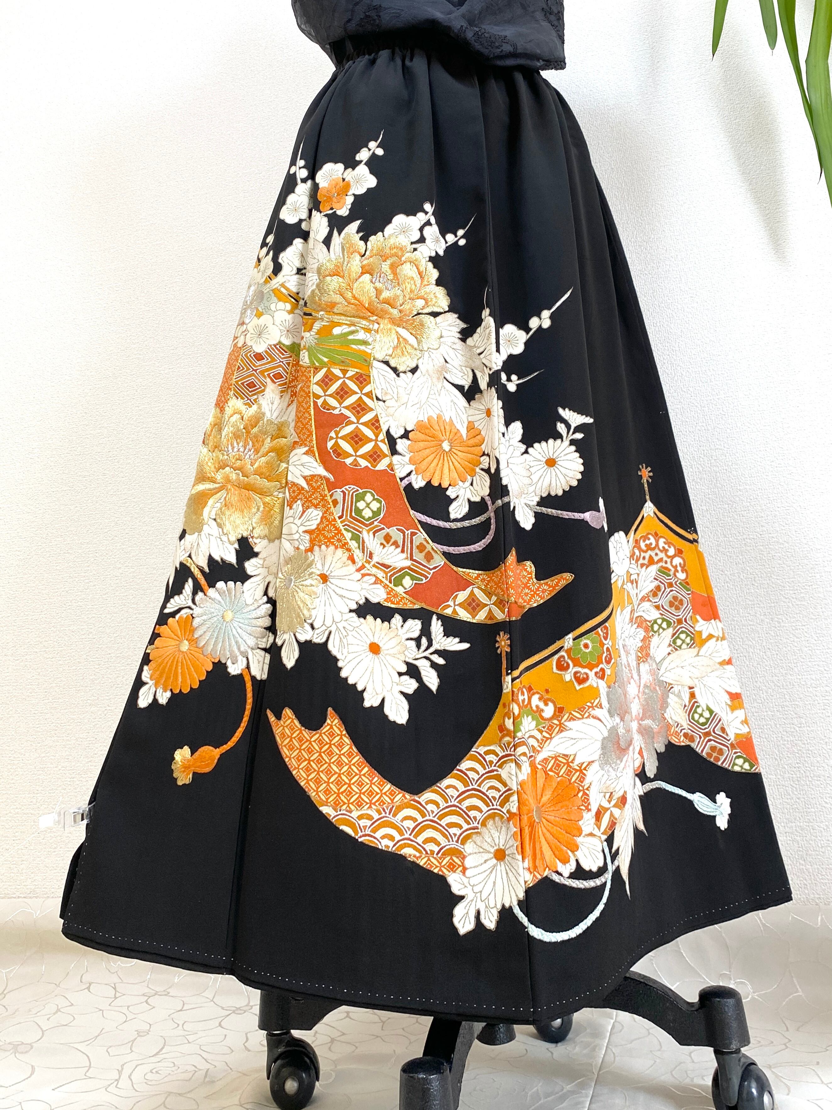 大人可愛いセレブ着物スカートフリーサイズ黒留袖着物リメイクウエストゴムロングスカート