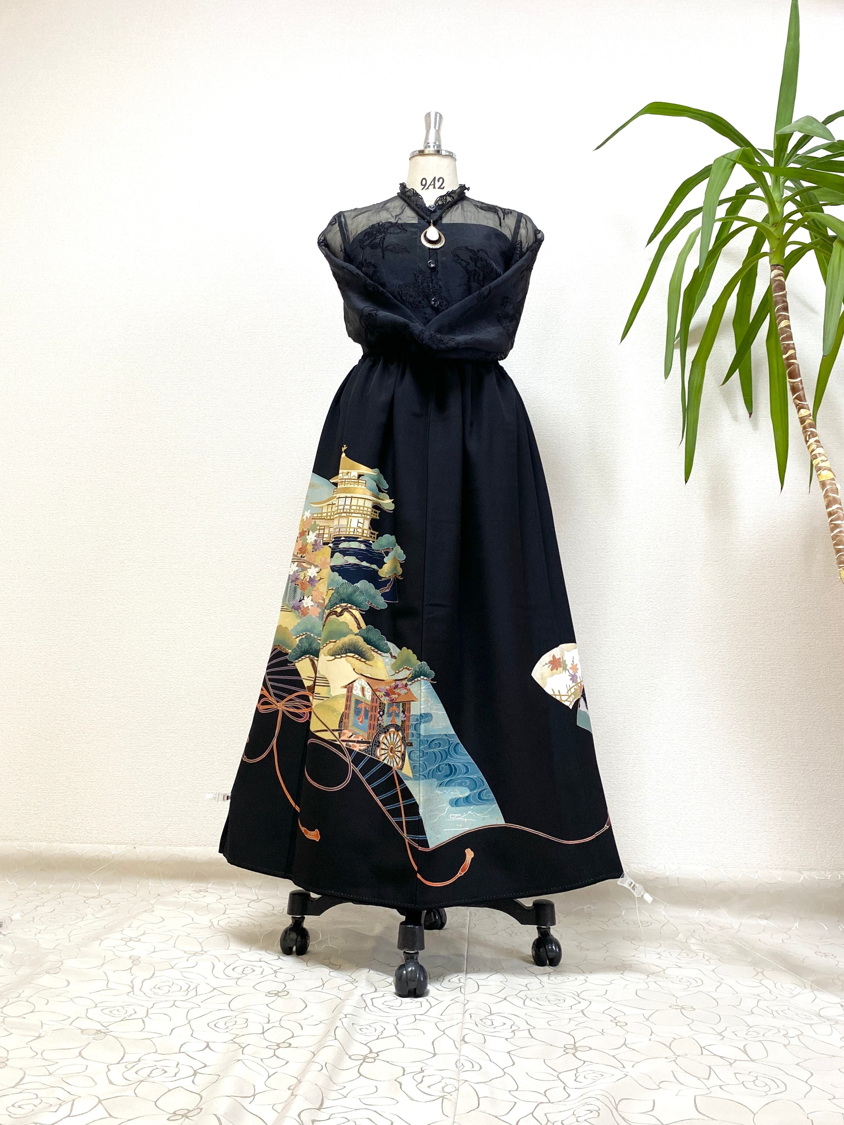 大人可愛いセレブ着物スカートフリーサイズ黒留袖着物リメイクウエストゴムロングスカート