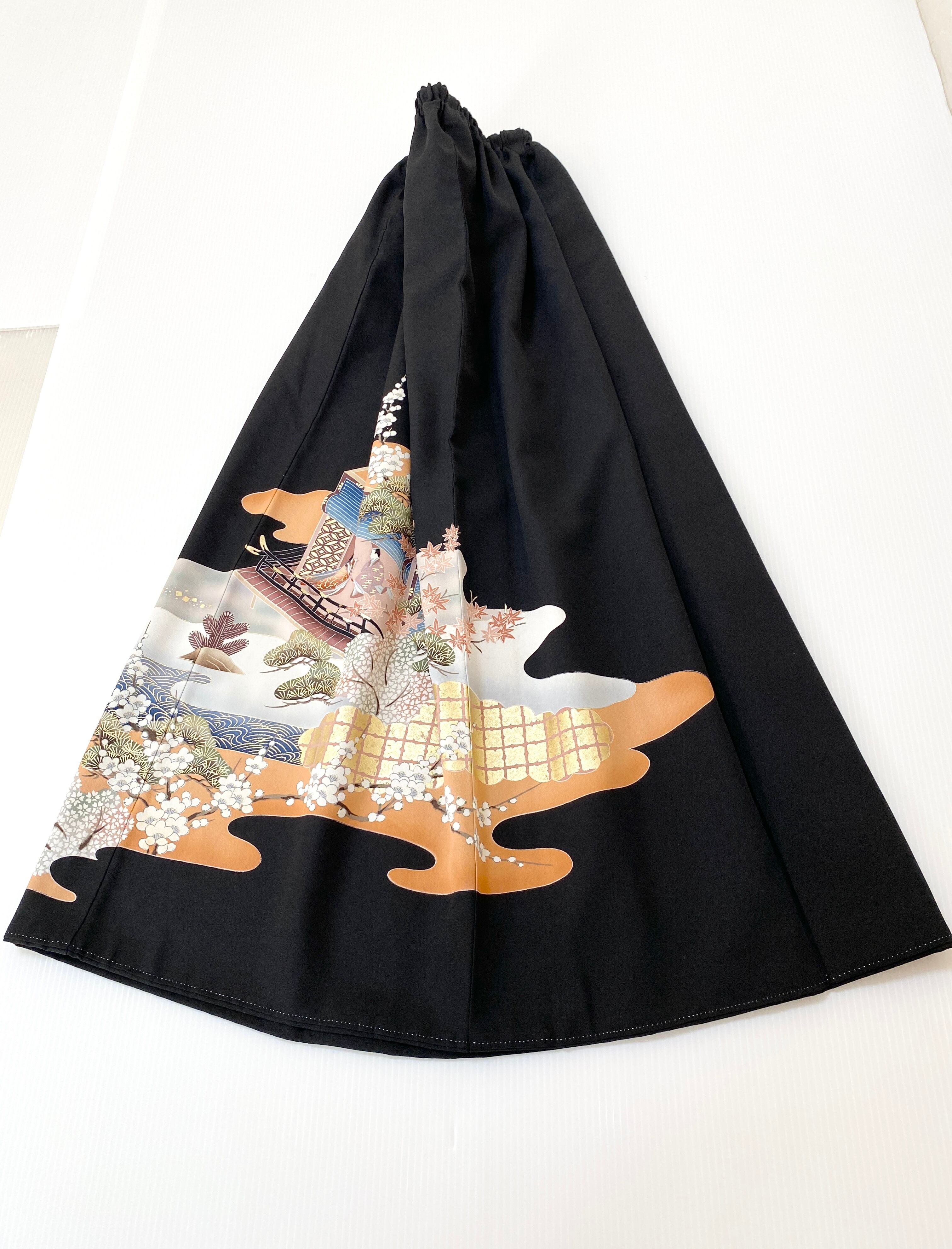 大人可愛いセレブ着物スカートフリーサイズ黒留袖着物リメイクウエストゴムロングスカート