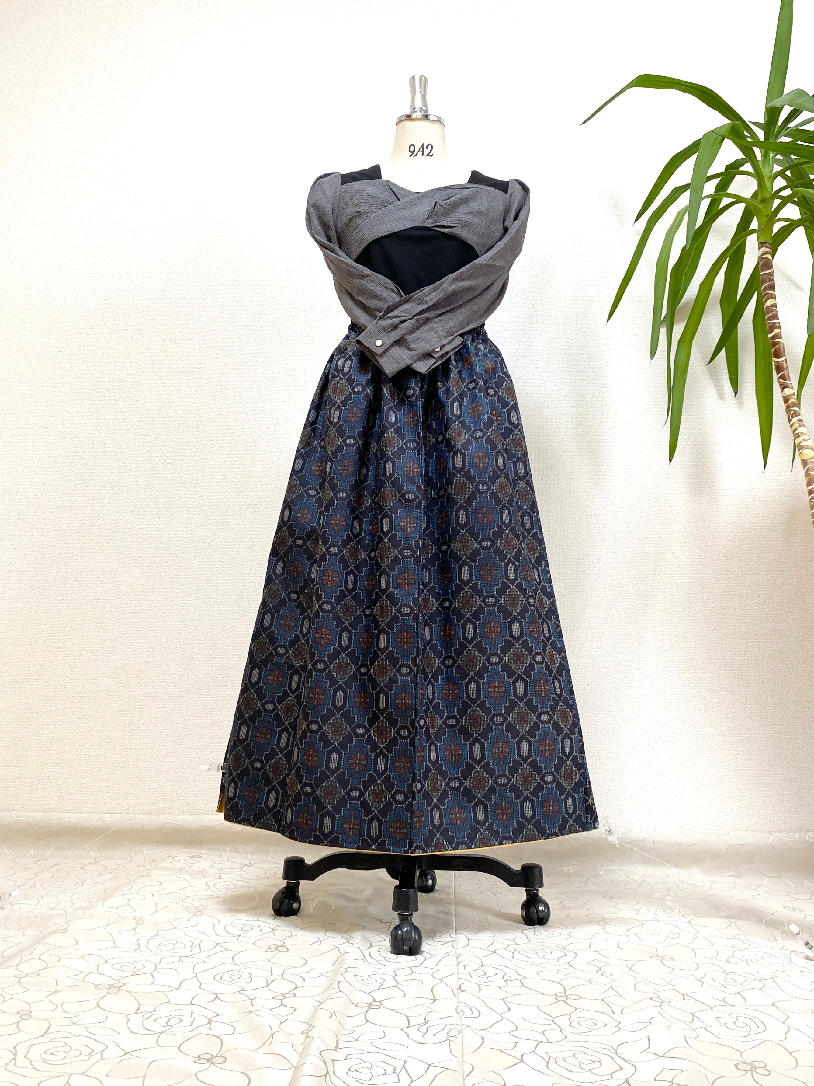 大島の着物をリメイクして作製したウエストゴムロングドレススカートフリーサイズです。