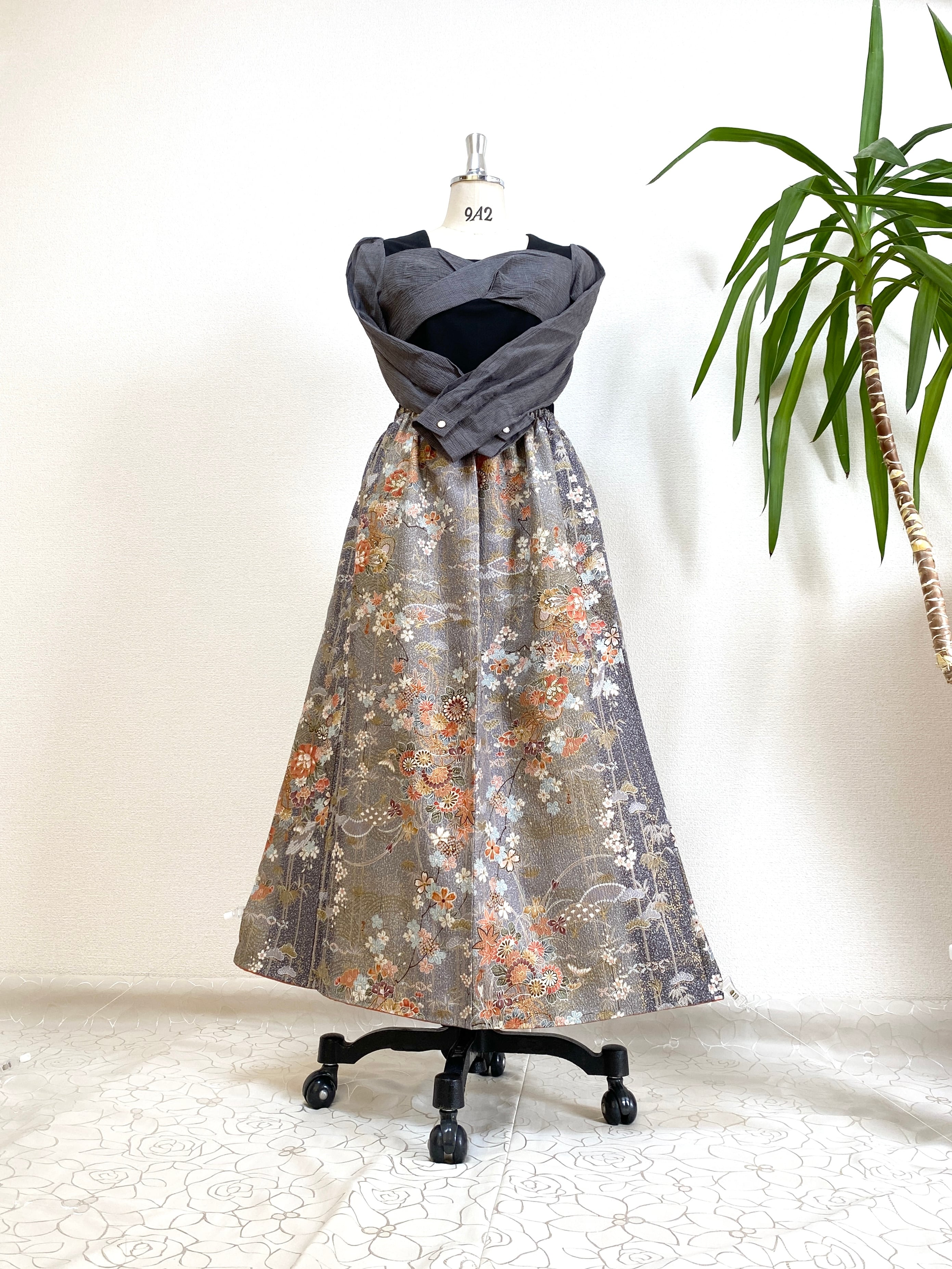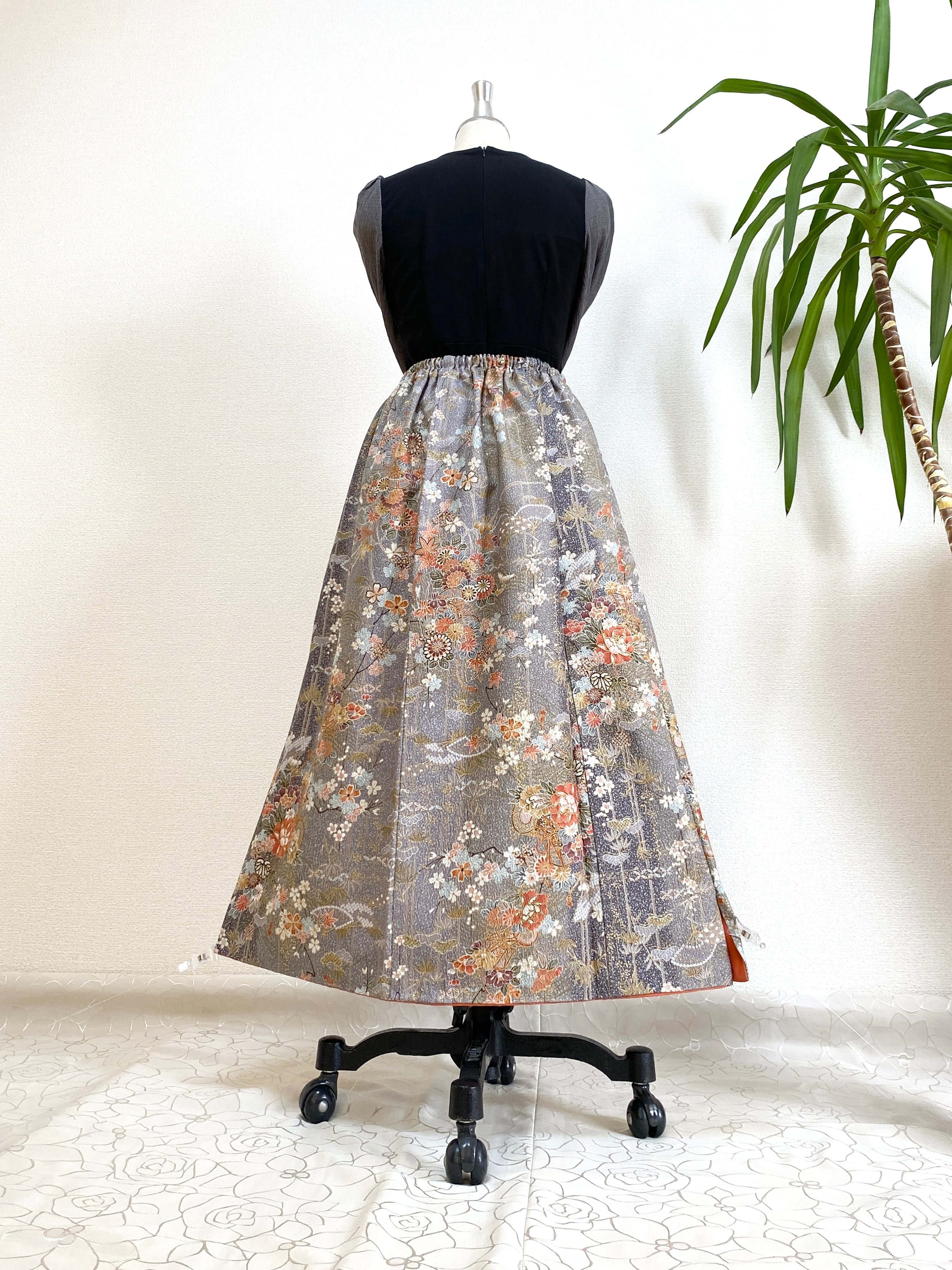 着物をリメイクして作製したウエストゴムロングドレススカートフリーサイズです。