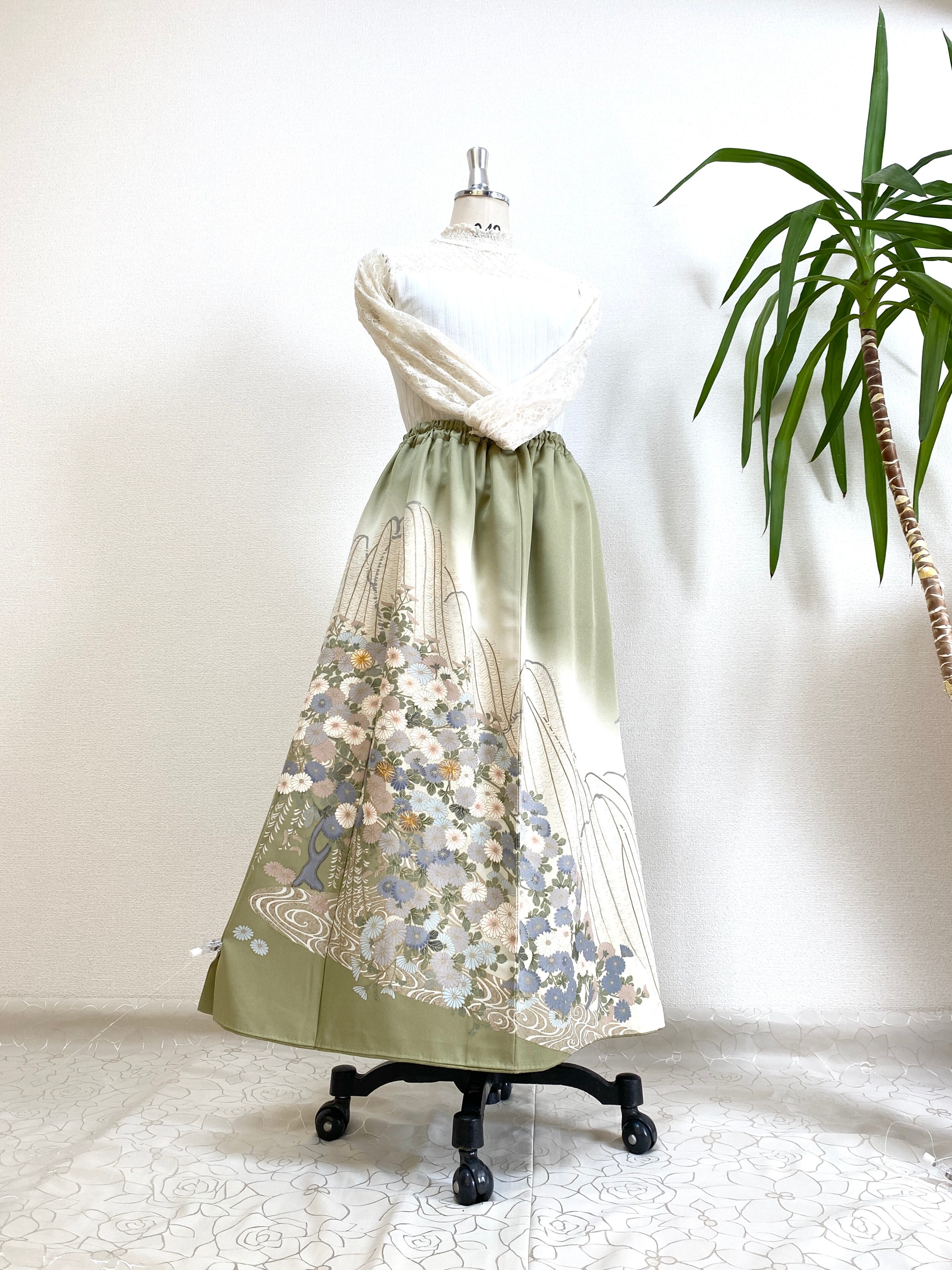 着物をリメイクして作製したウエストゴムロングドレススカートフリーサイズです。