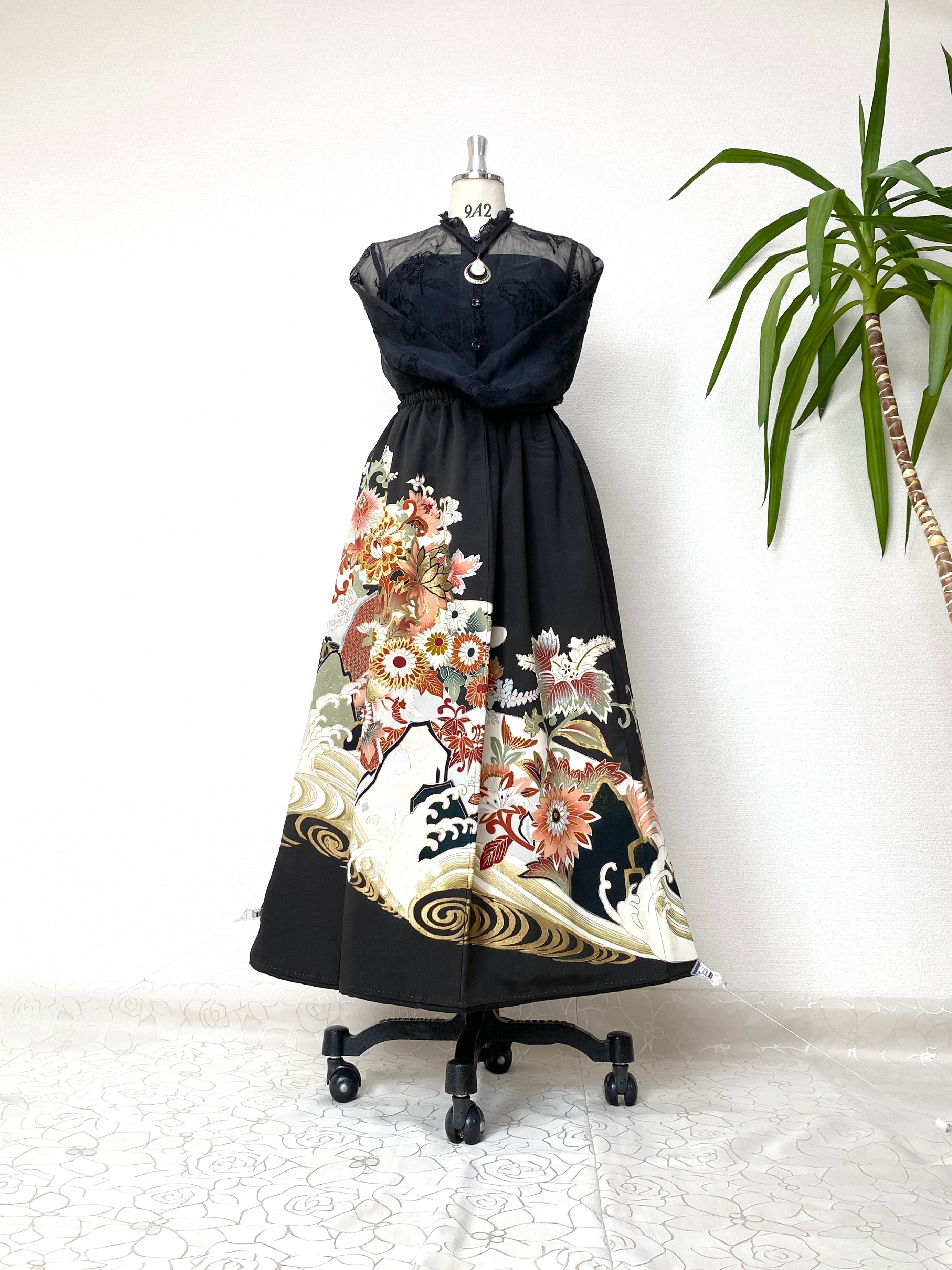 大人可愛いセレブ着物スカートフリーサイズ黒留袖着物リメイクウエストゴムロングスカート