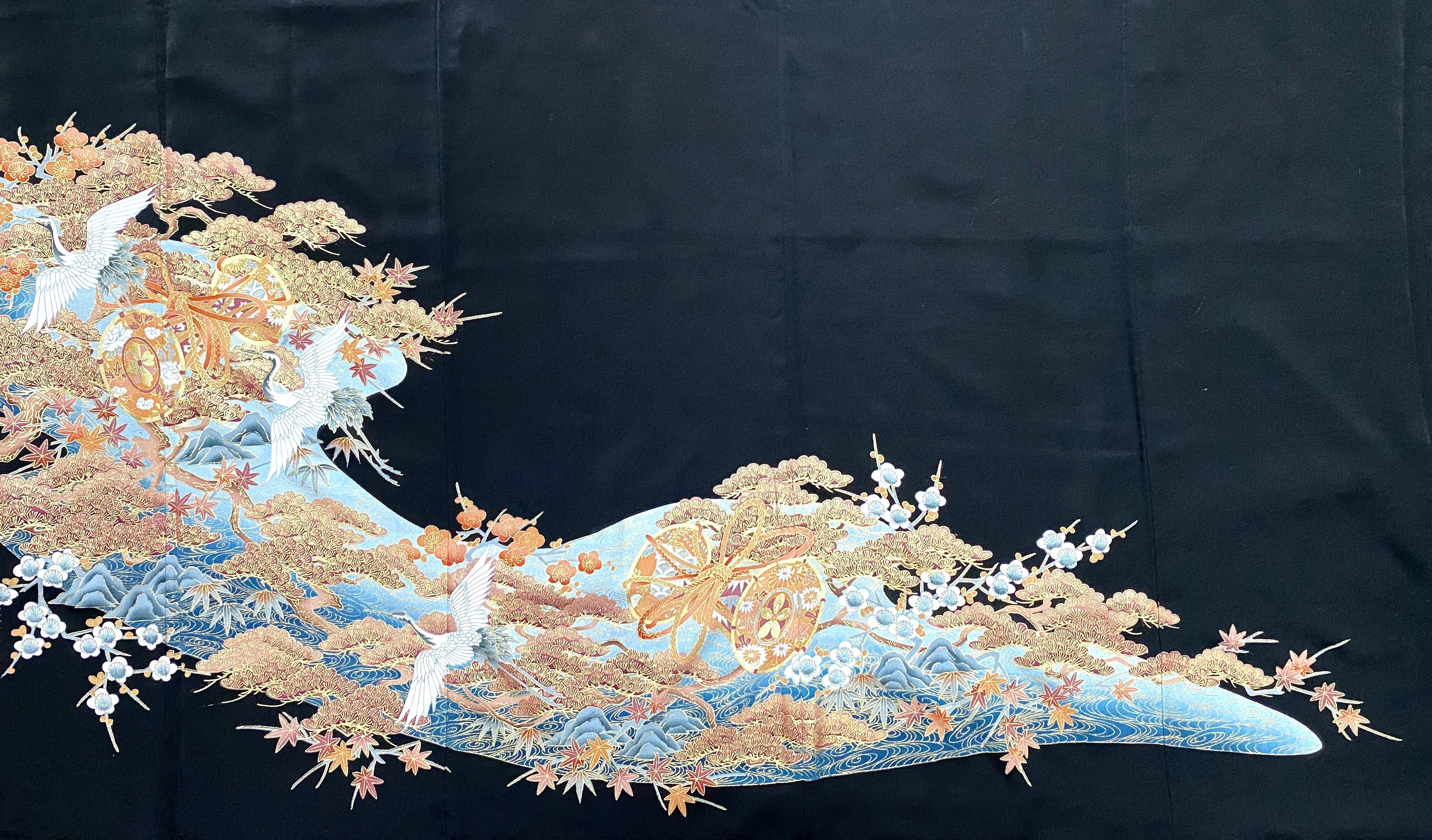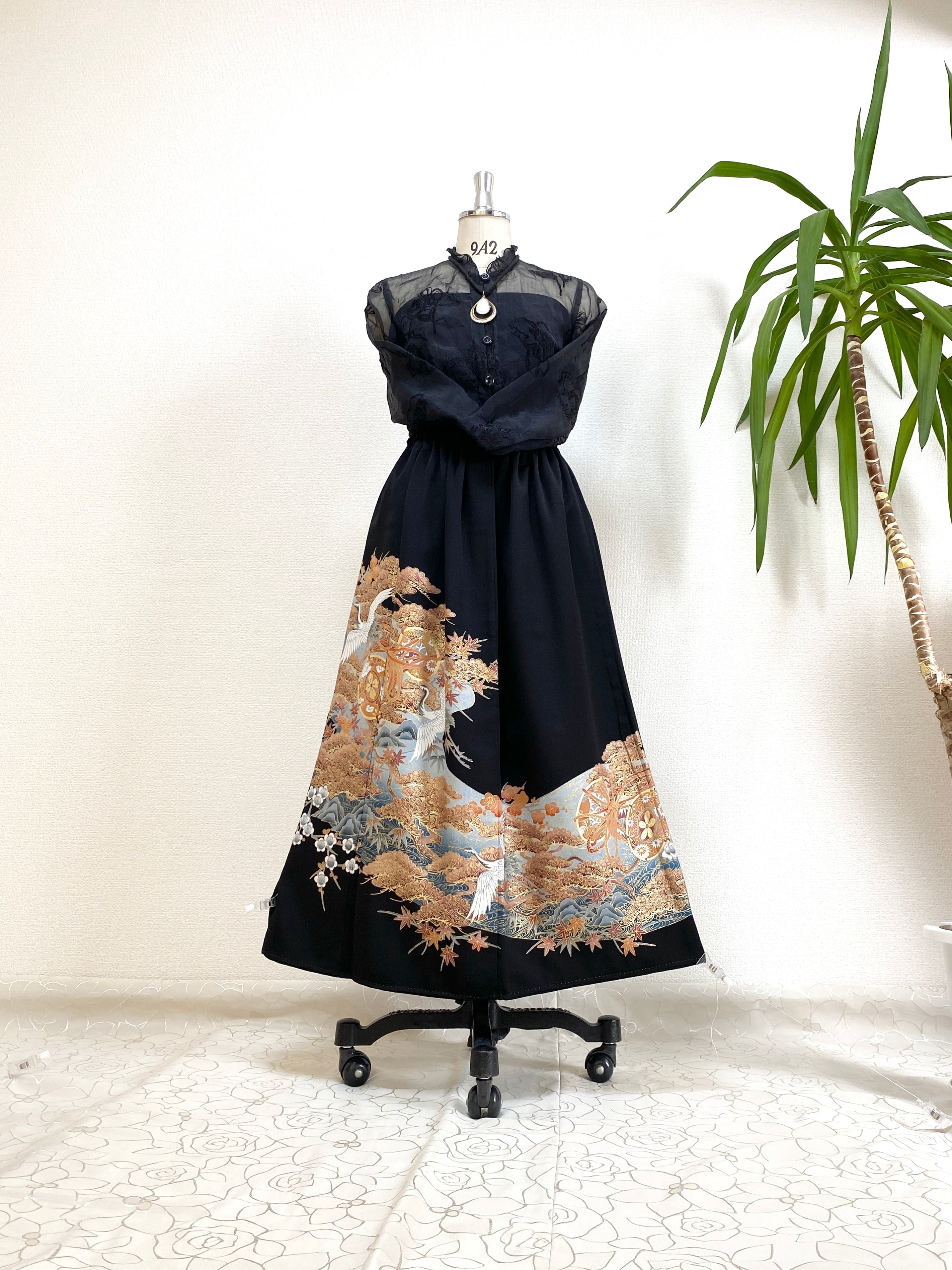 大人可愛いセレブ着物スカートフリーサイズ黒留袖着物リメイクウエストゴムロングスカート