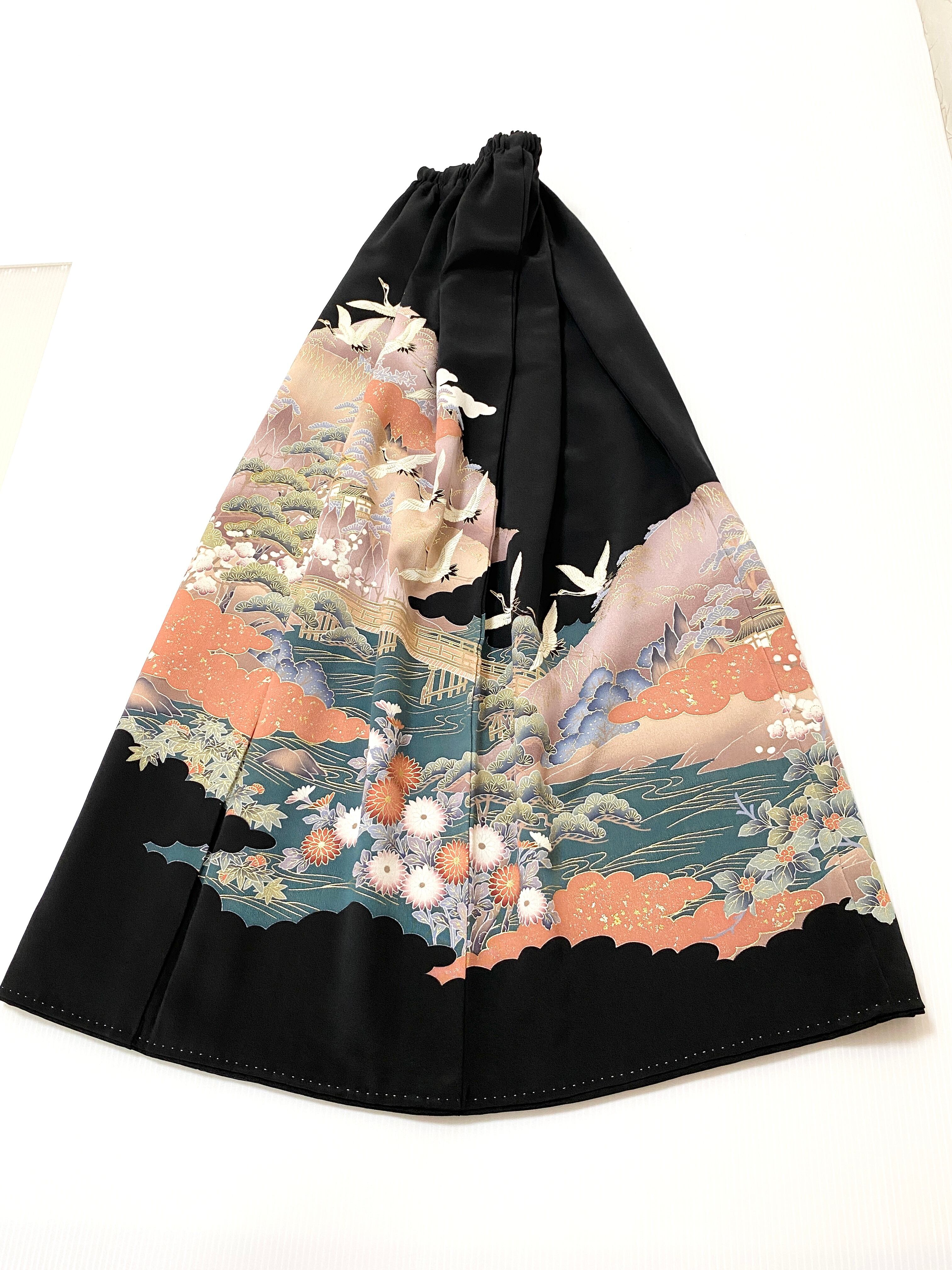 大人可愛いセレブ着物スカートフリーサイズ黒留袖着物リメイクウエストゴムロングスカート