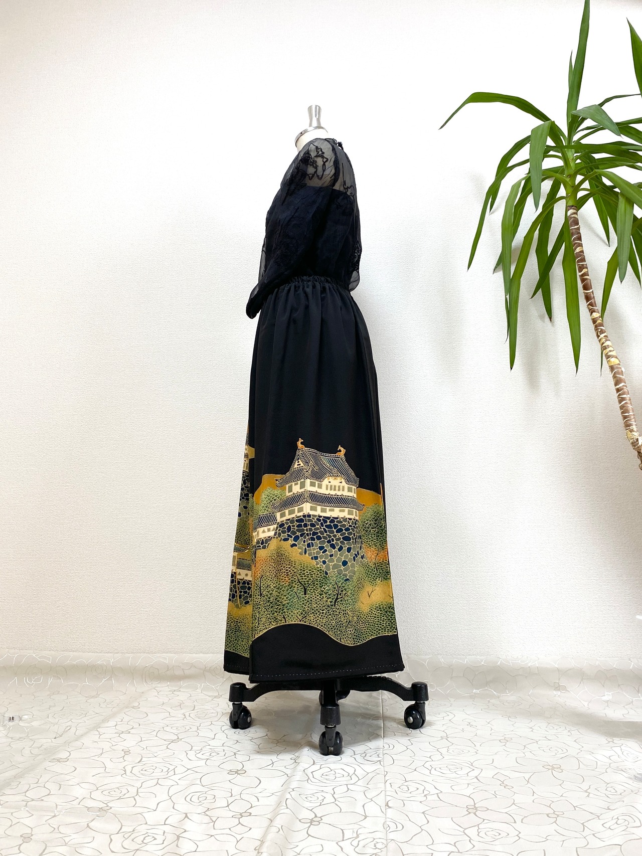 黒留袖着物をリメイクして作製したウエストゴムロングドレススカートフリーサイズです