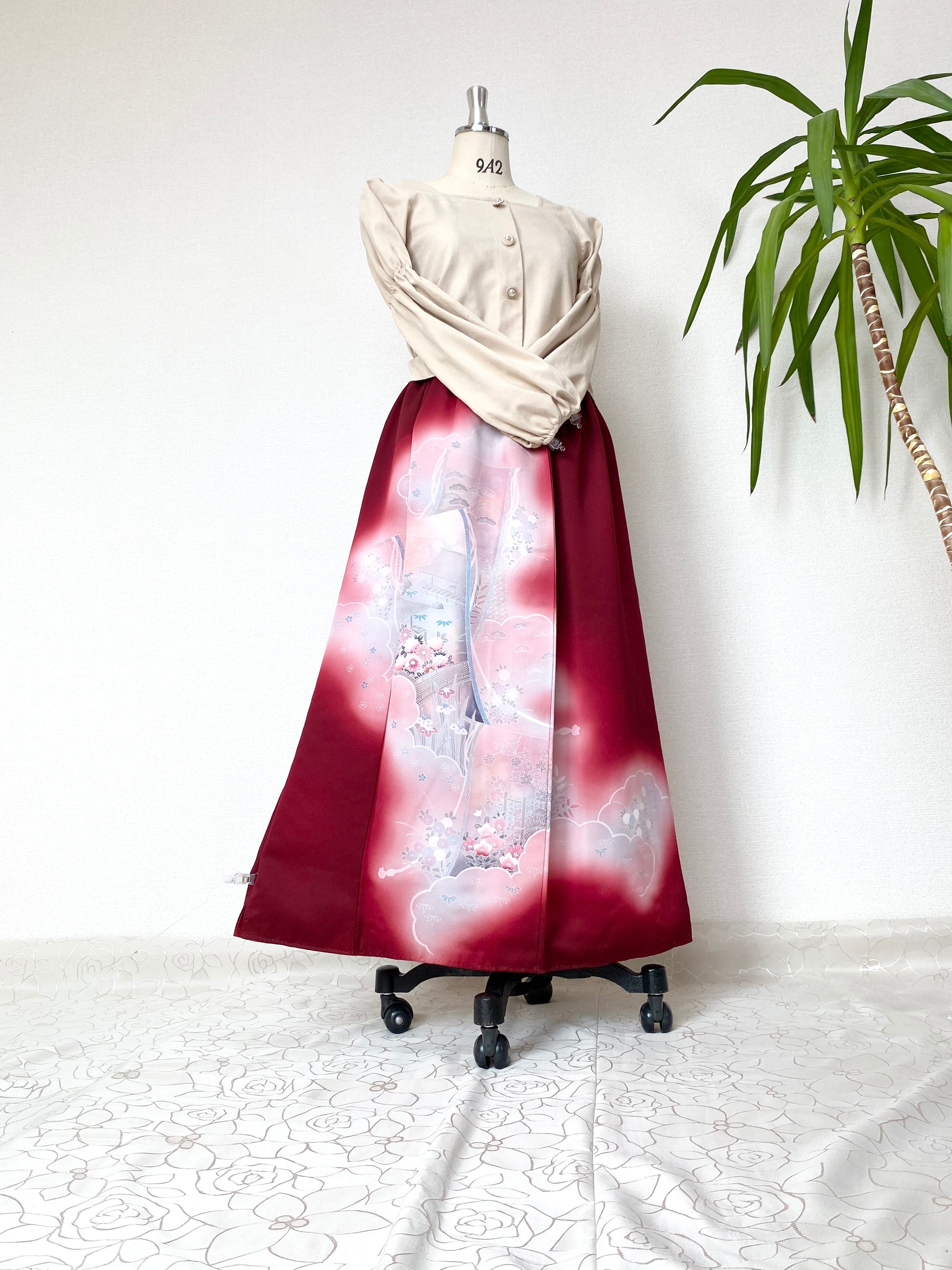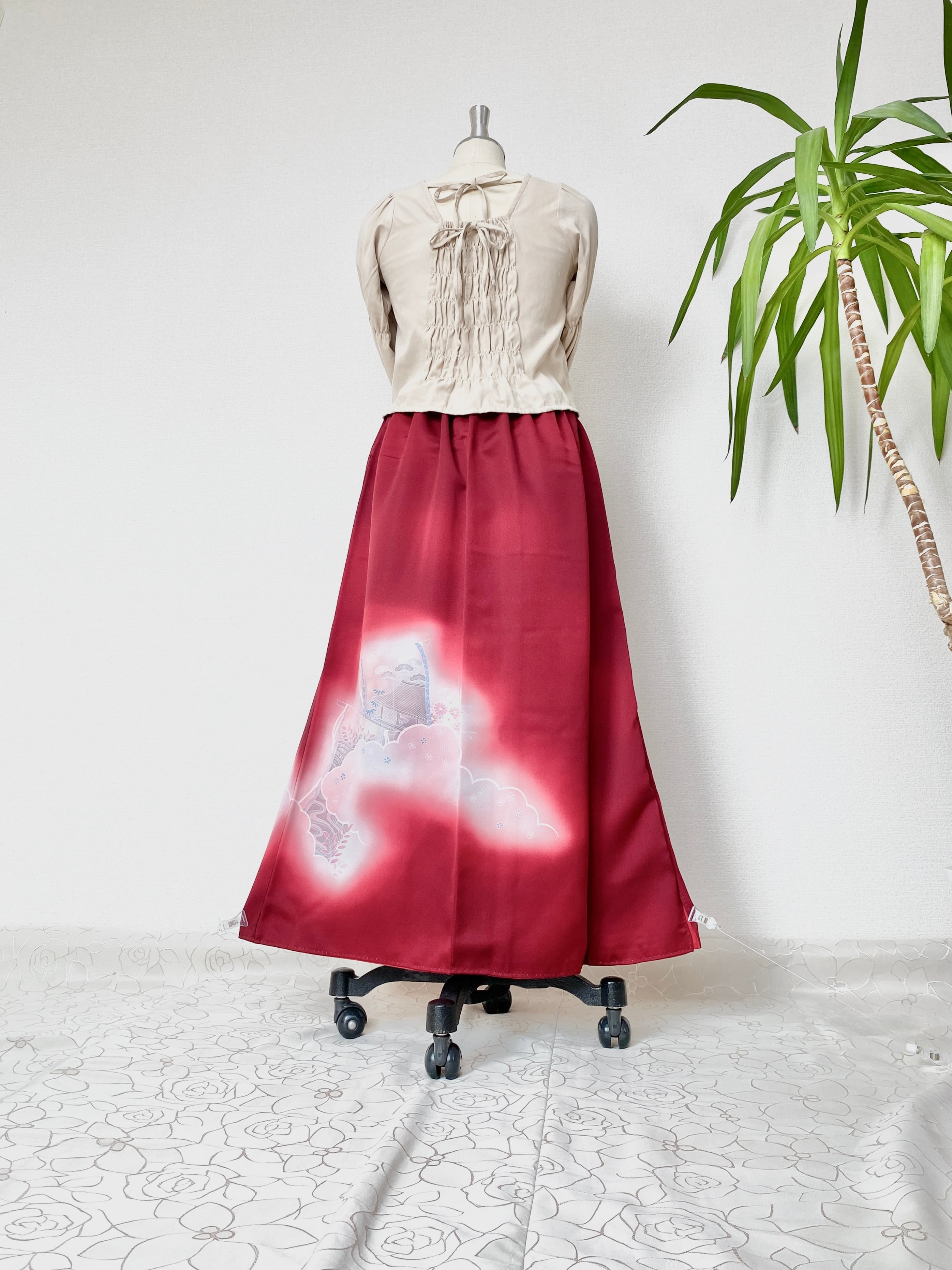 着物をリメイクして作製したウエストゴムロングドレススカートフリーサイズです