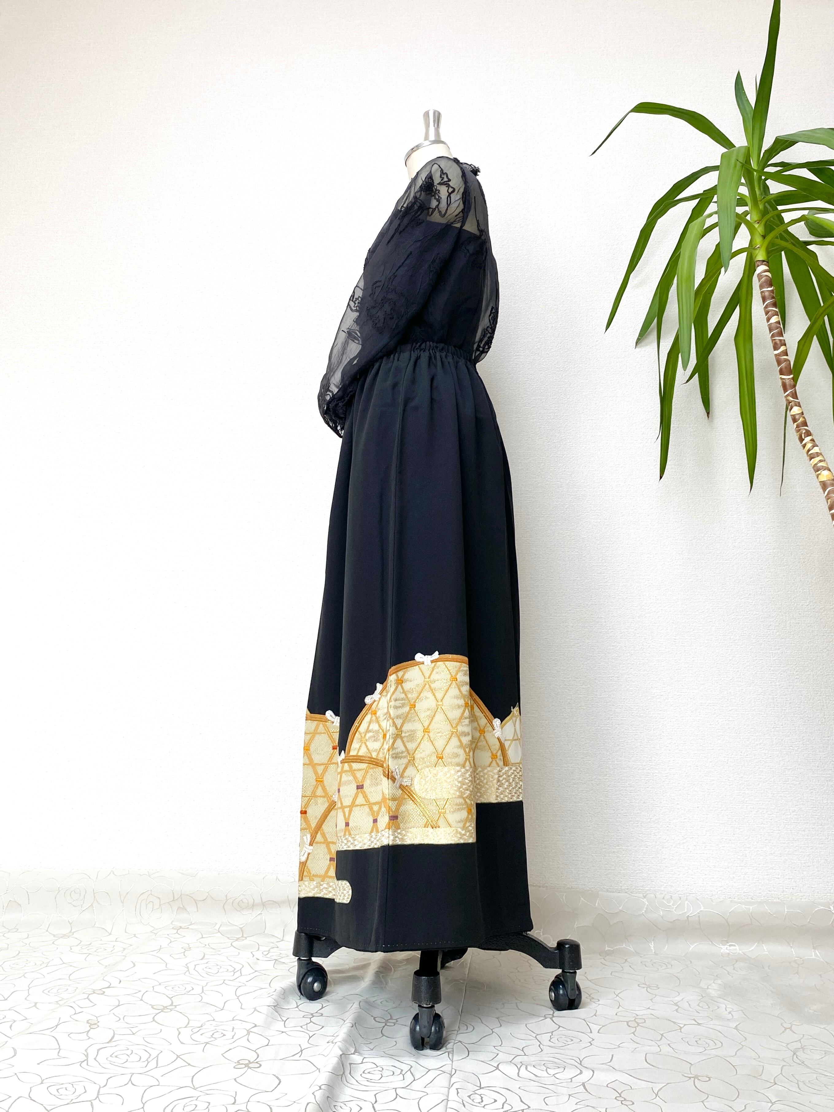 黒留袖着物をリメイクして作製したウエストゴムロングドレススカートフリーサイズです