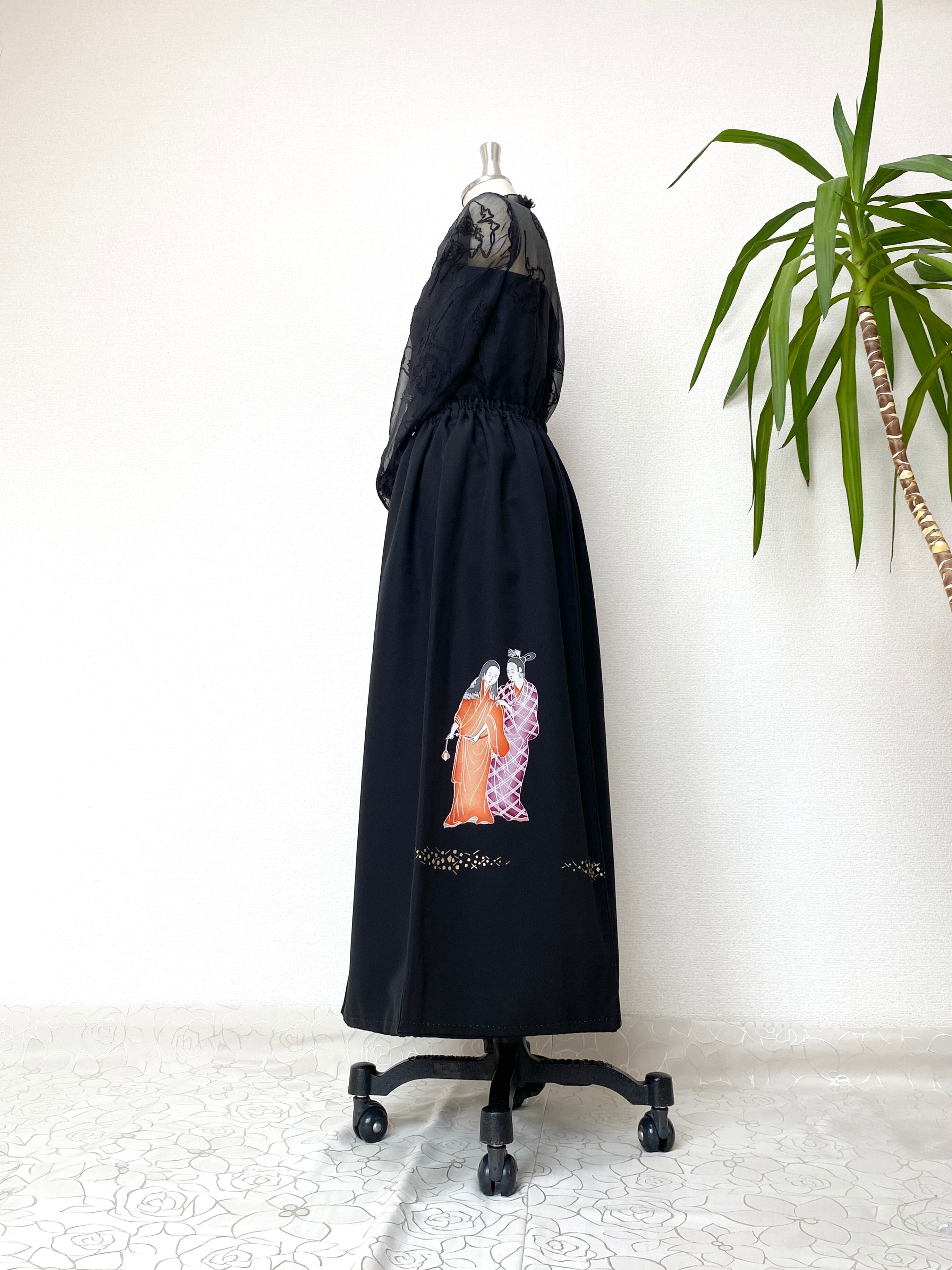 黒留袖着物をリメイクして作製したウエストゴムロングドレススカートフリーサイズです