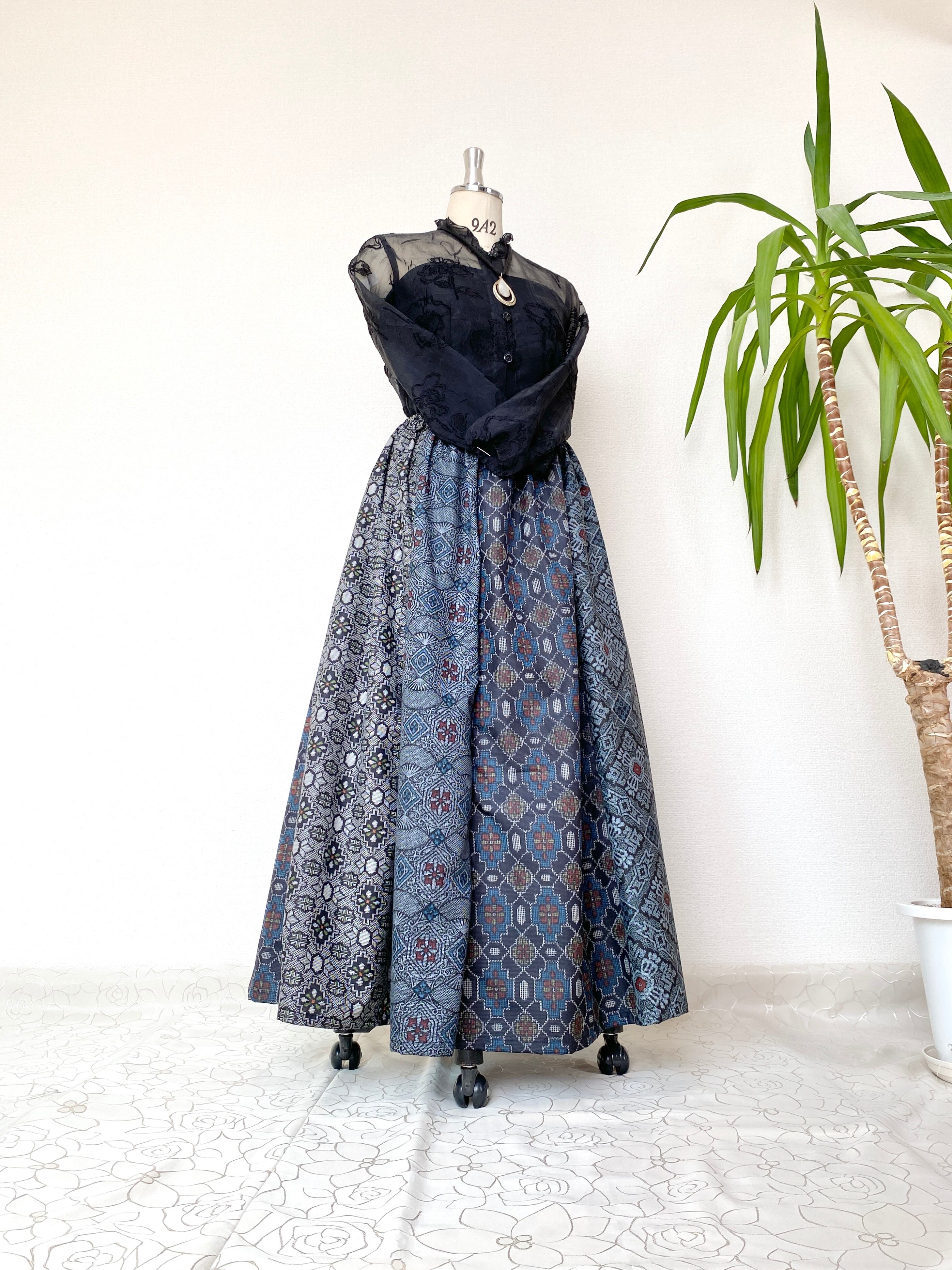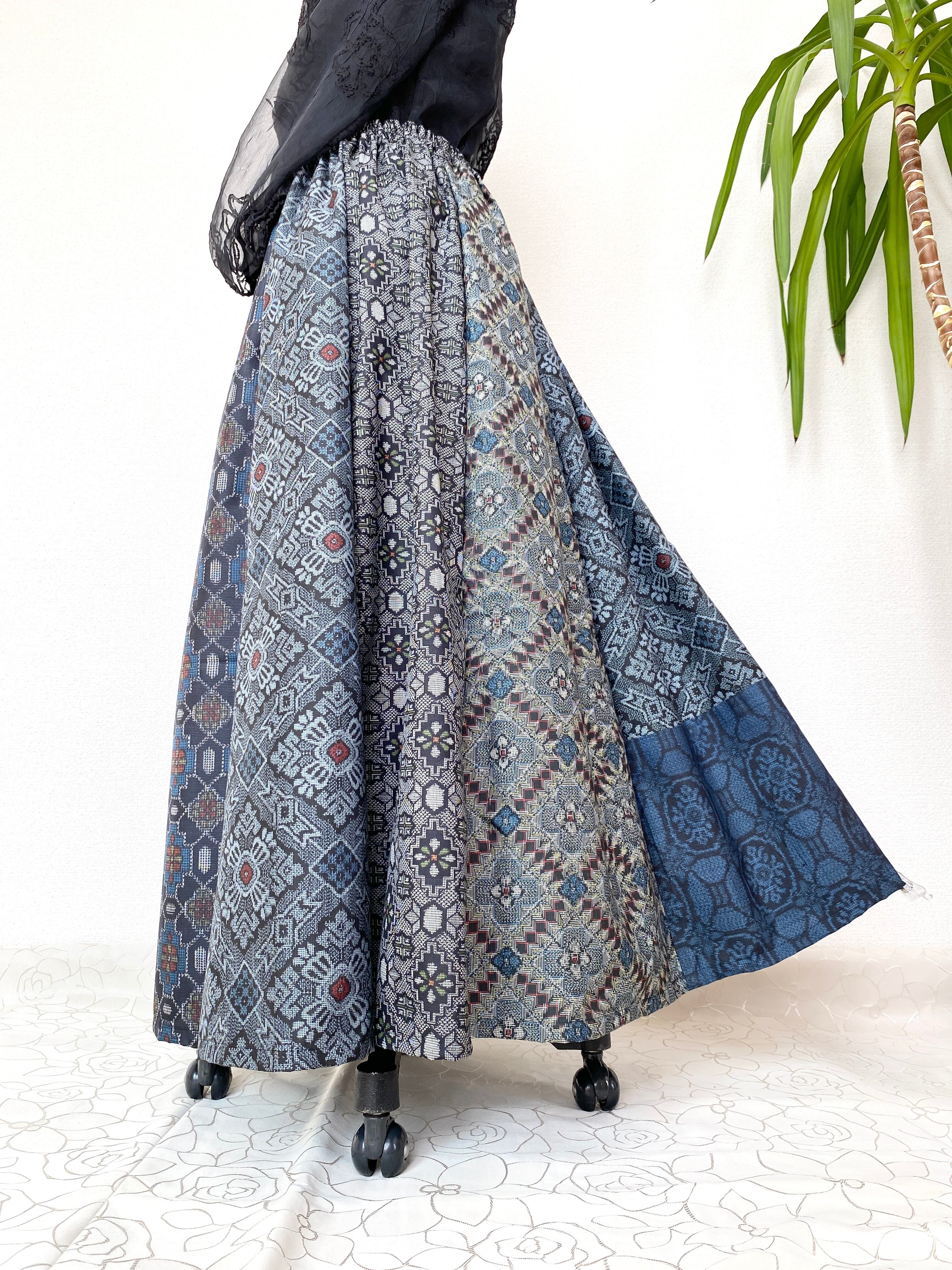 大島の着物をリメイクして作製したウエストゴムロングドレススカートフリーサイズです