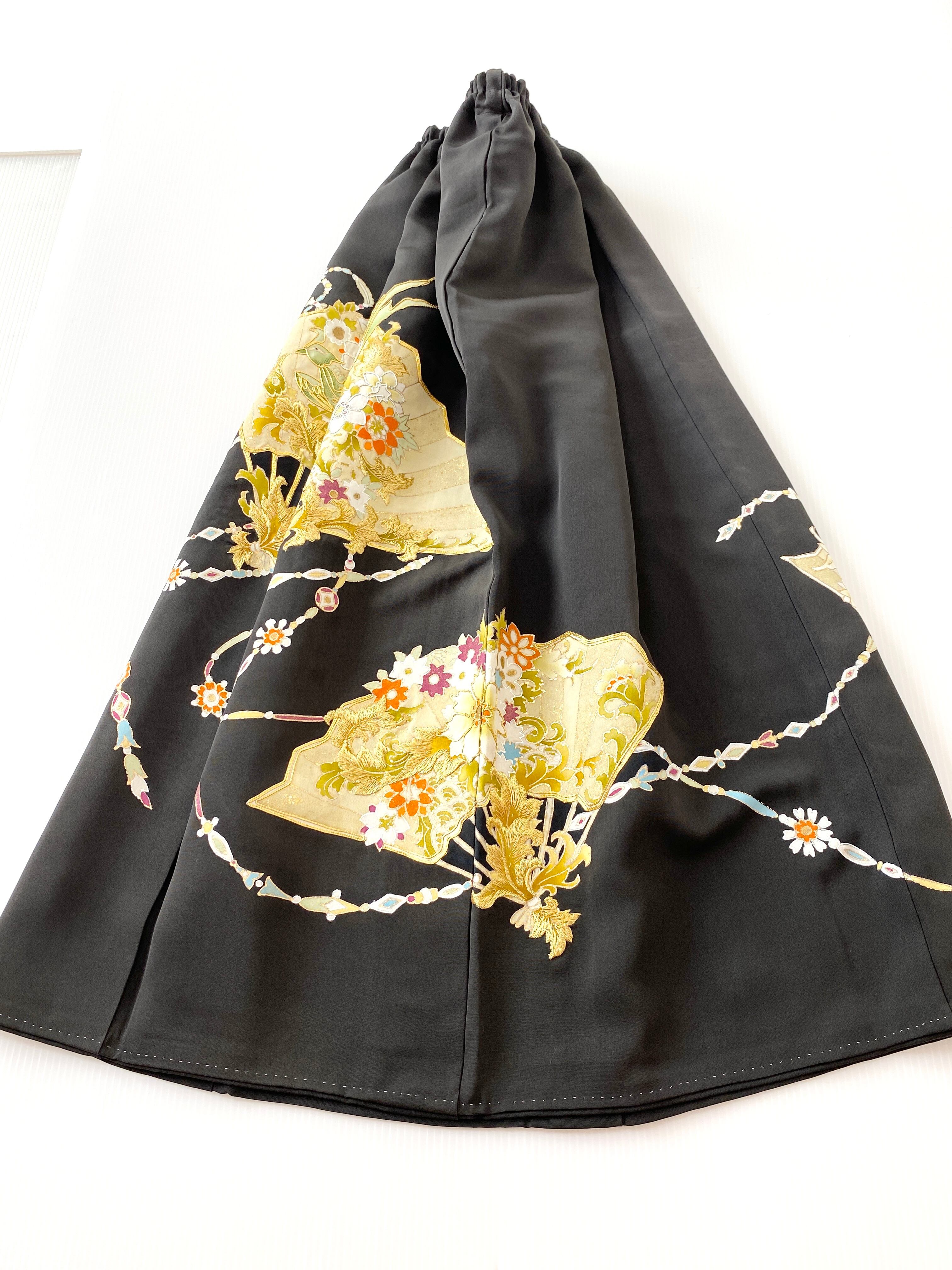 大人可愛いセレブ着物スカートフリーサイズ黒留袖着物リメイクウエストゴムロングスカート