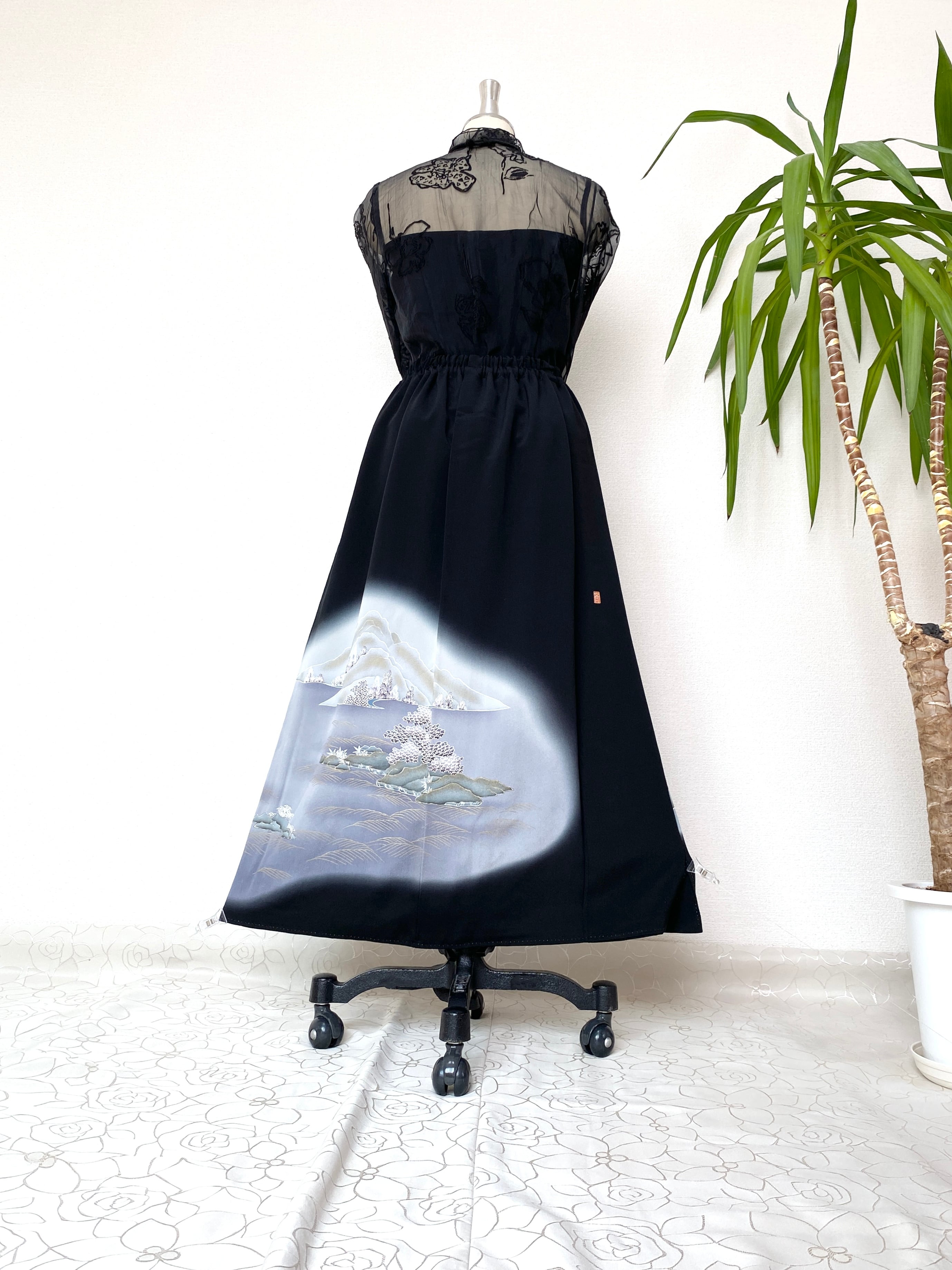 黒留袖着物をリメイクして作製したウエストゴムロングドレススカートフリーサイズです