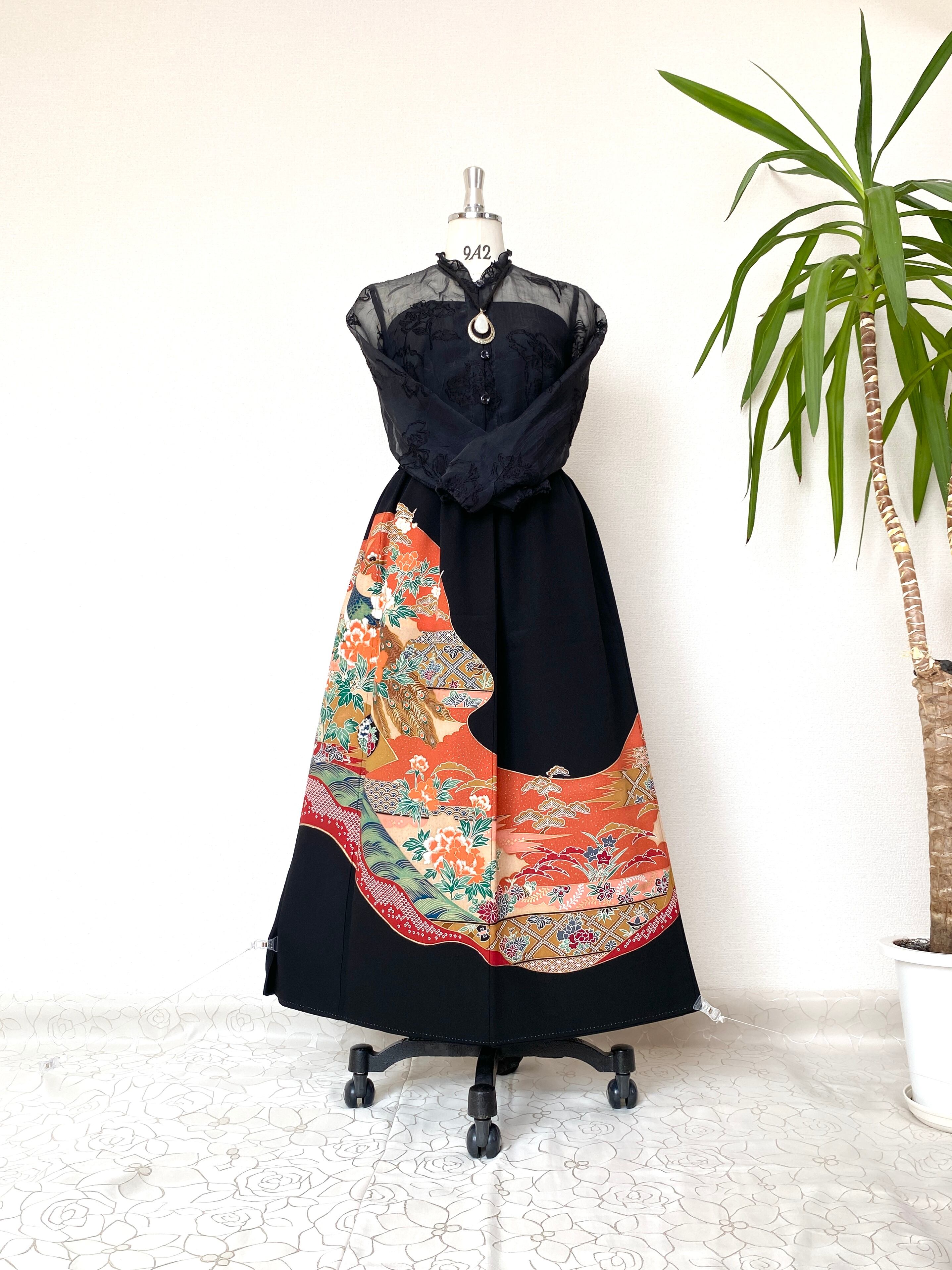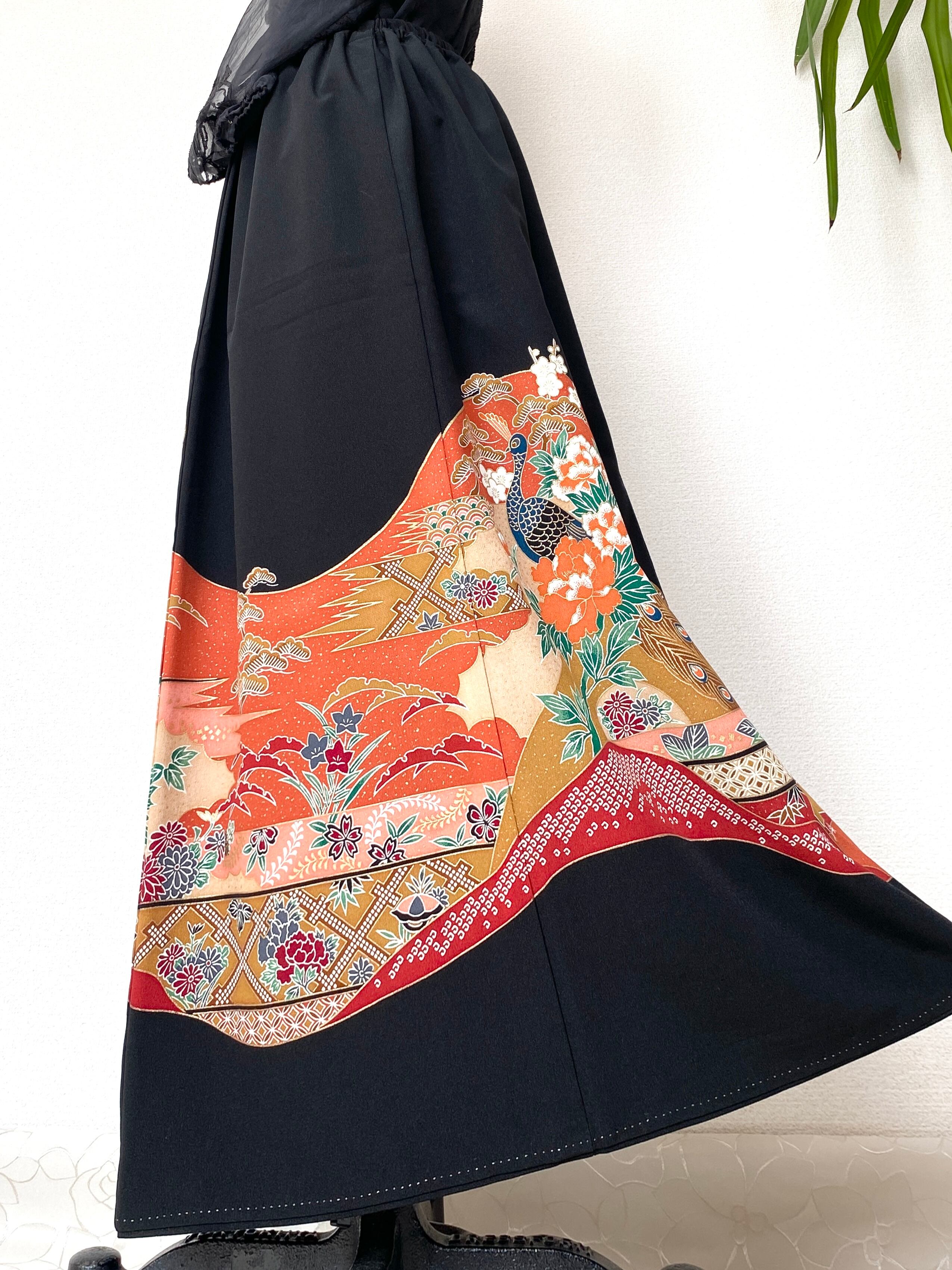 大人可愛いセレブ着物スカートフリーサイズ黒留袖着物リメイクウエストゴムロングスカート