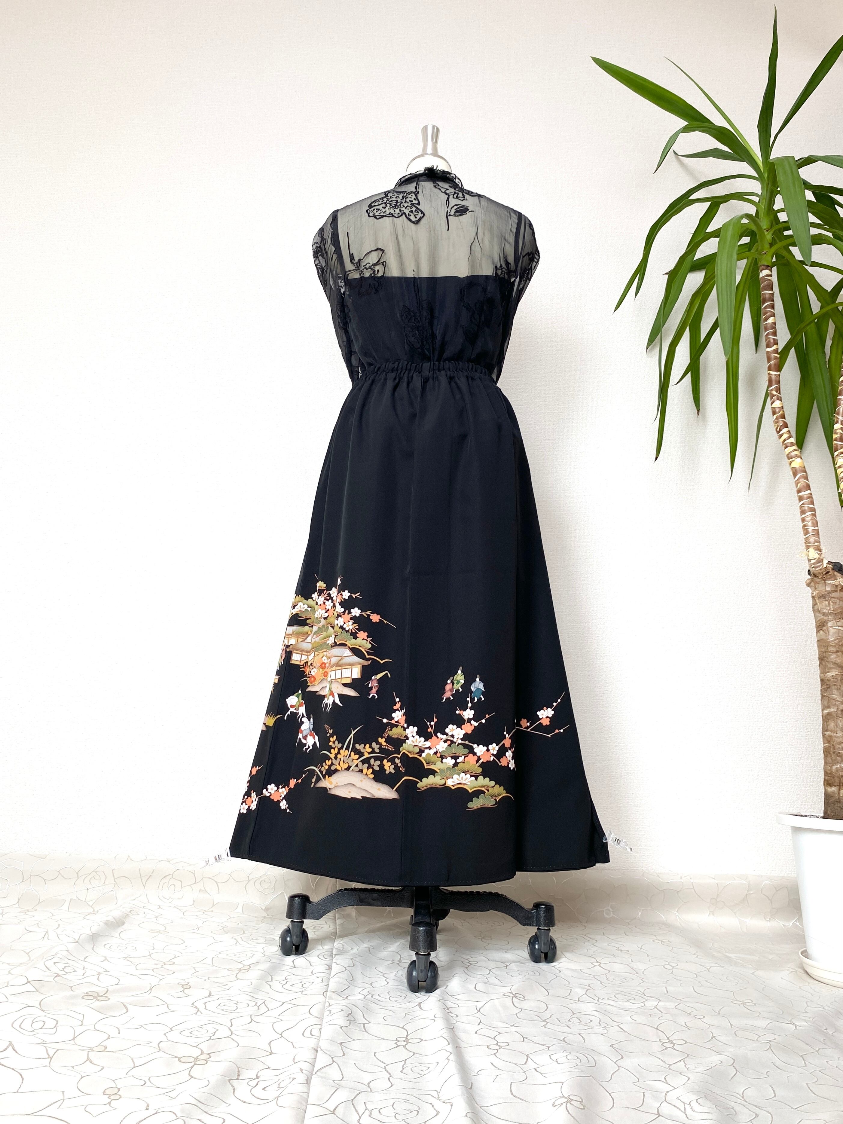 黒留袖着物をリメイクして作製したウエストゴムロングドレススカートフリーサイズです