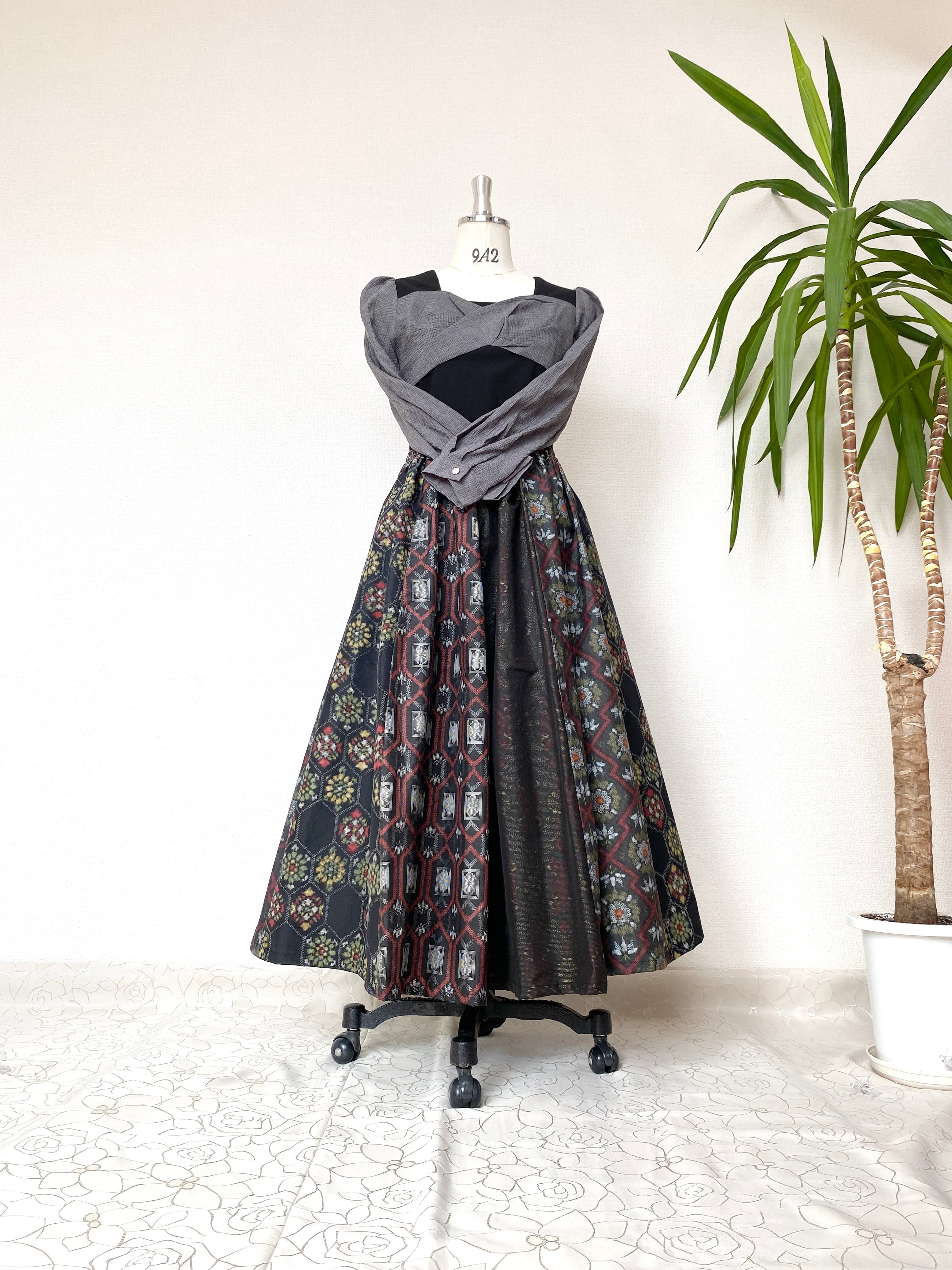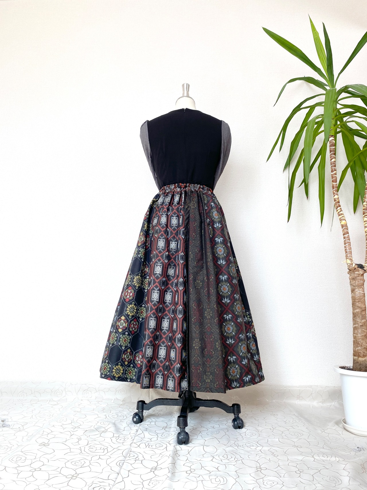 大島の着物をリメイクして作製したウエストゴムロングドレススカートフリーサイズです