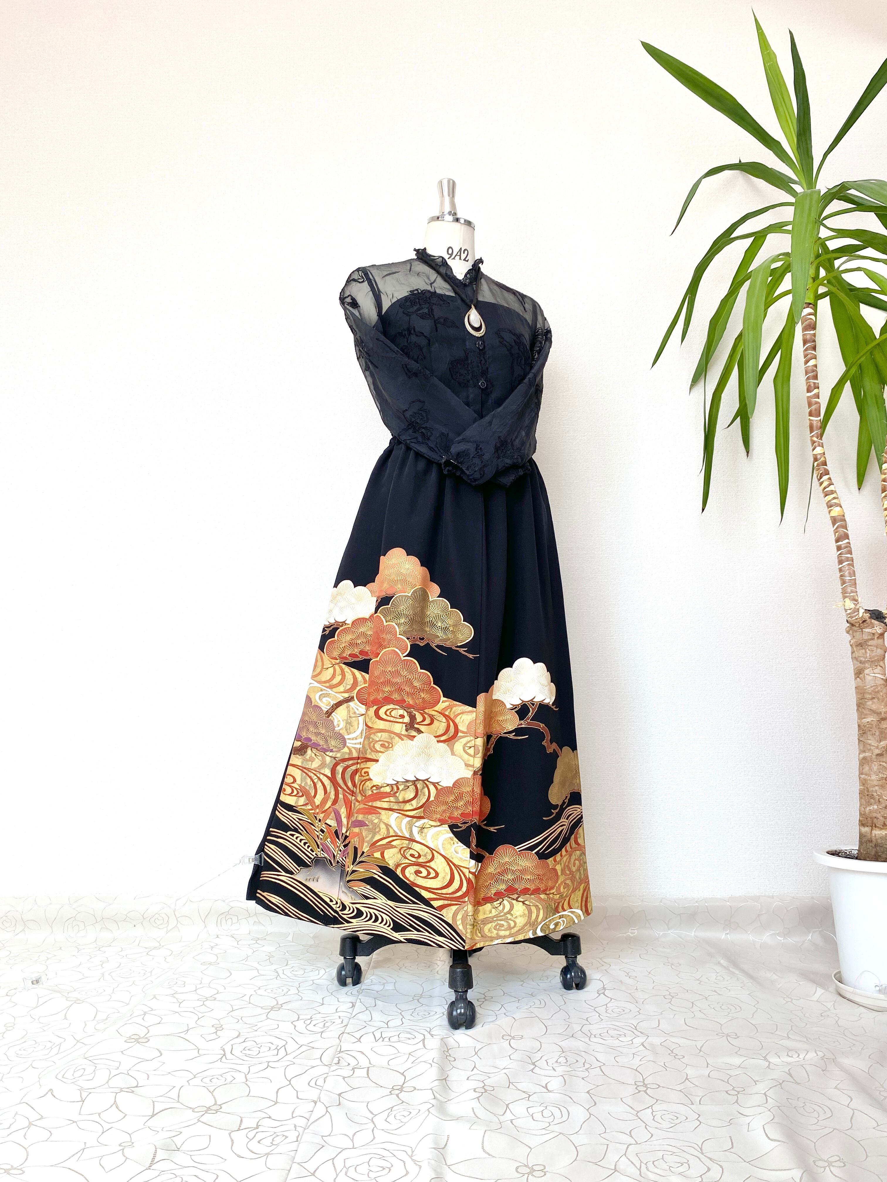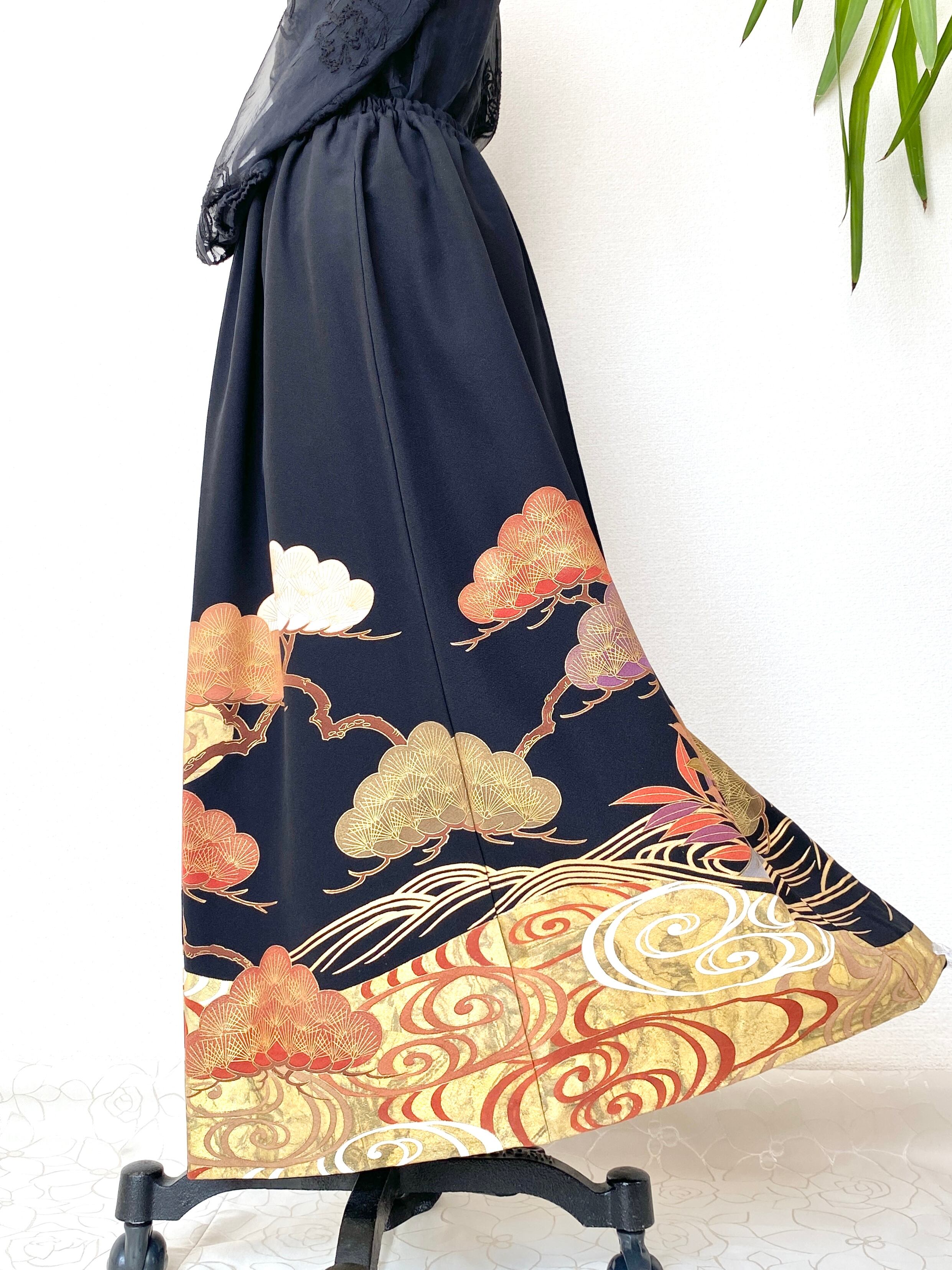 大人可愛いセレブ着物スカートフリーサイズ黒留袖着物リメイクウエストゴムロングスカート