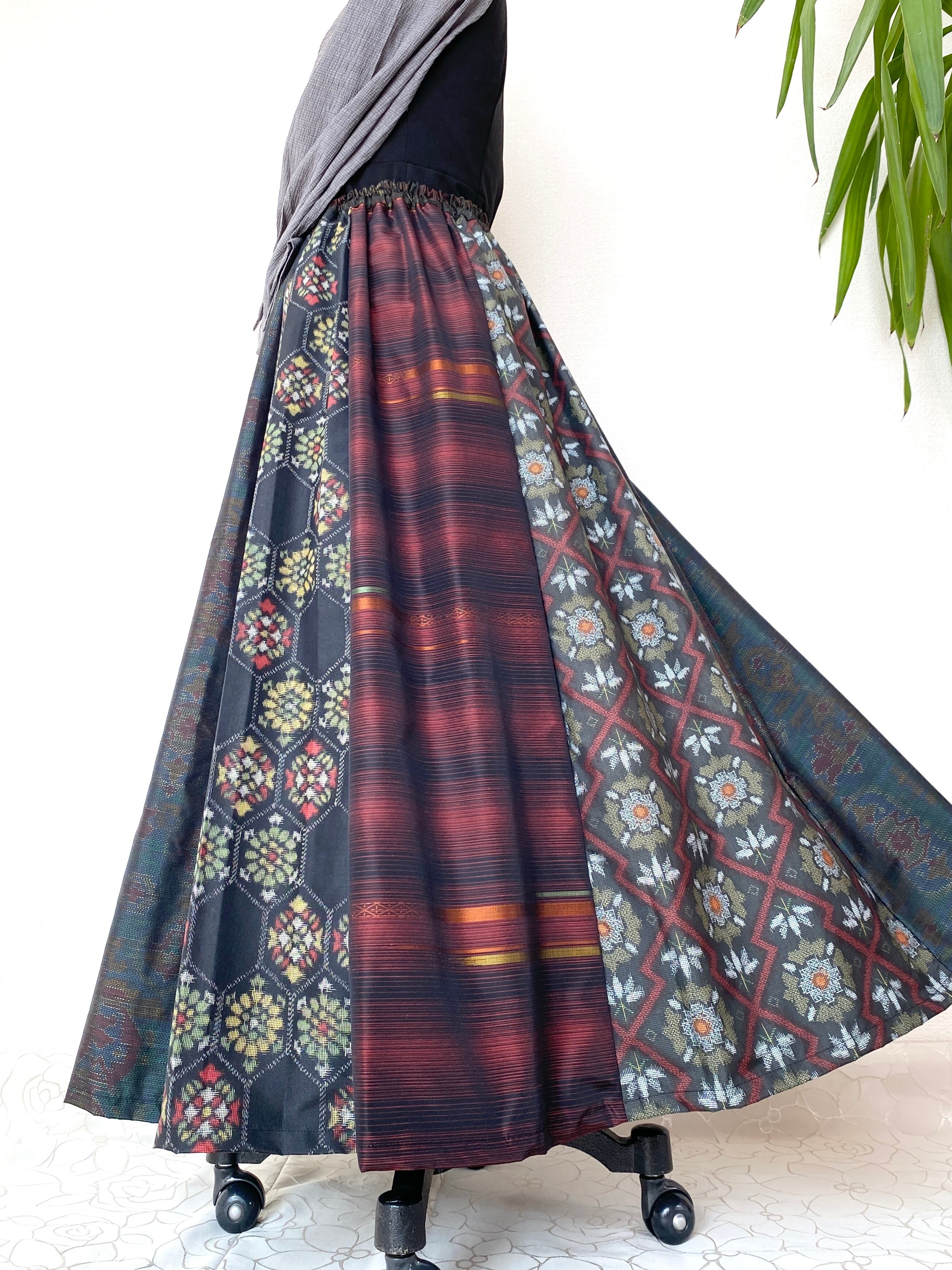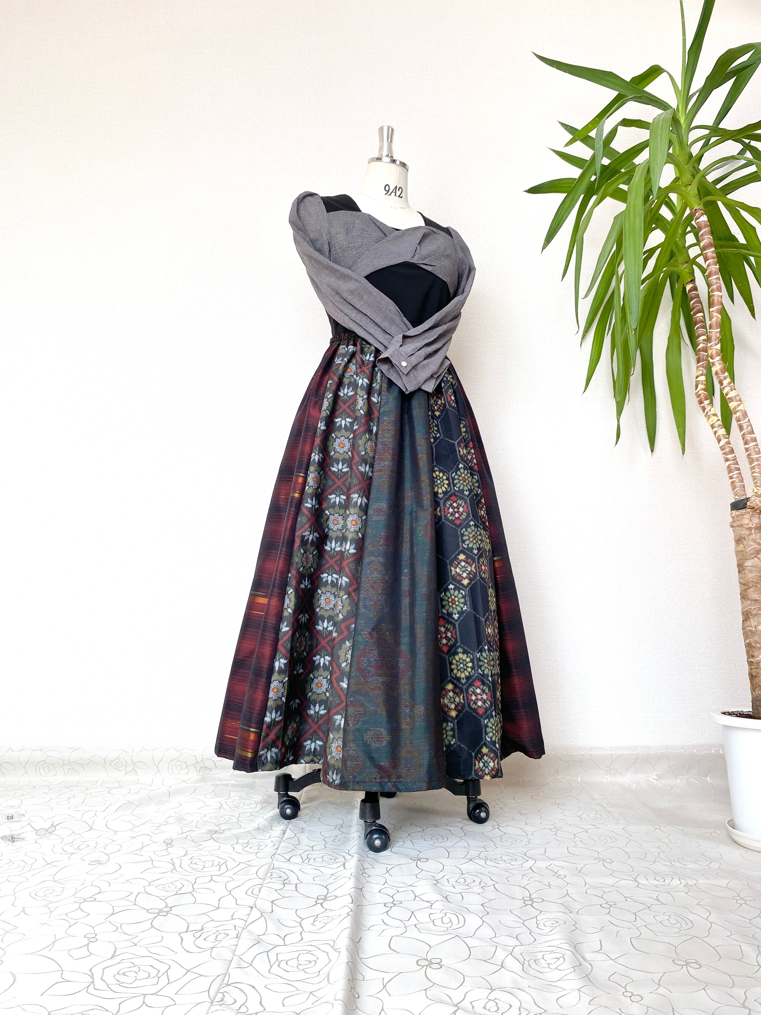 大島の着物をリメイクして作製したウエストゴムロングドレススカートフリーサイズです