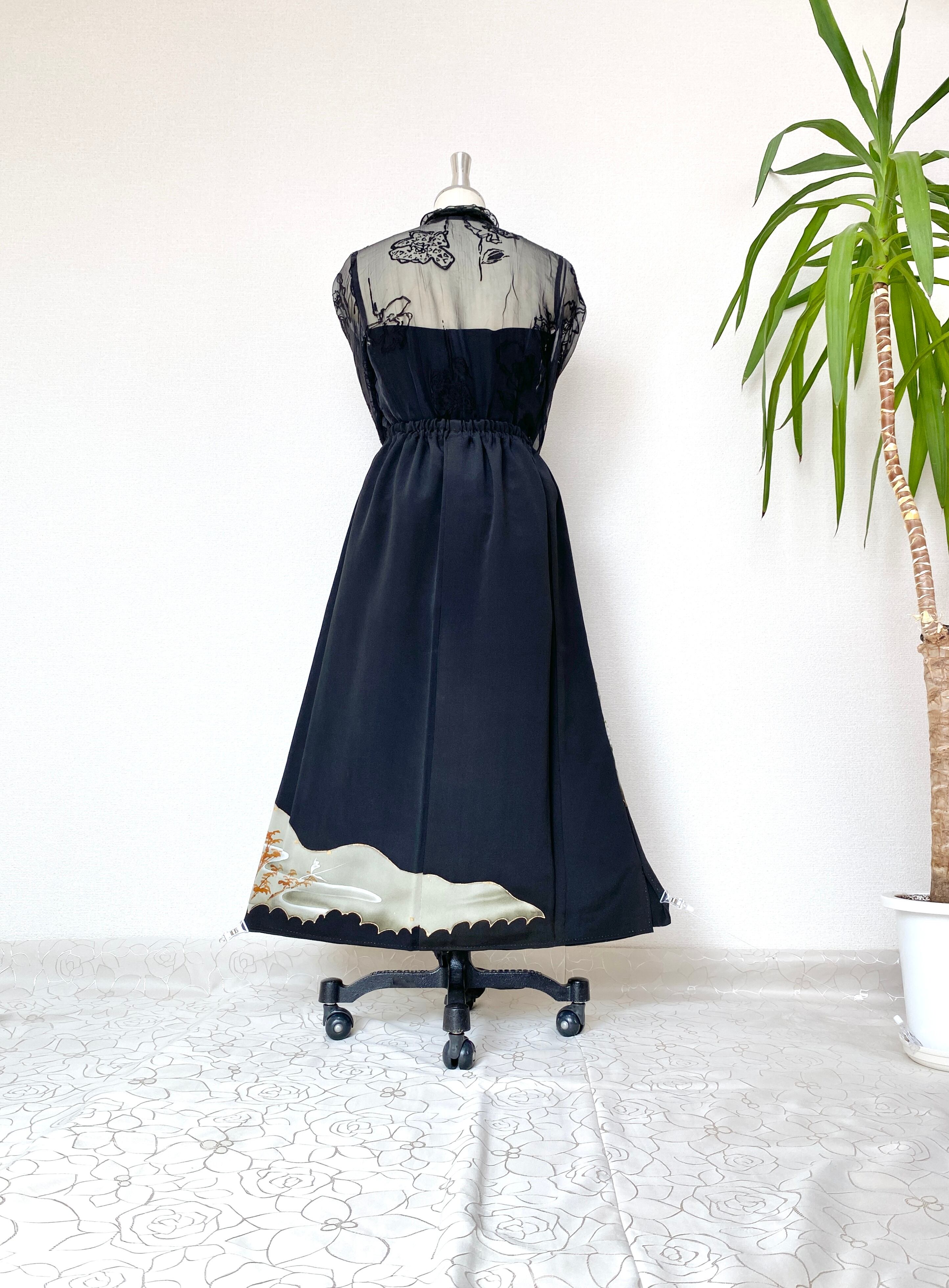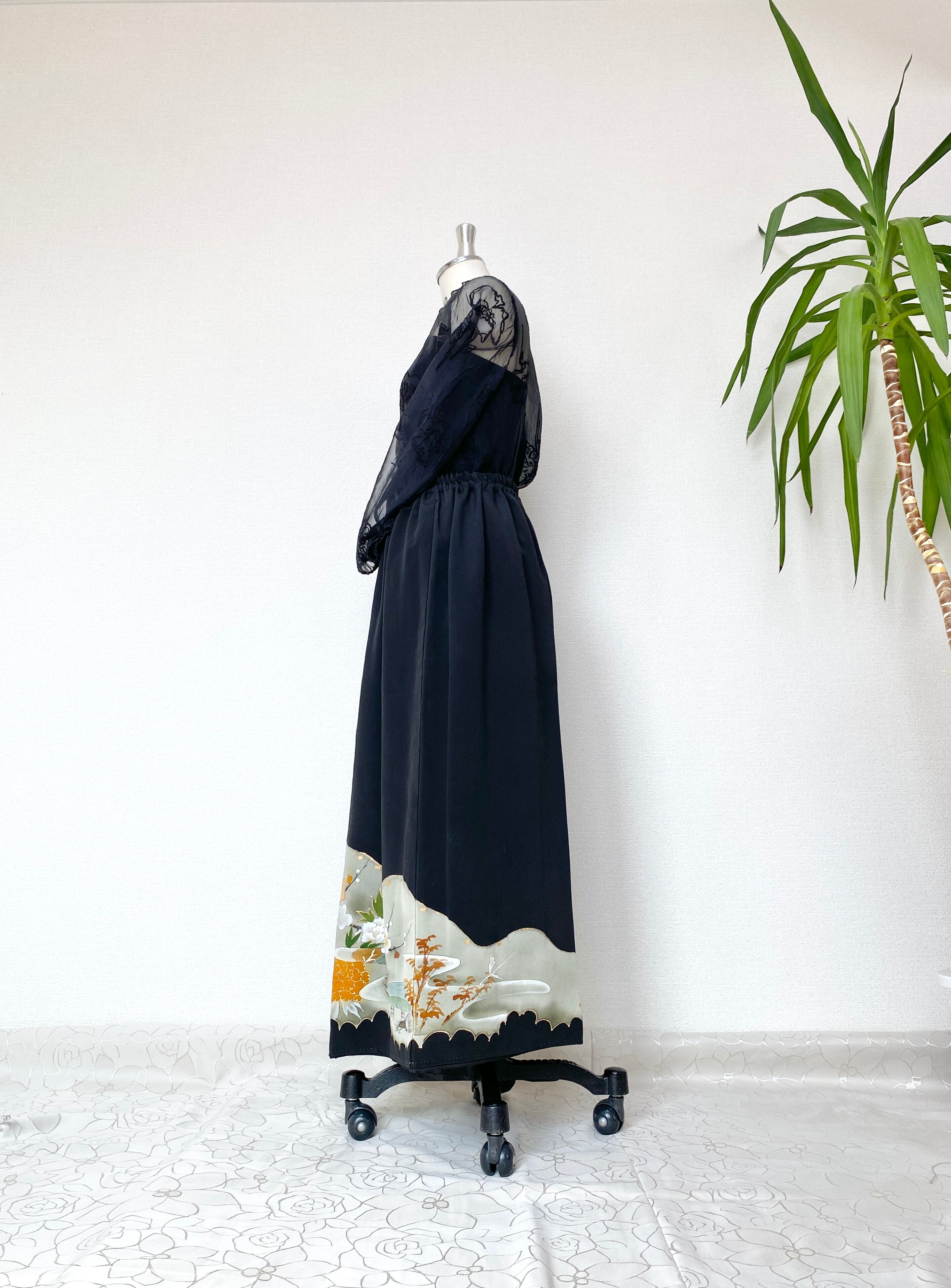 黒留袖着物をリメイクして作製したウエストゴムロングドレススカートフリーサイズです