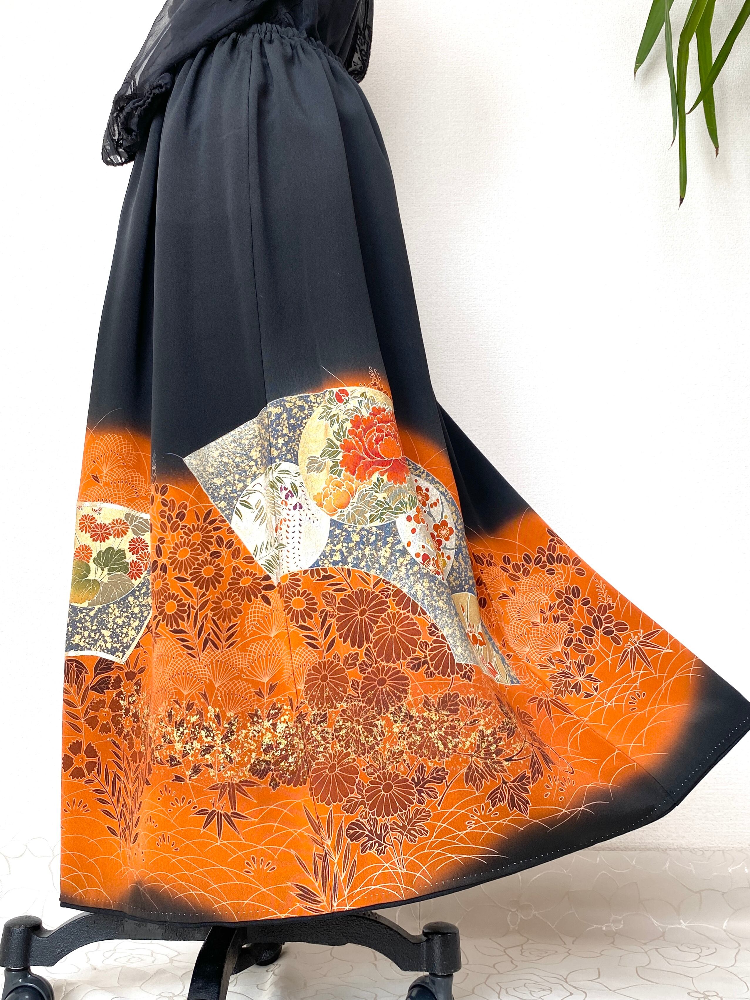 大人可愛いセレブ着物スカートフリーサイズ黒留袖着物リメイクウエストゴムロングスカート