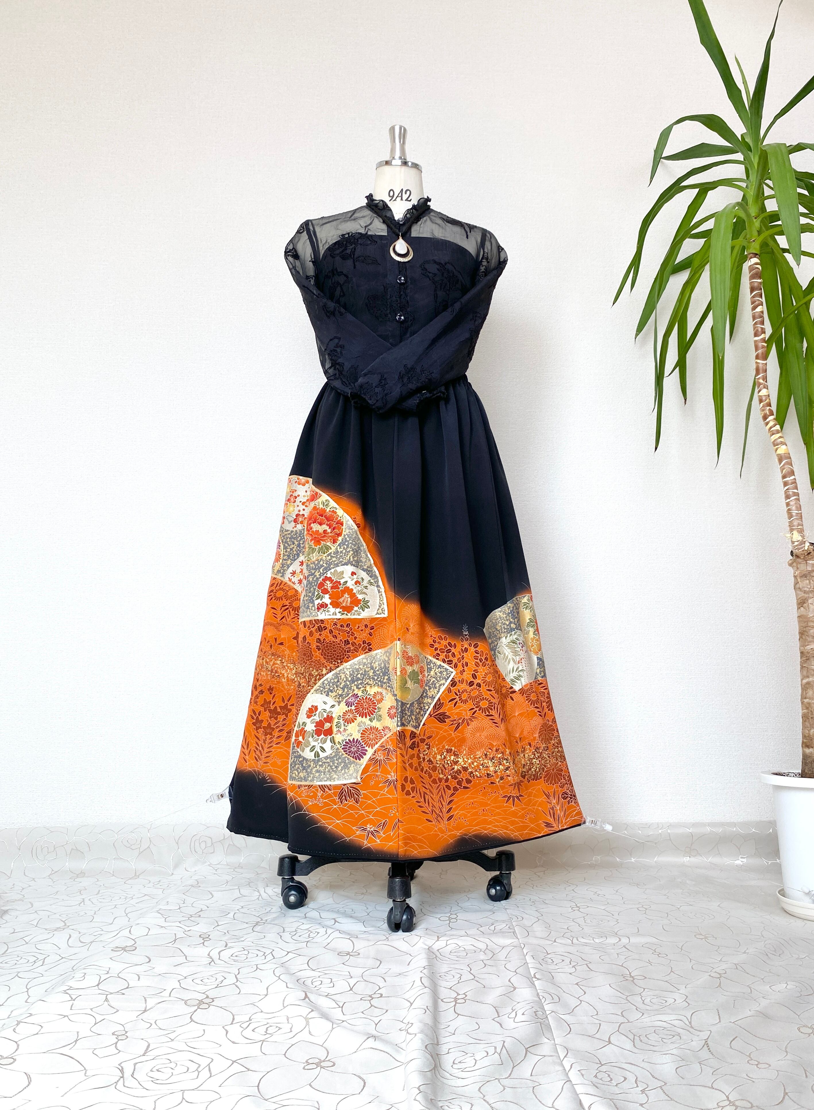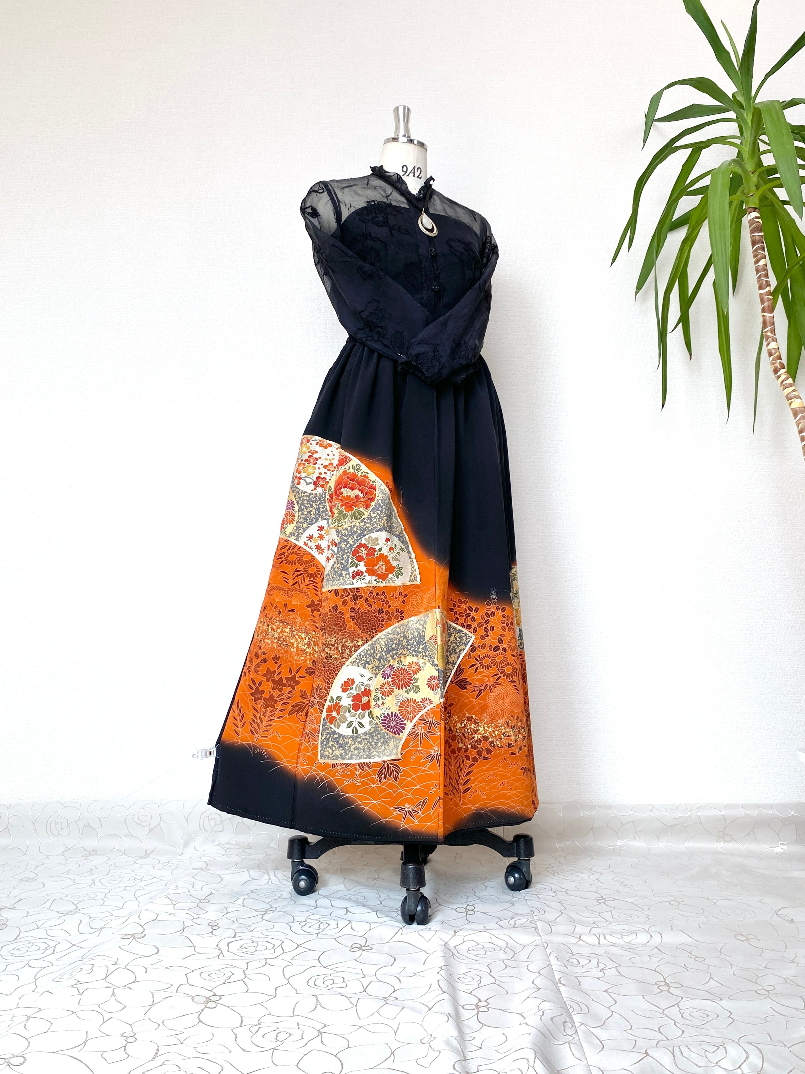 黒留袖着物をリメイクして作製したウエストゴムロングドレススカートフリーサイズです