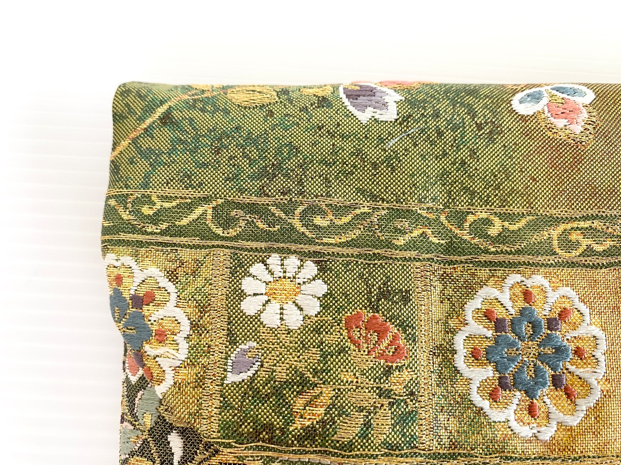 触り心地が滑らかで手にしっくりとくる安心感。絵柄の鮮やかさは日本の帯ならではの存在感で素晴らしく華やかな美しさです