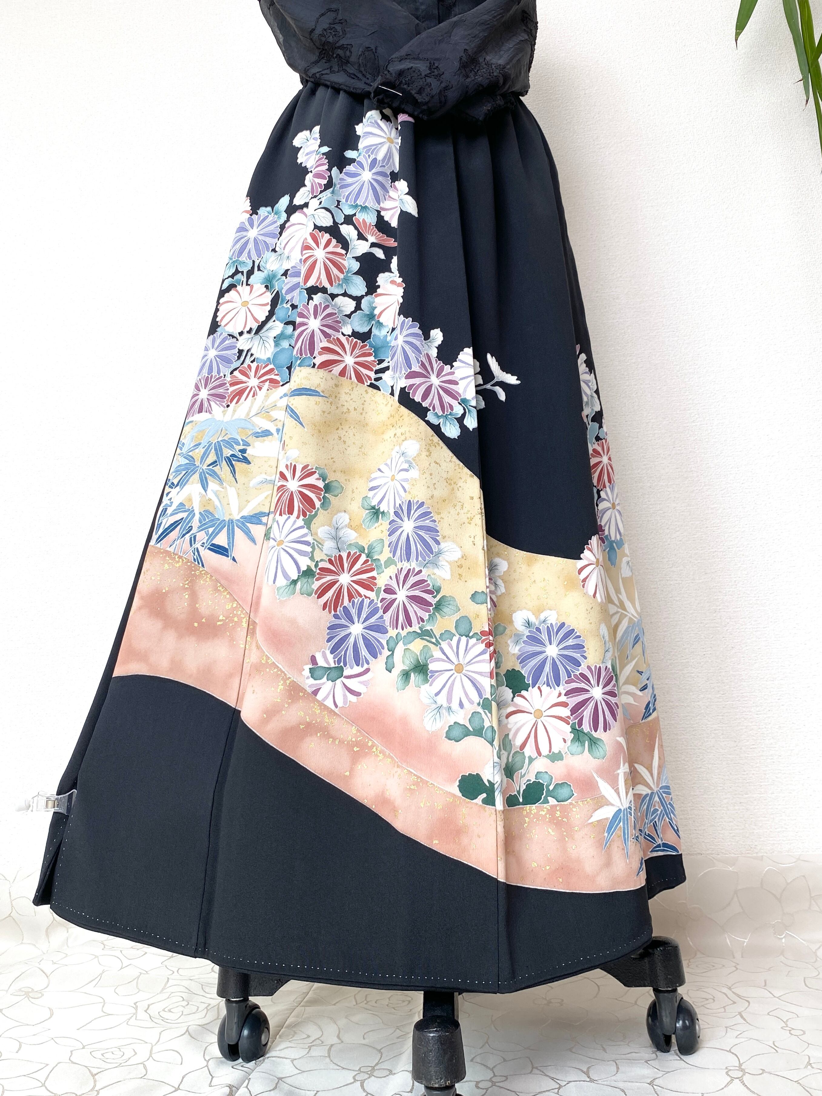 大人可愛いセレブ着物スカートフリーサイズ黒留袖着物リメイクウエストゴムロングスカート