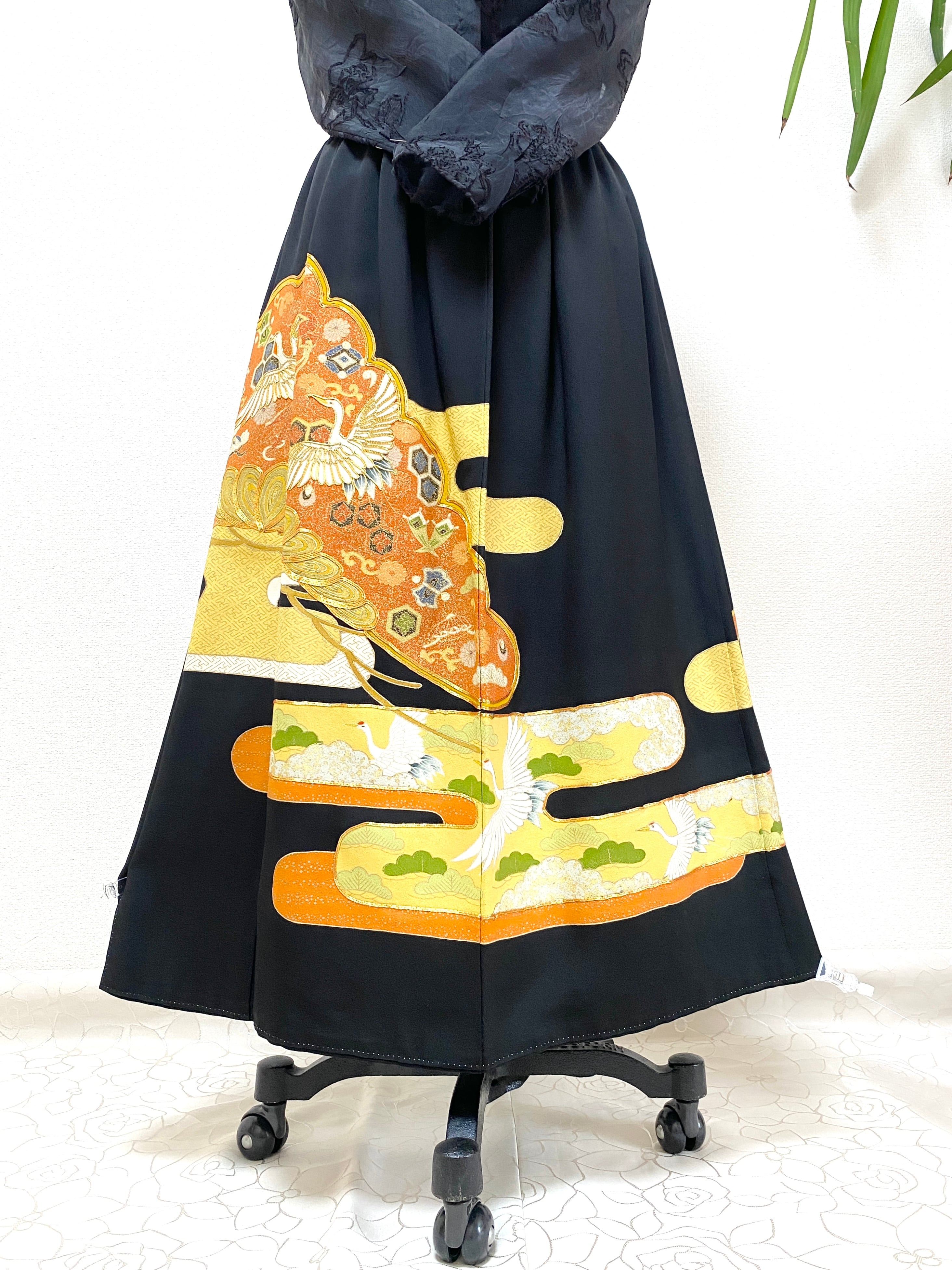 黒留袖着物をリメイクして作製したウエストゴムロングスカートフリーサイズです