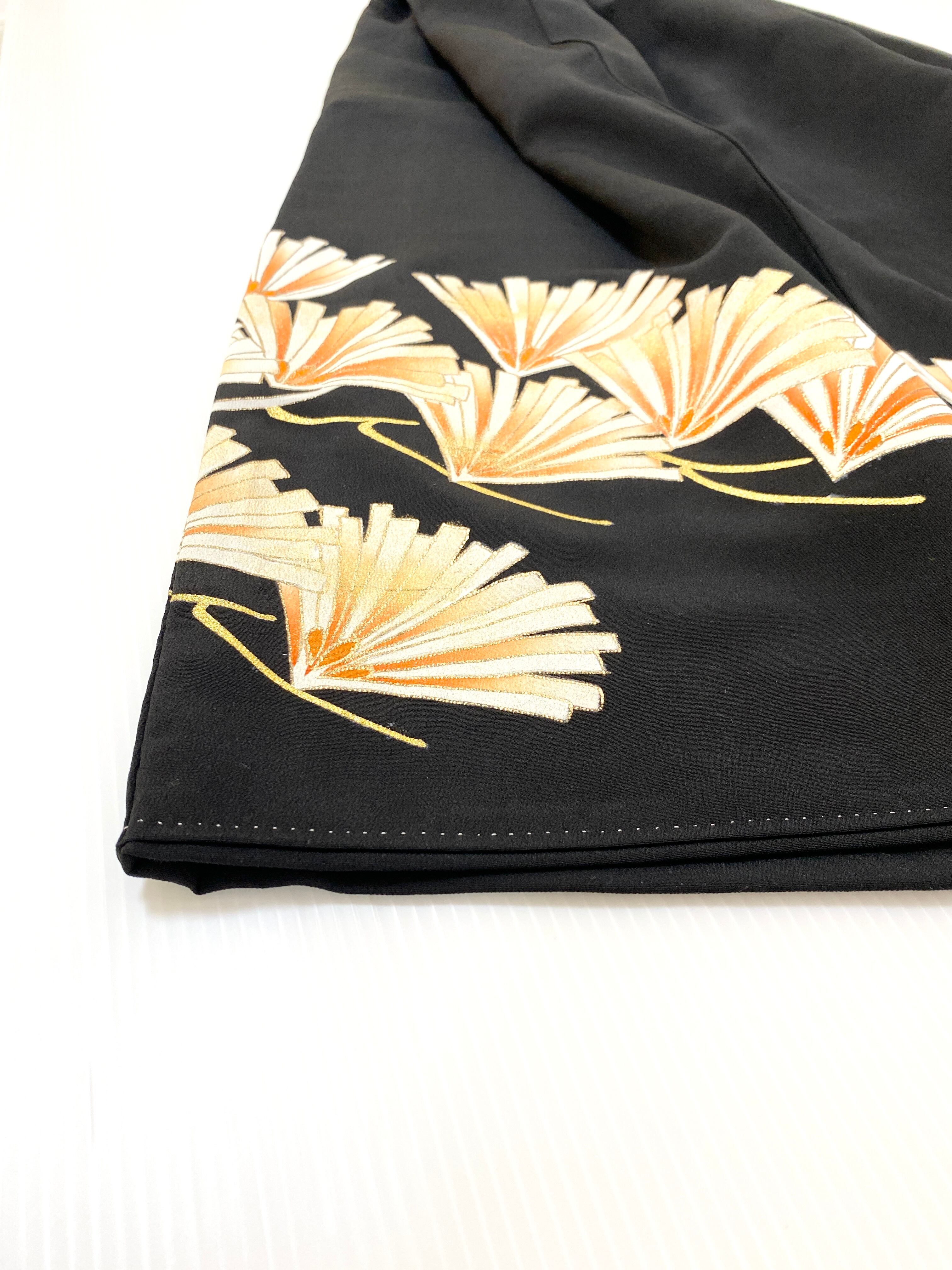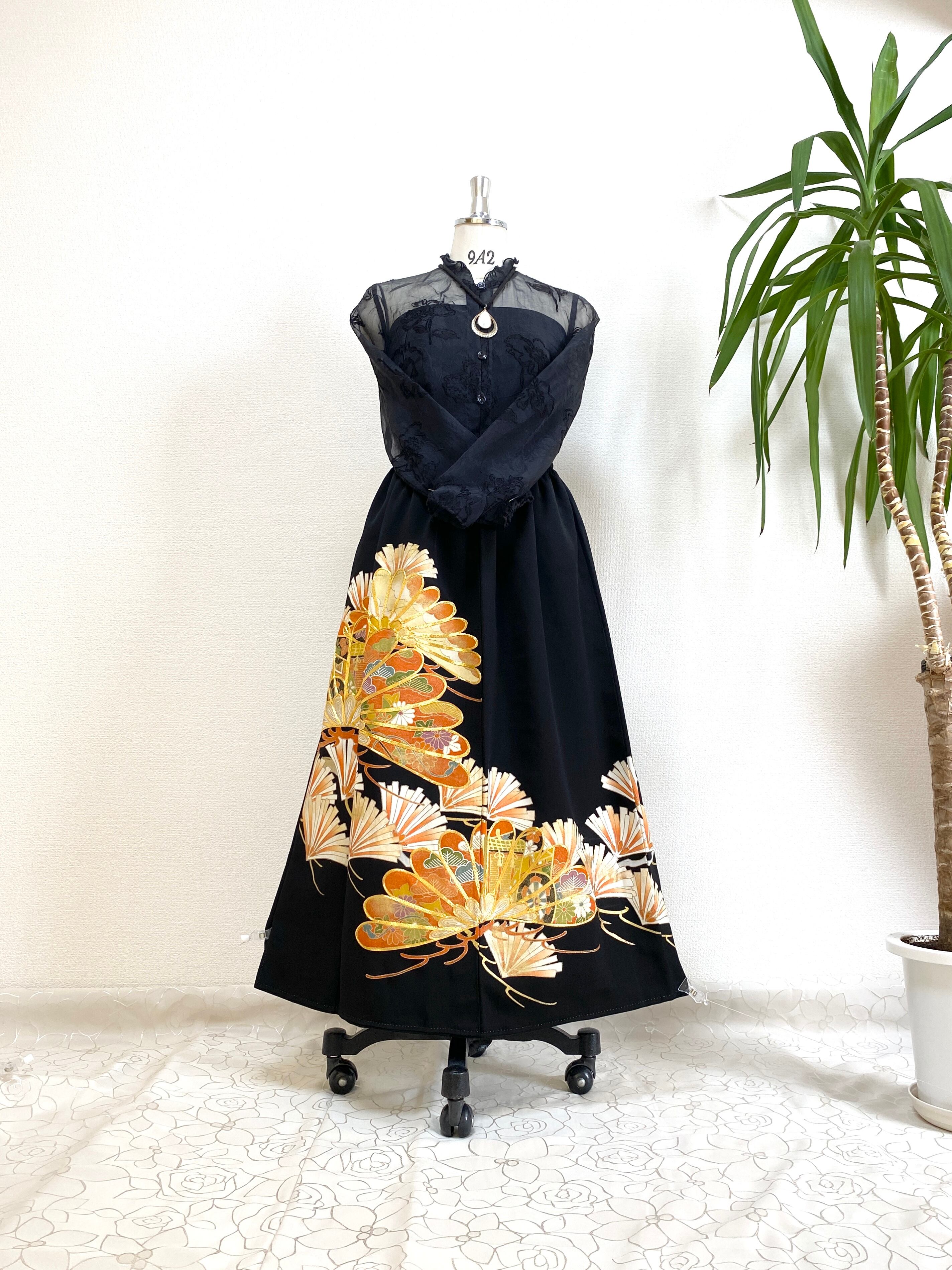 黒留袖着物をリメイクして作製したウエストゴムロングドレススカートフリーサイズです