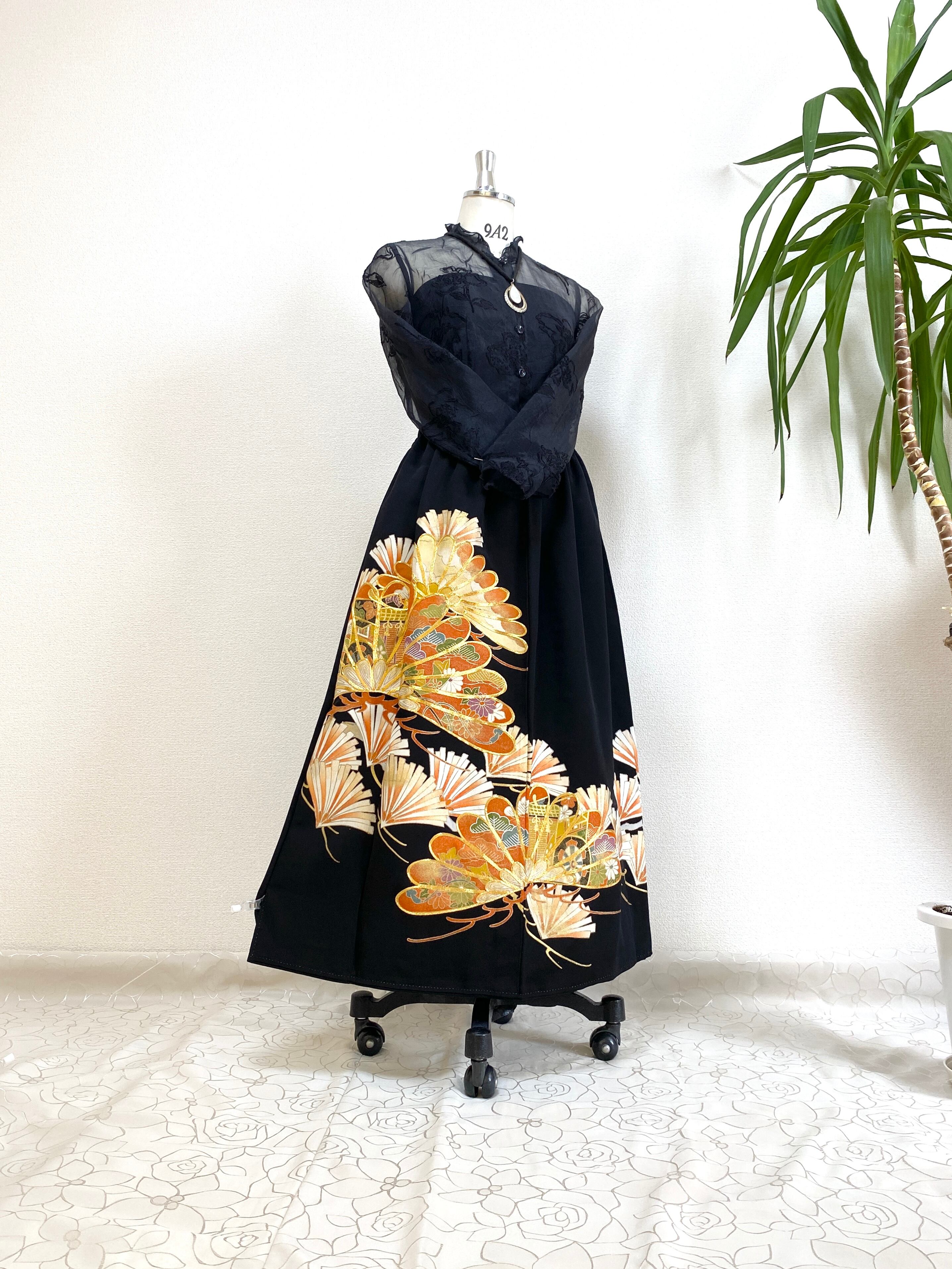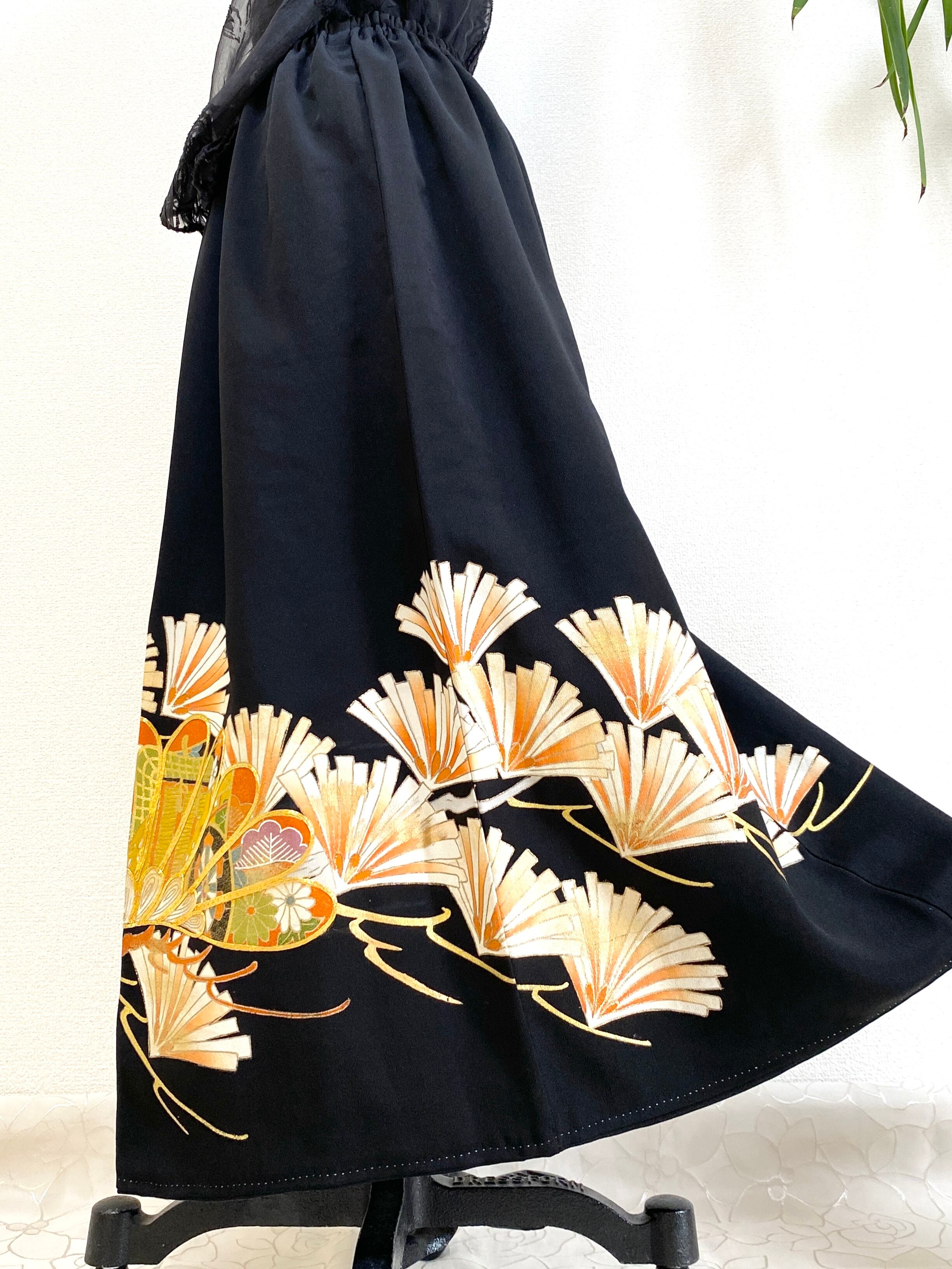 大人可愛いセレブ着物スカートフリーサイズ黒留袖着物リメイクウエストゴムロングスカート