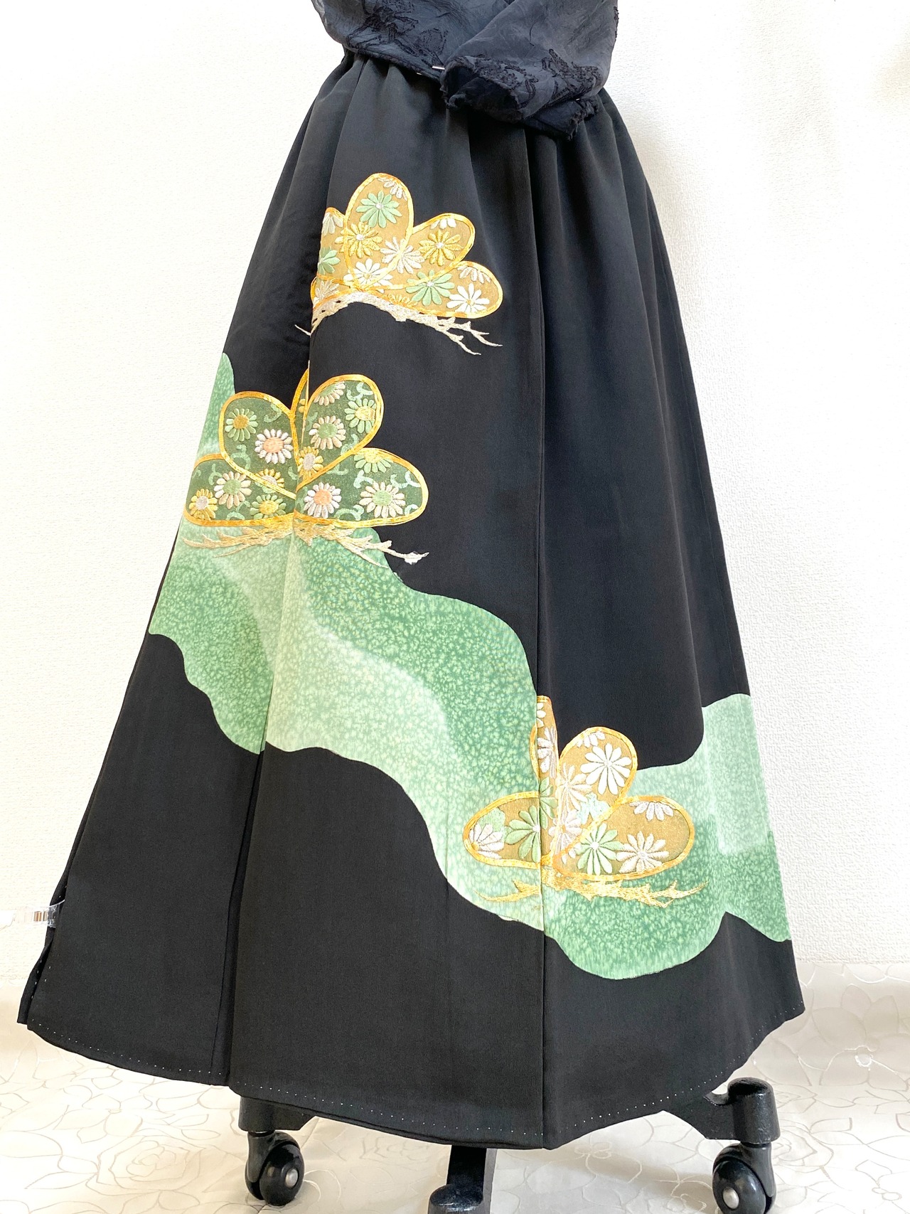 大人可愛いセレブ着物スカートフリーサイズ黒留袖着物リメイクウエストゴムロングスカート