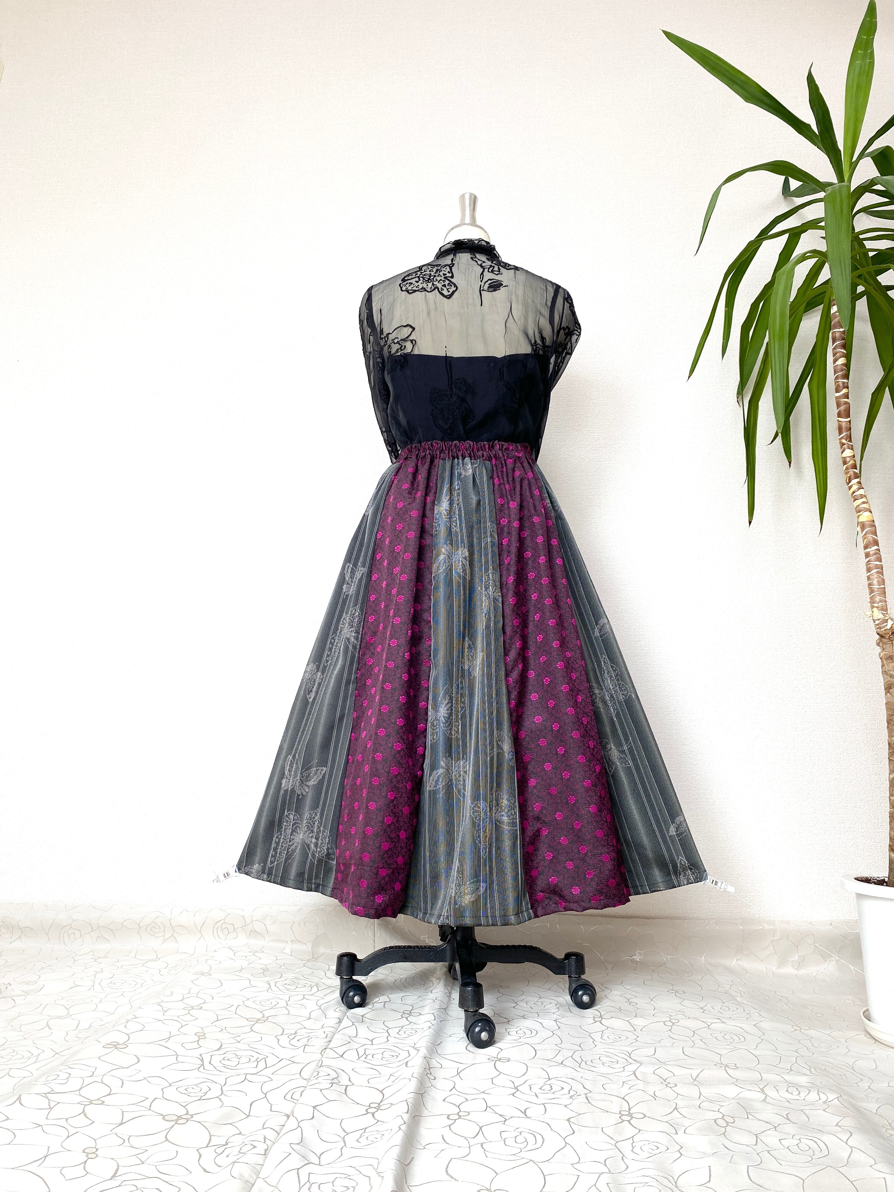 着物をリメイクして作製したウエストゴムロングドレススカートフリーサイズです