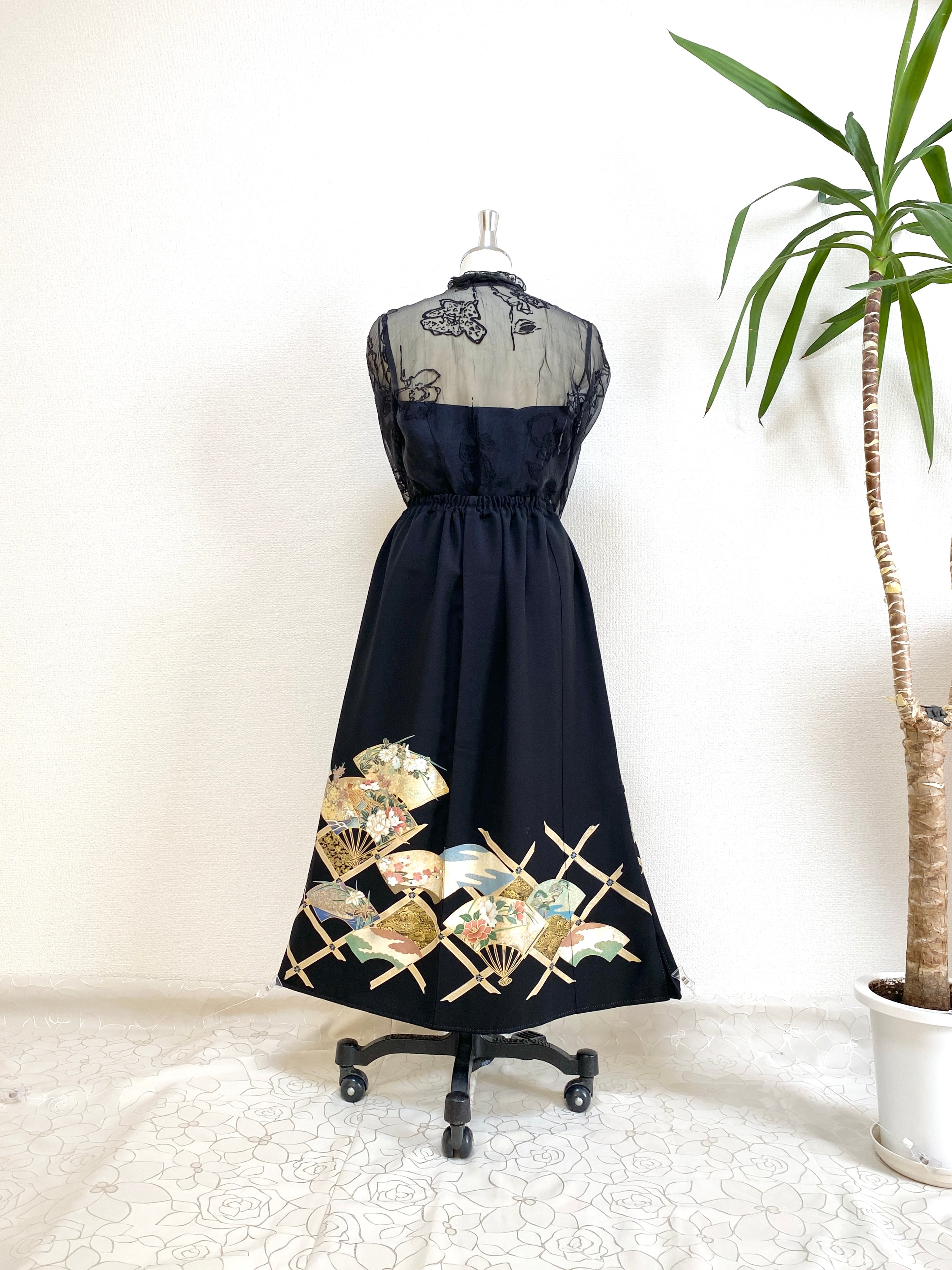 【新品】大人可愛いセレブ着物スカートフリーサイズ1点物黒留袖着物リメイクウエストゴムロングスカートフリーサイズ送料込みハンドメイドNO.5713