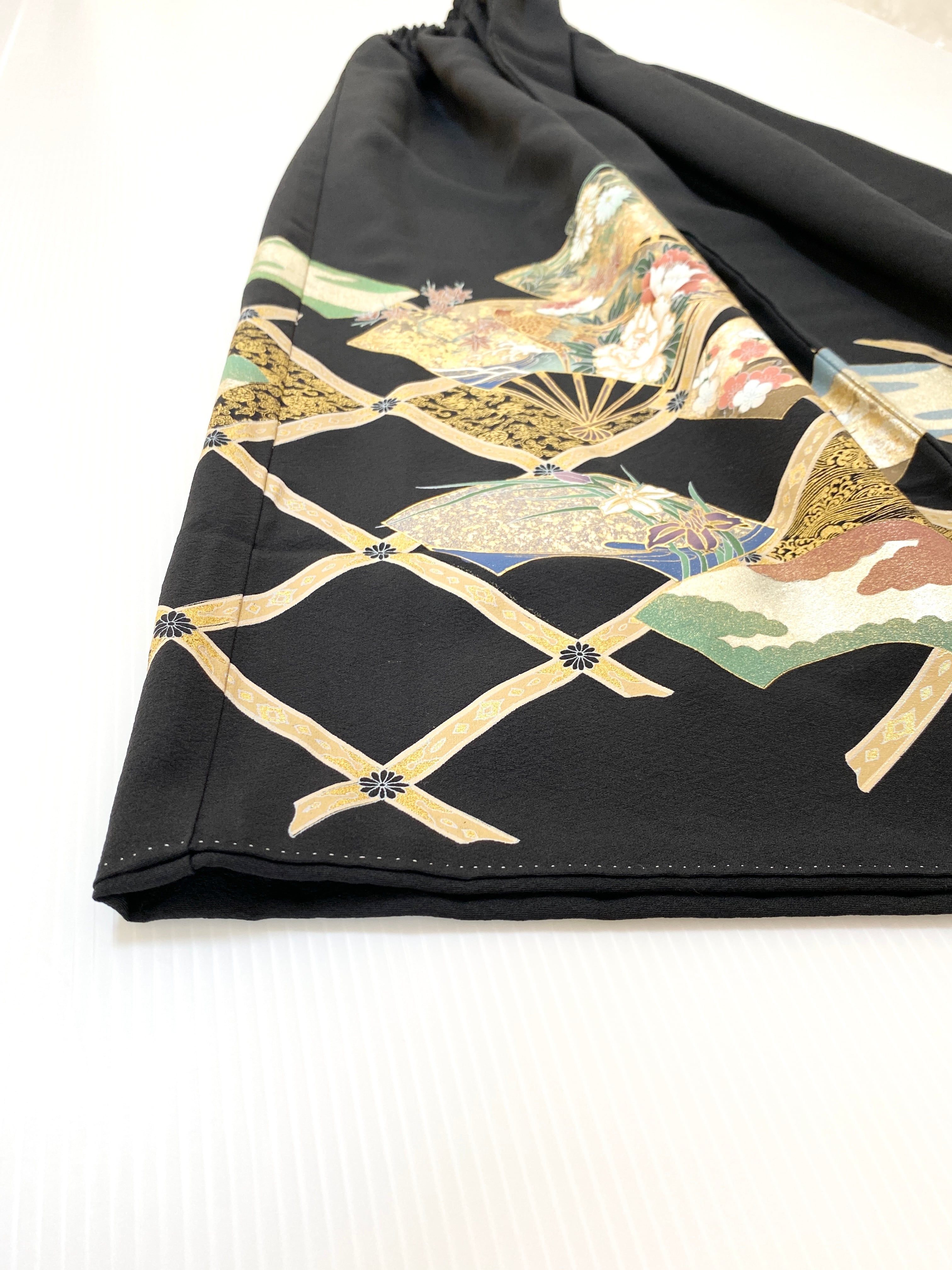 【新品】大人可愛いセレブ着物スカートフリーサイズ黒留袖着物リメイクウエストゴムロングスカート