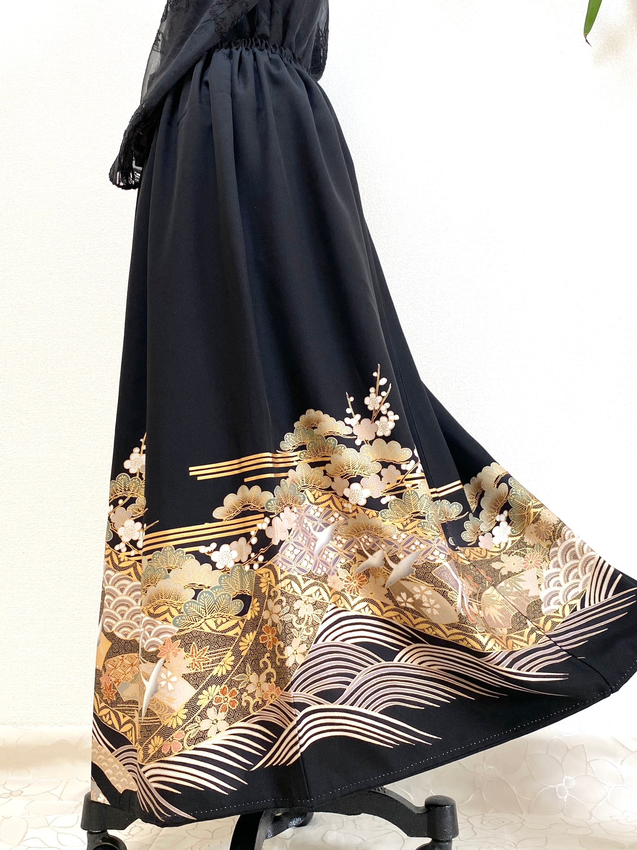 黒留袖着物をリメイクして作製したウエストゴムロングドレススカートフリーサイズです