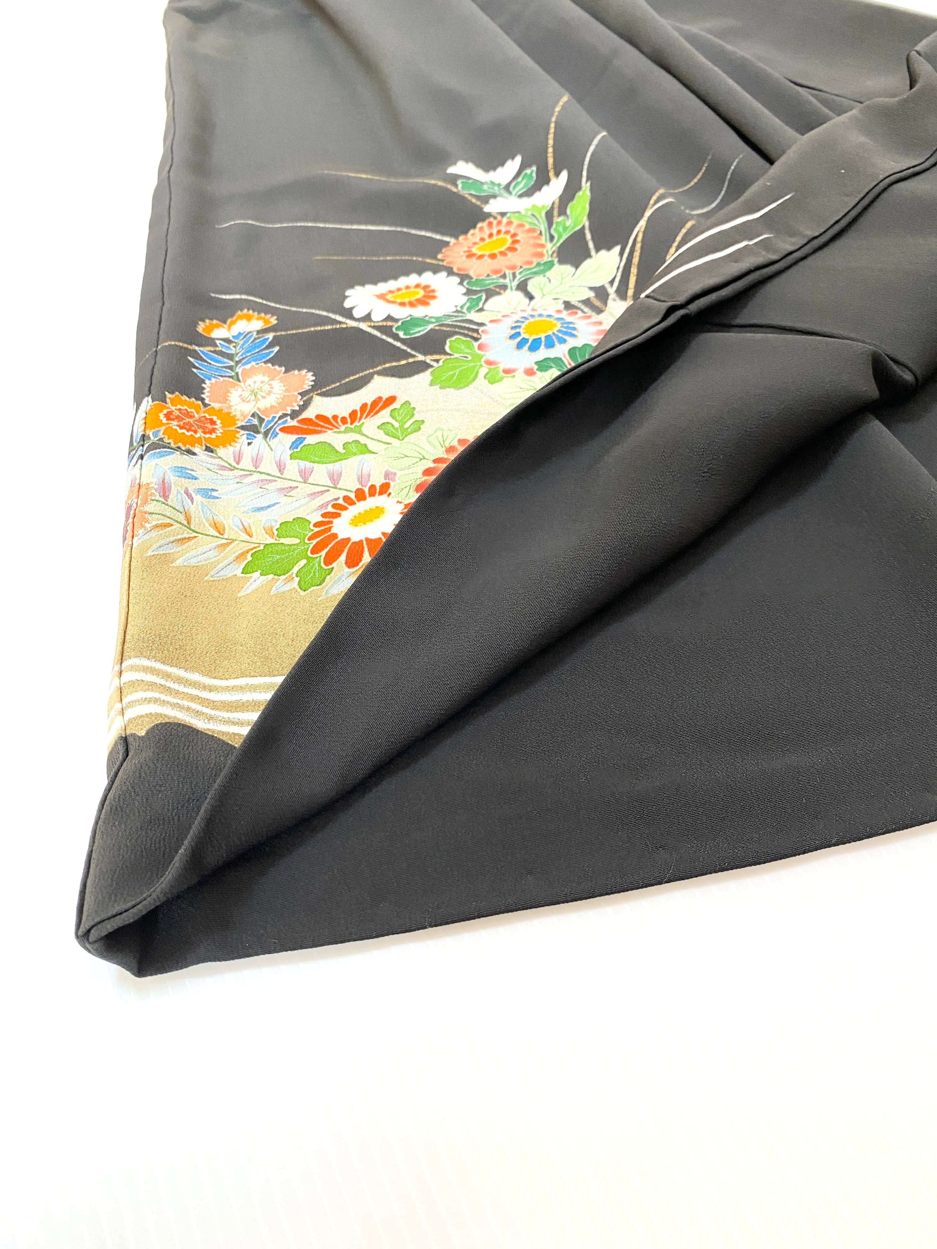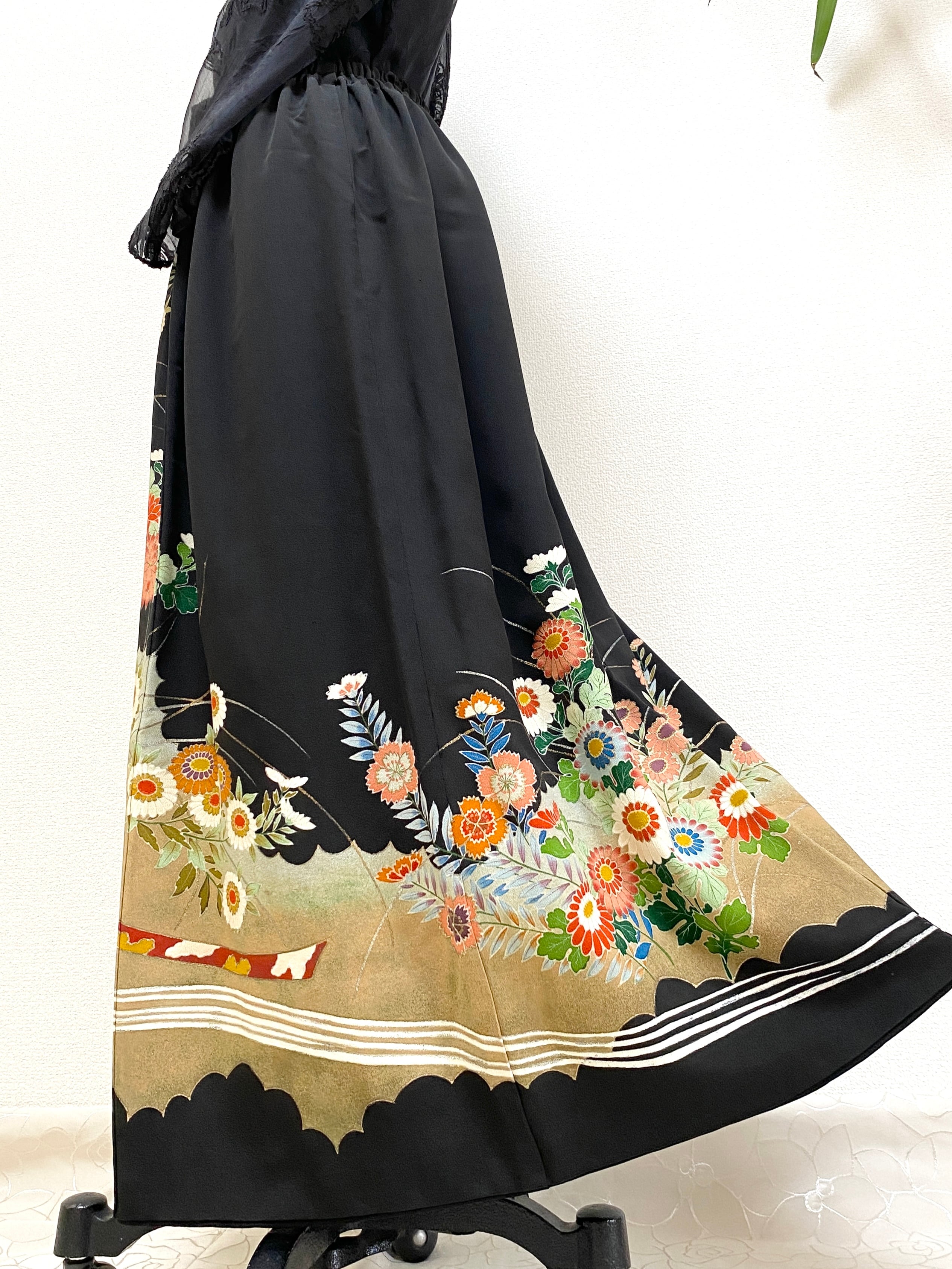 大人可愛いセレブ着物スカートフリーサイズ黒留袖着物リメイクウエストゴムロングスカート