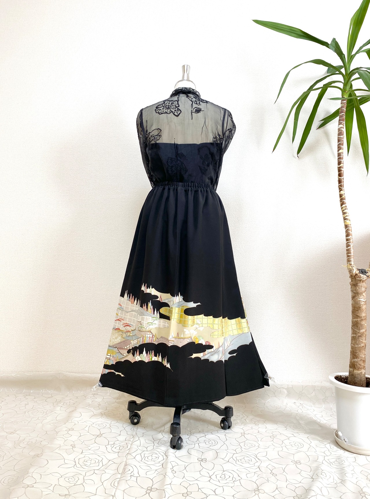 黒留袖着物をリメイクして作製したウエストゴムロングドレススカートフリーサイズです