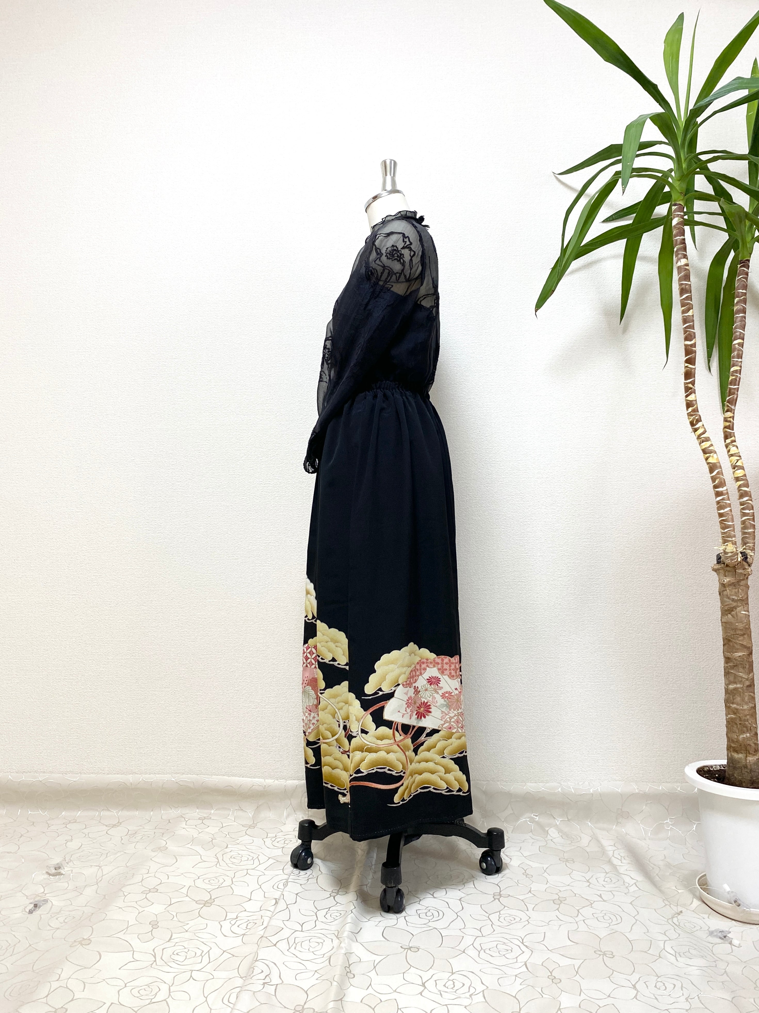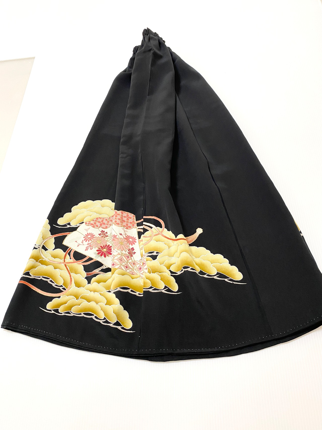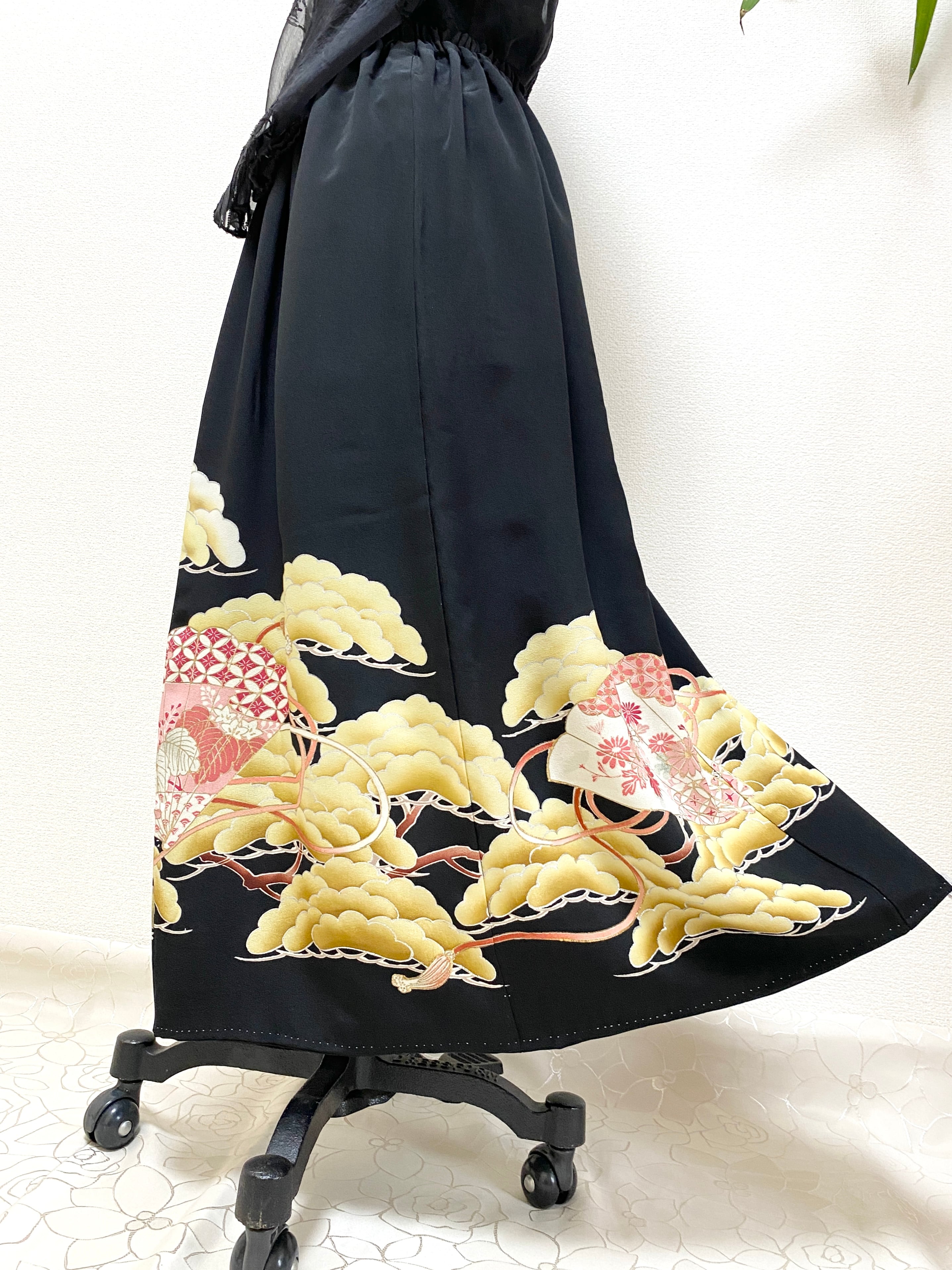 大人可愛いセレブ着物スカートフリーサイズ黒留袖着物リメイクウエストゴムロングスカート