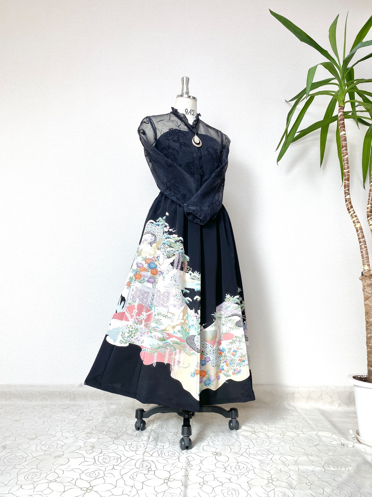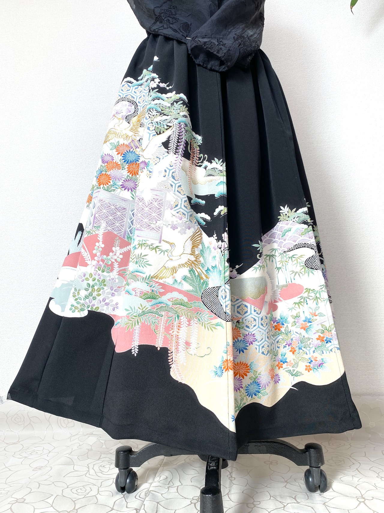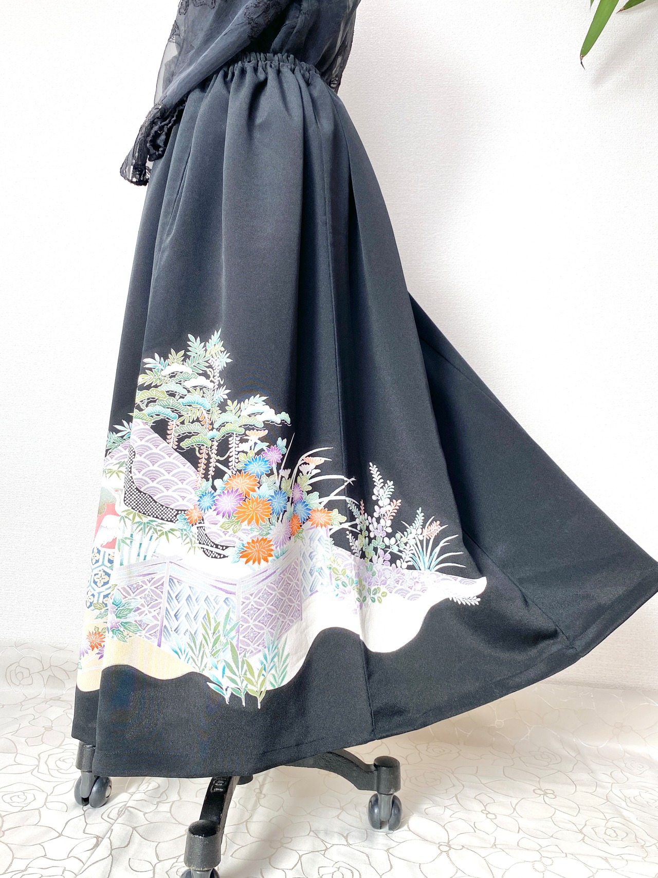 大人可愛いセレブ着物スカートフリーサイズ黒留袖着物リメイクウエストゴムロングスカート