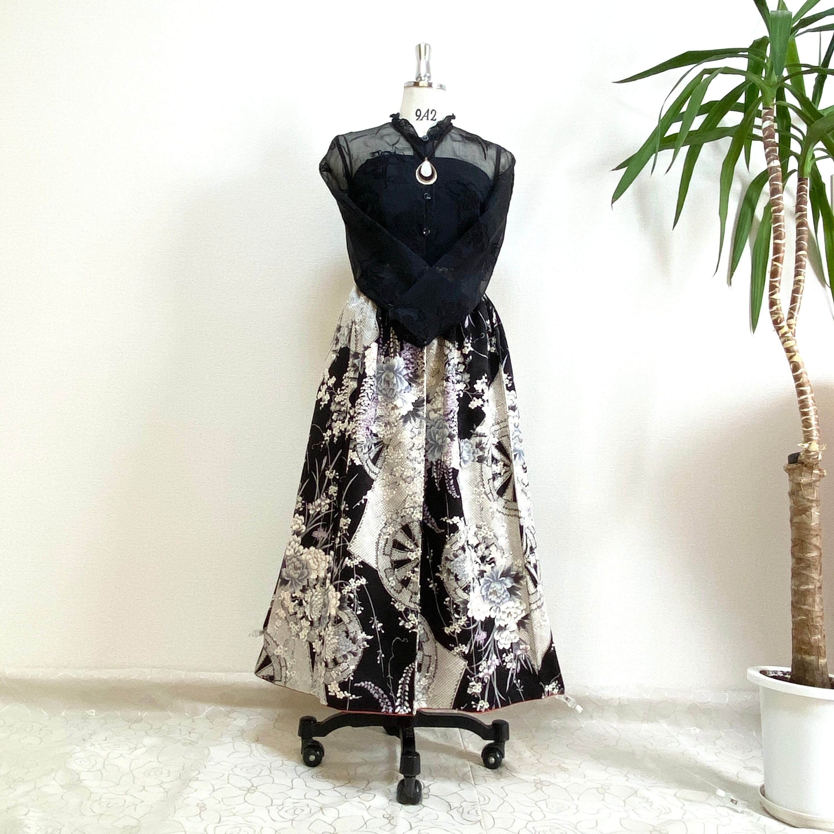 大人可愛い着物スカート着物リメイクウエストゴムロングスカートフリーサイズ送料込みハンドメイドNO.5837