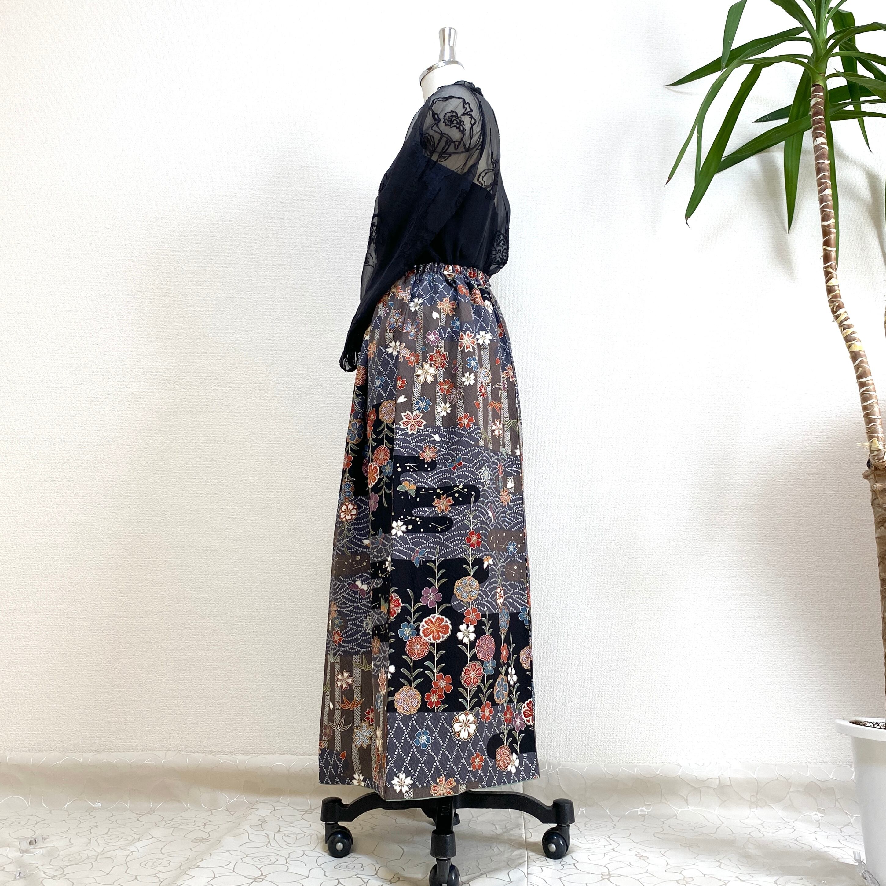着物をリメイクして作製したウエストゴムロングスカートフリーサイズです