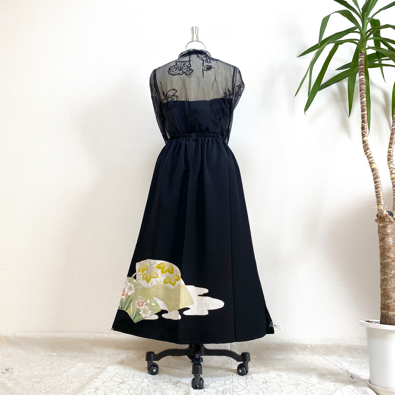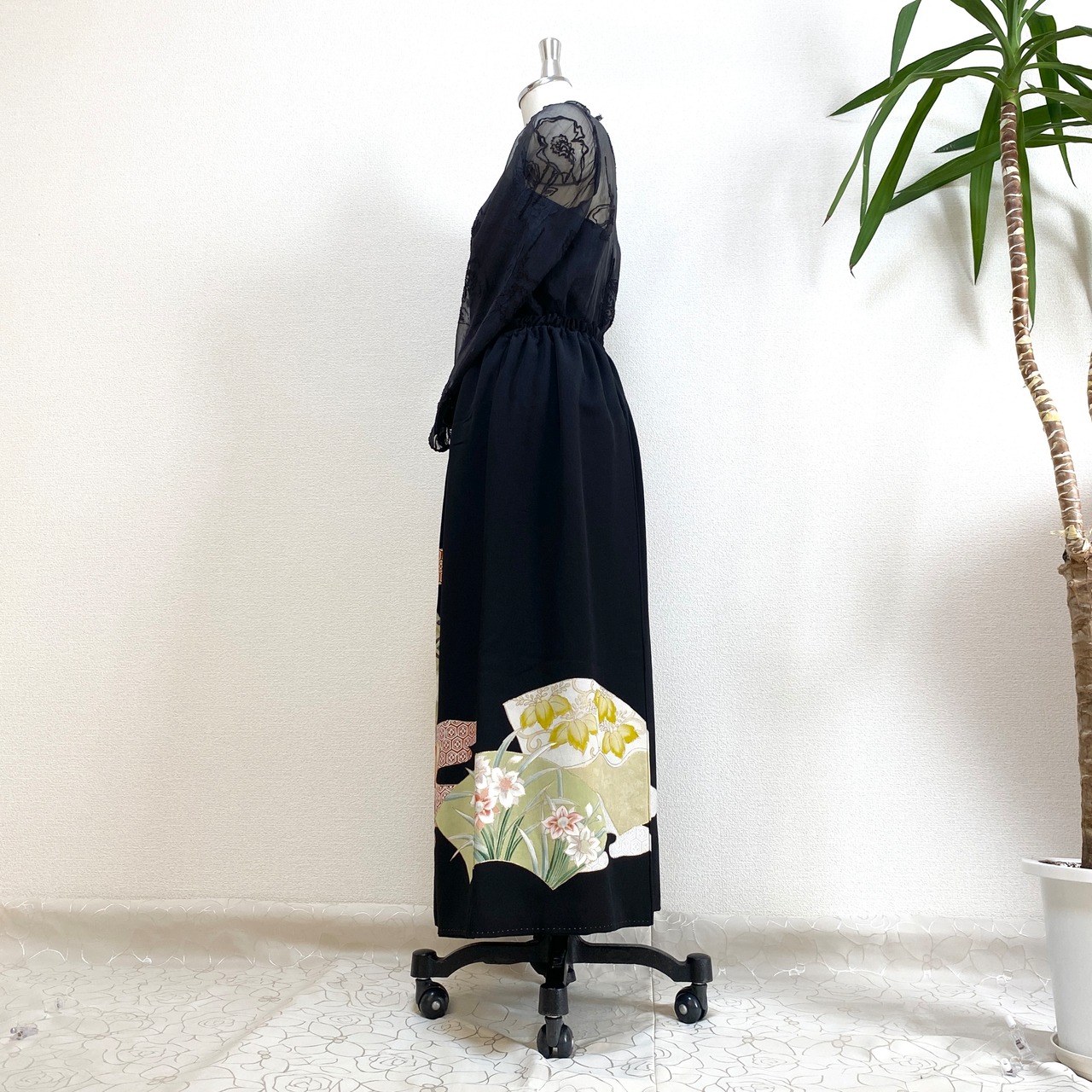 黒留袖着物をリメイクして作製したウエストゴムロングドレススカートフリーサイズです