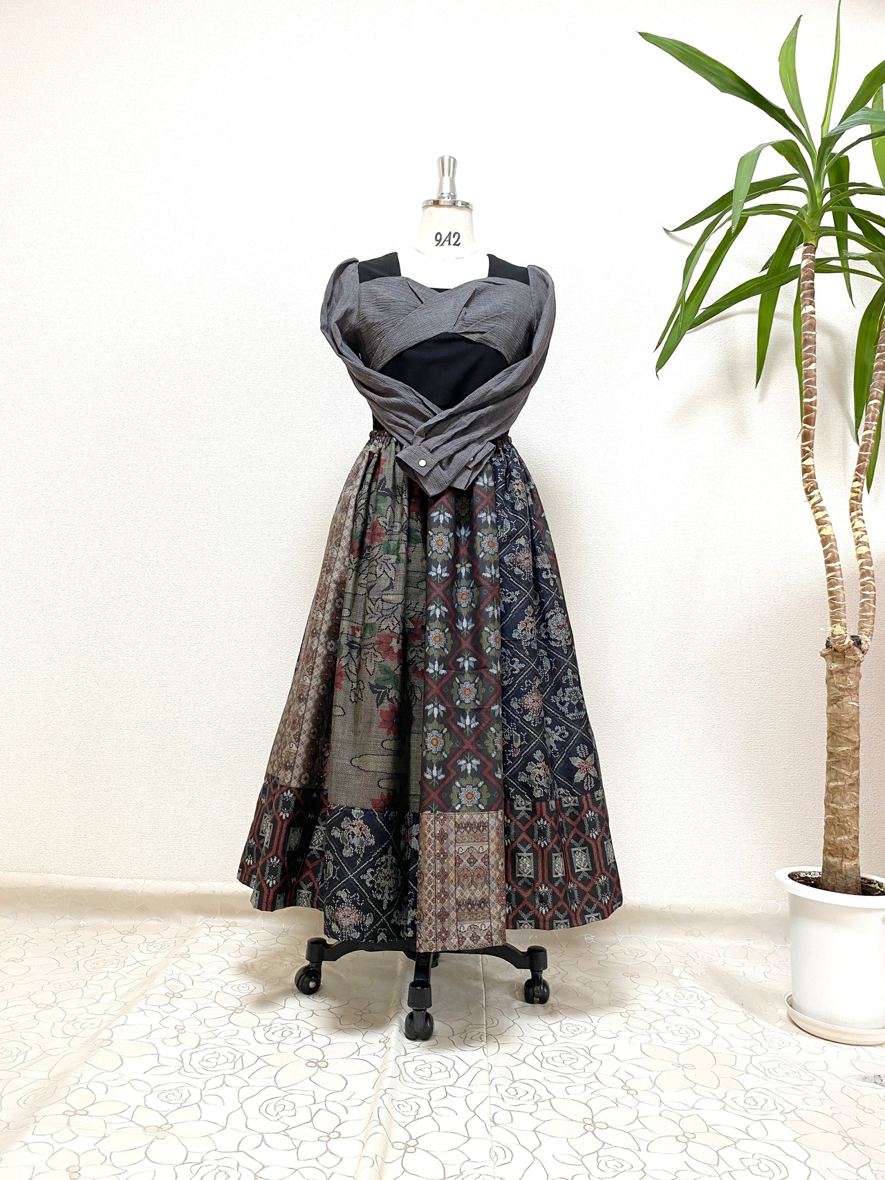 大島の着物をリメイクして作製したウエストゴムロングドレススカートフリーサイズです