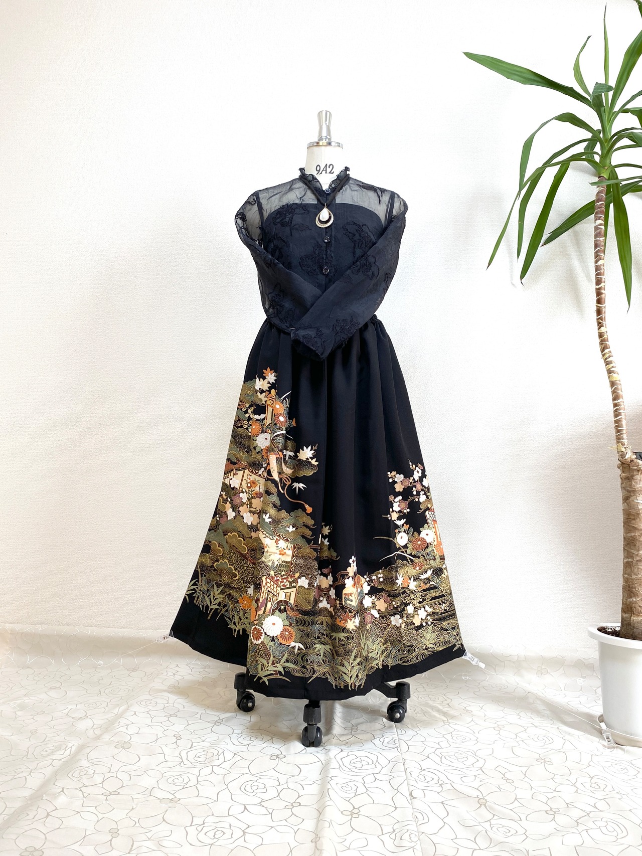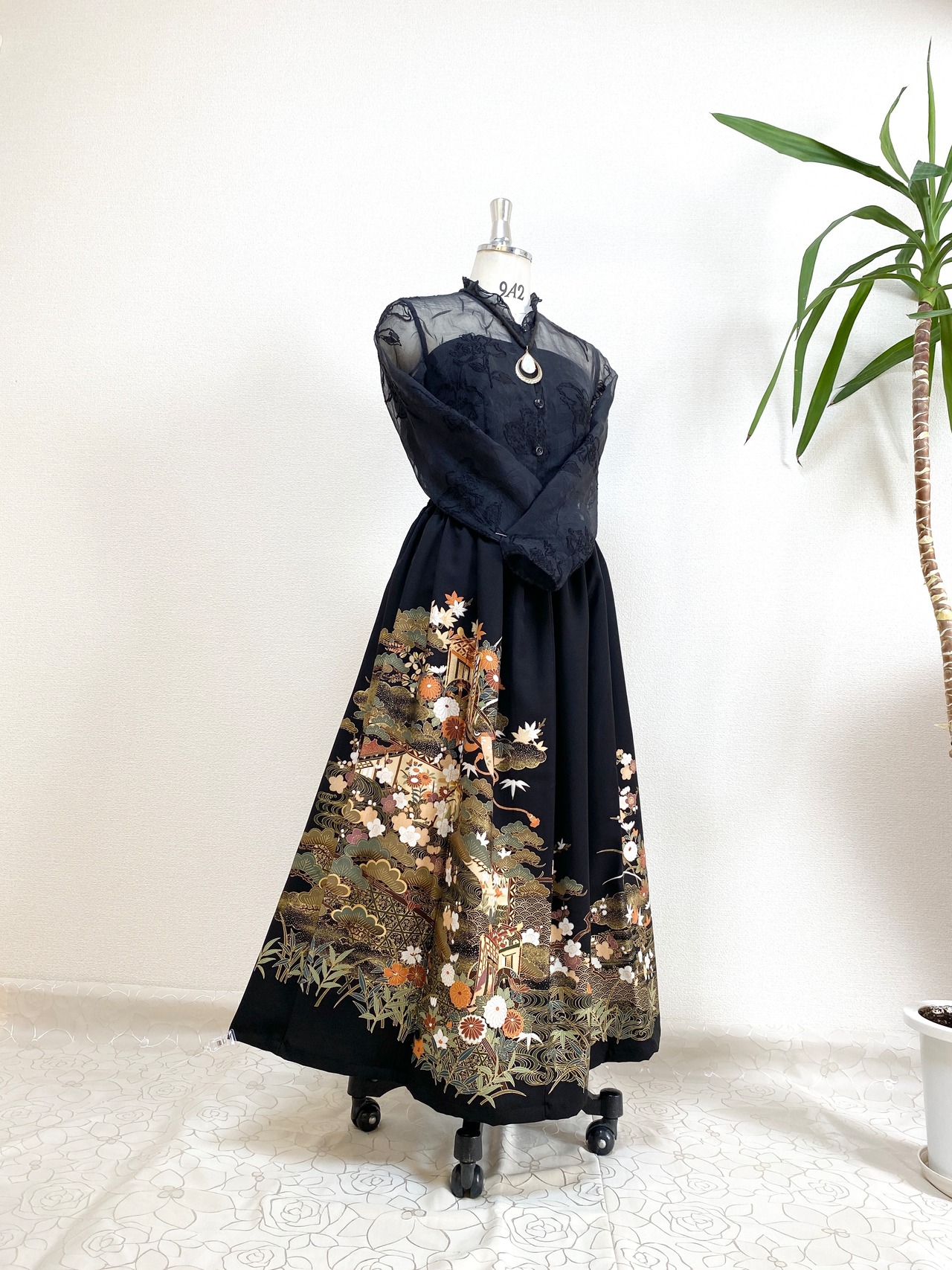 大人可愛いセレブ着物スカート【大きいサイズ~4Lサイズ】1点物黒留袖着物リメイクウエストゴムロングスカート送料込みハンドメイドNO.5873