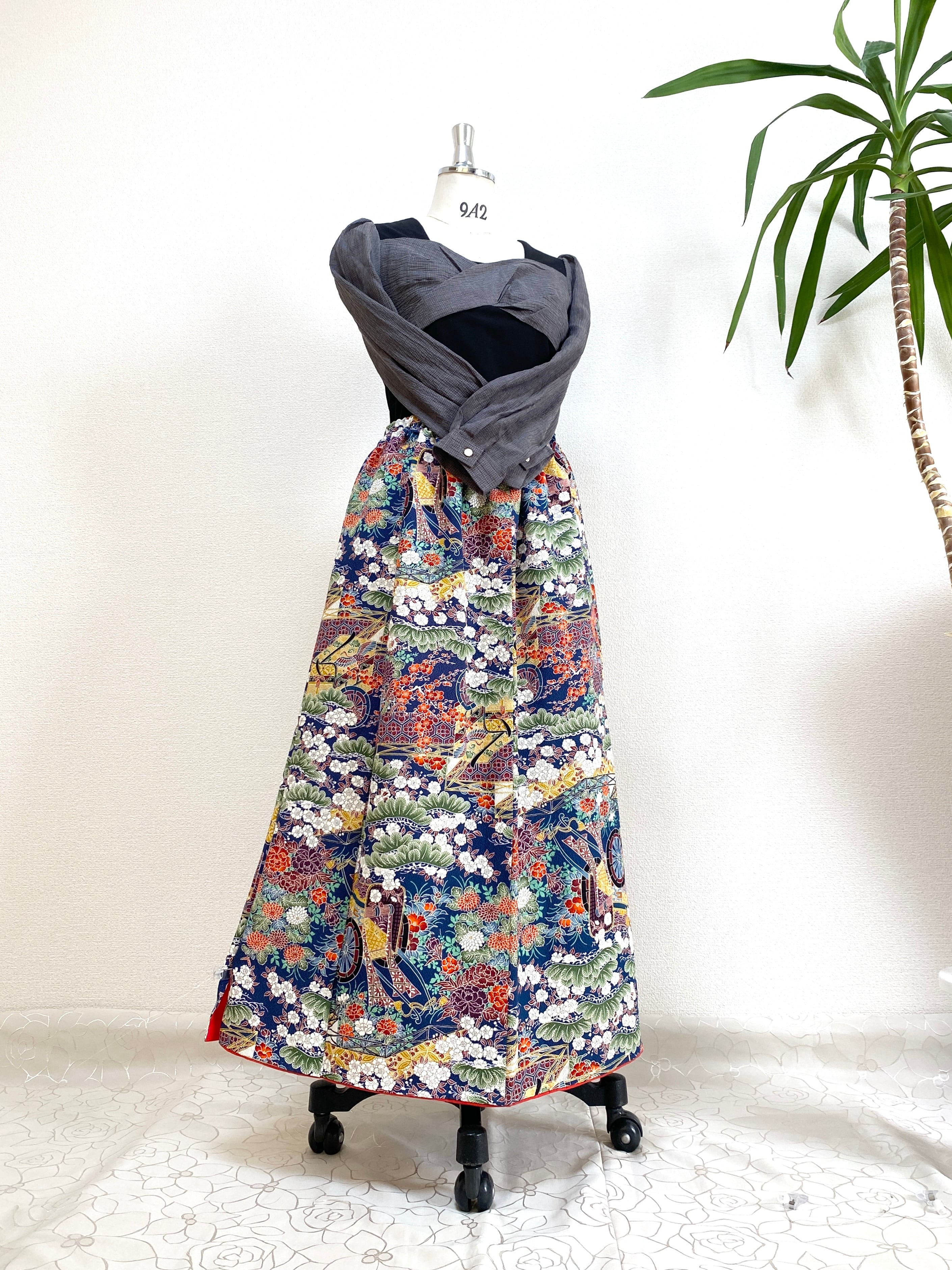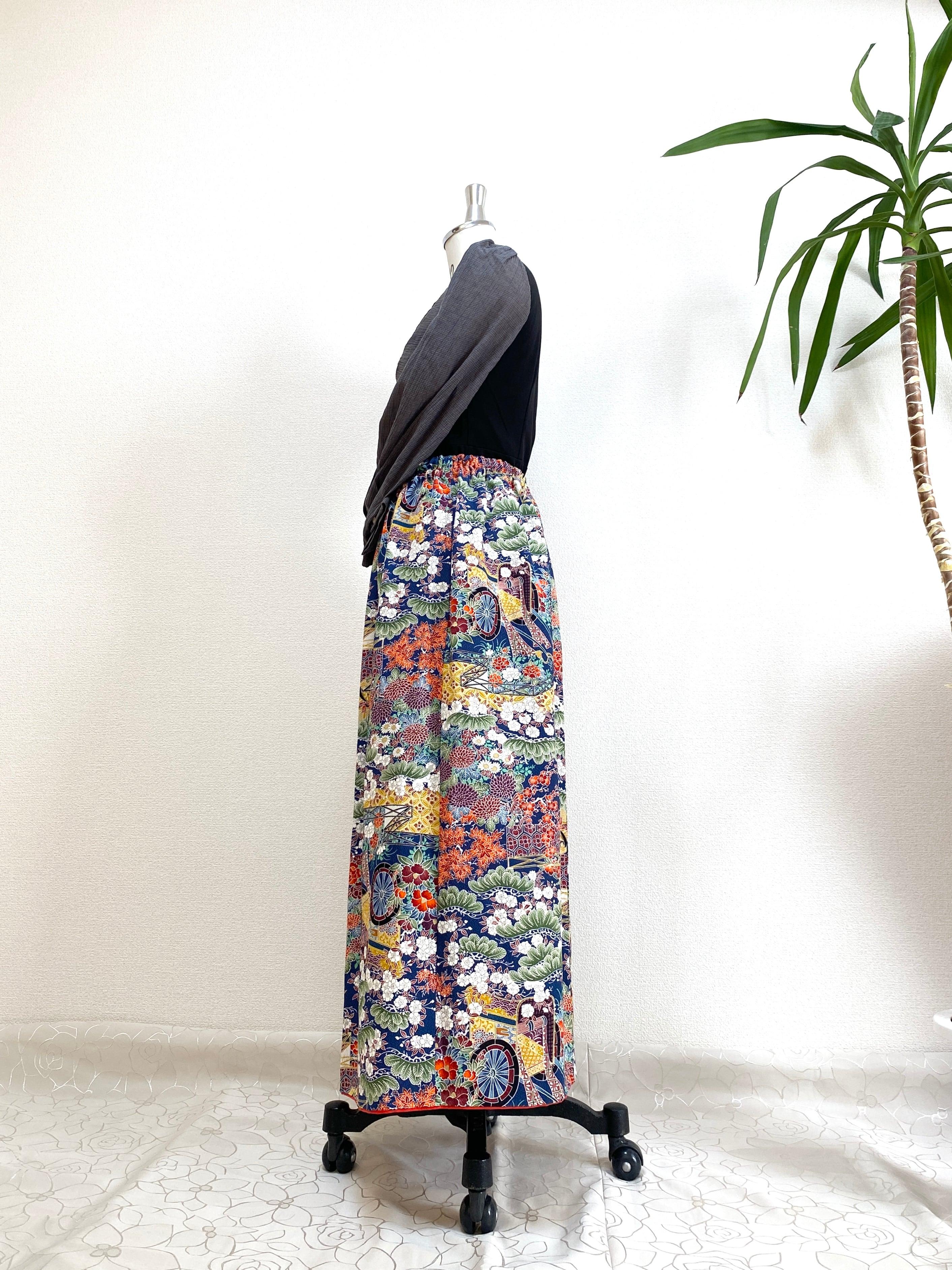 着物をリメイクして作製したウエストゴムロングドレススカートフリーサイズです
