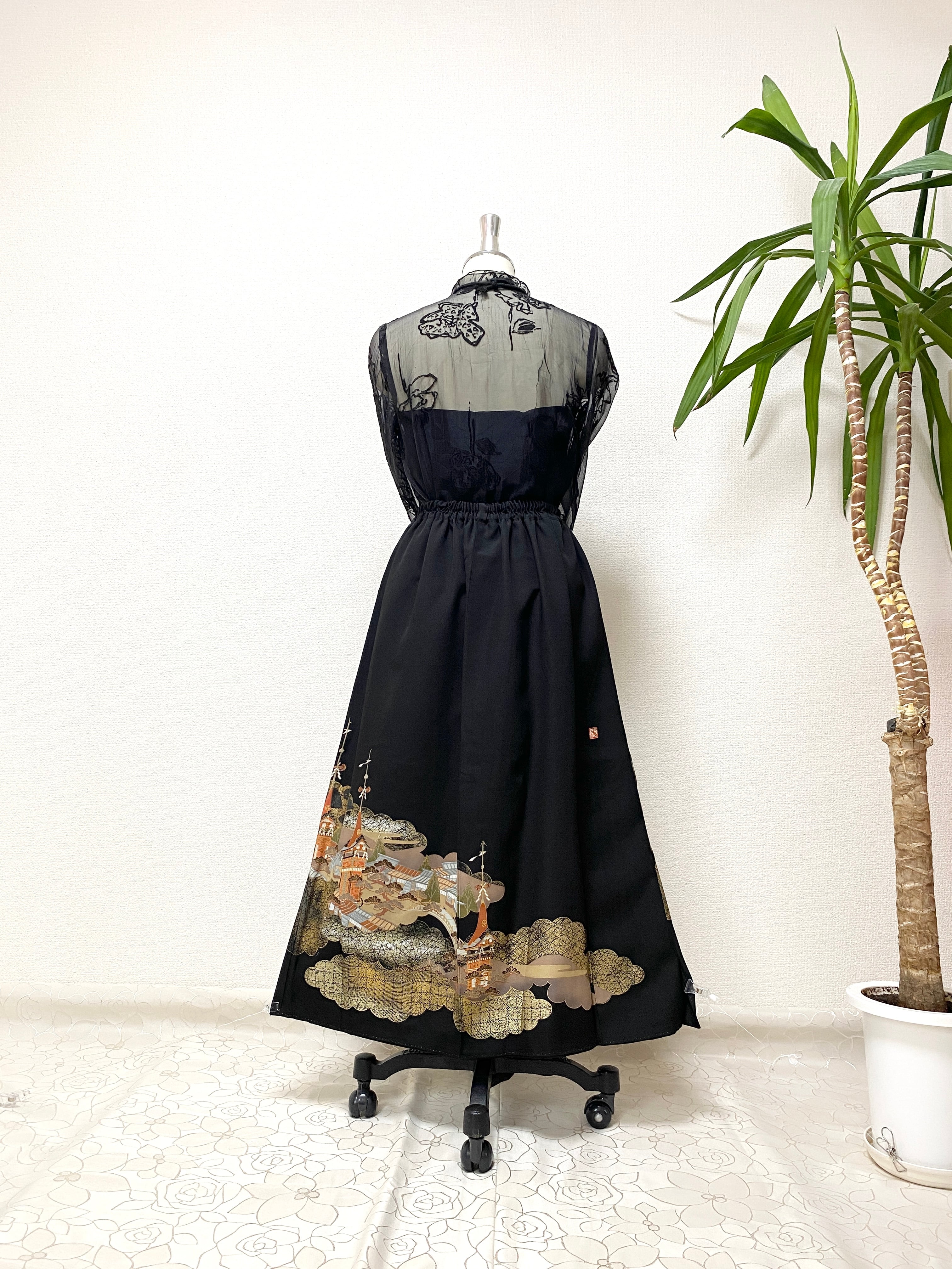 黒留袖着物をリメイクして作製したウエストゴムロングドレススカートフリーサイズです