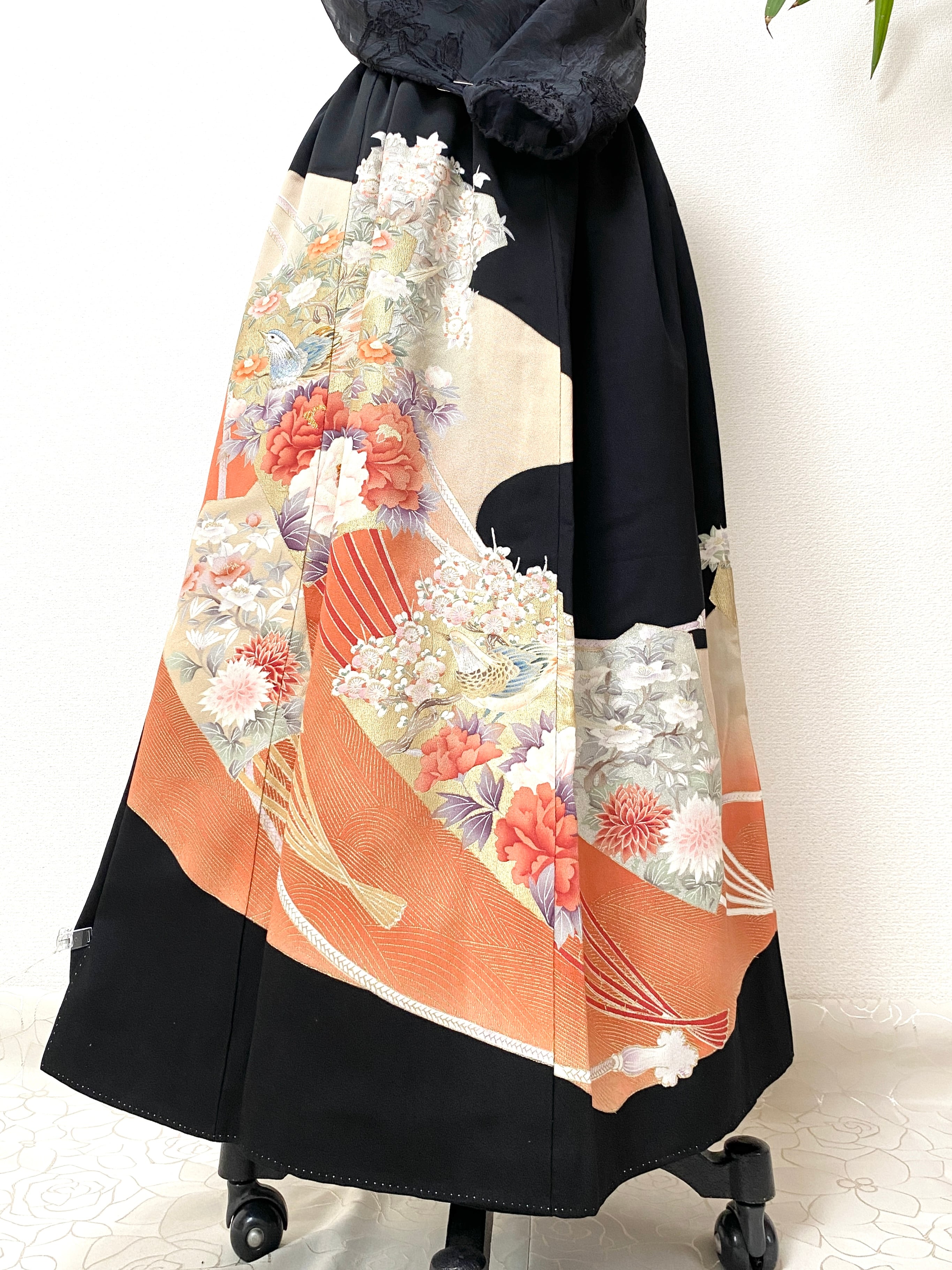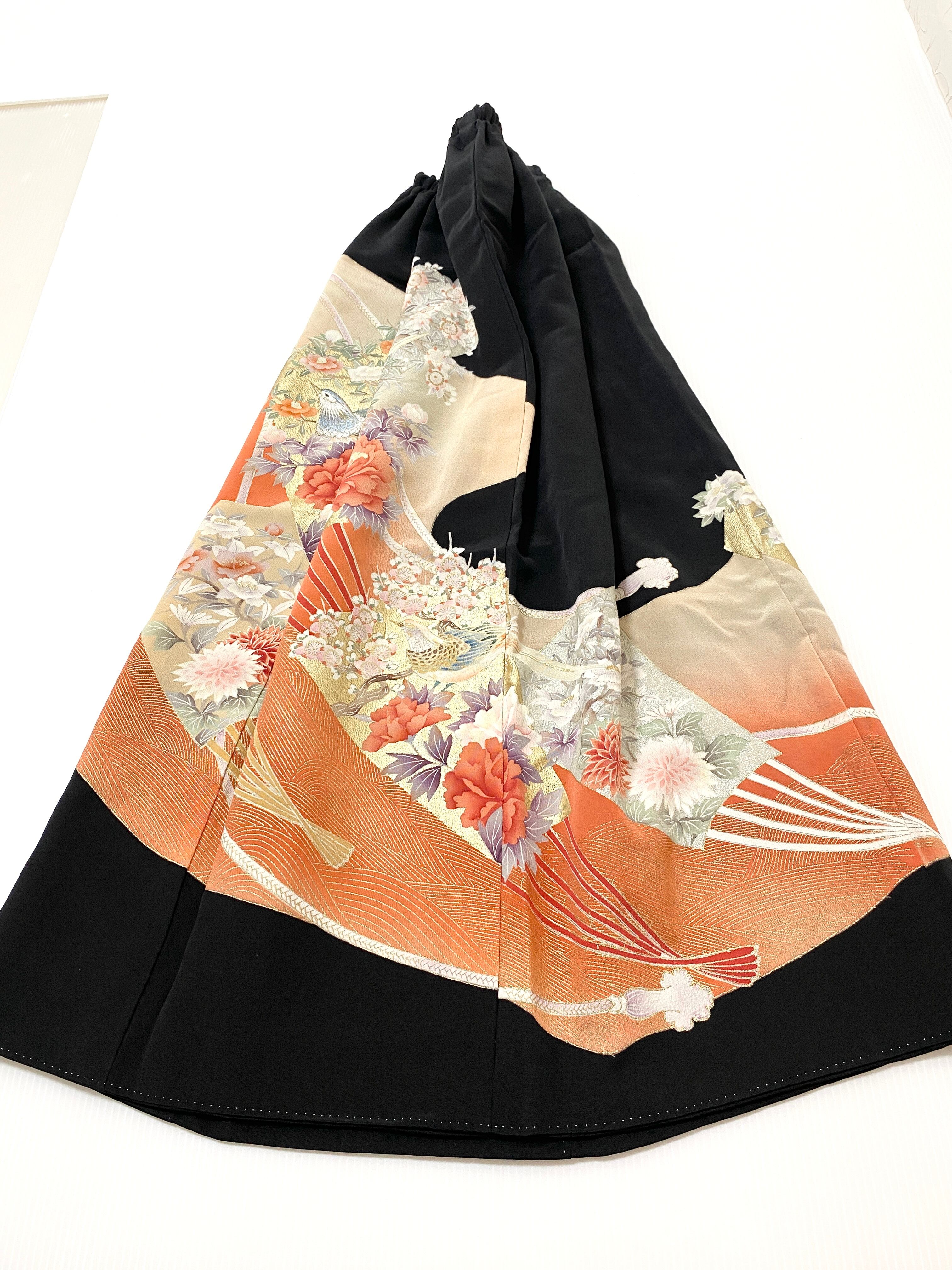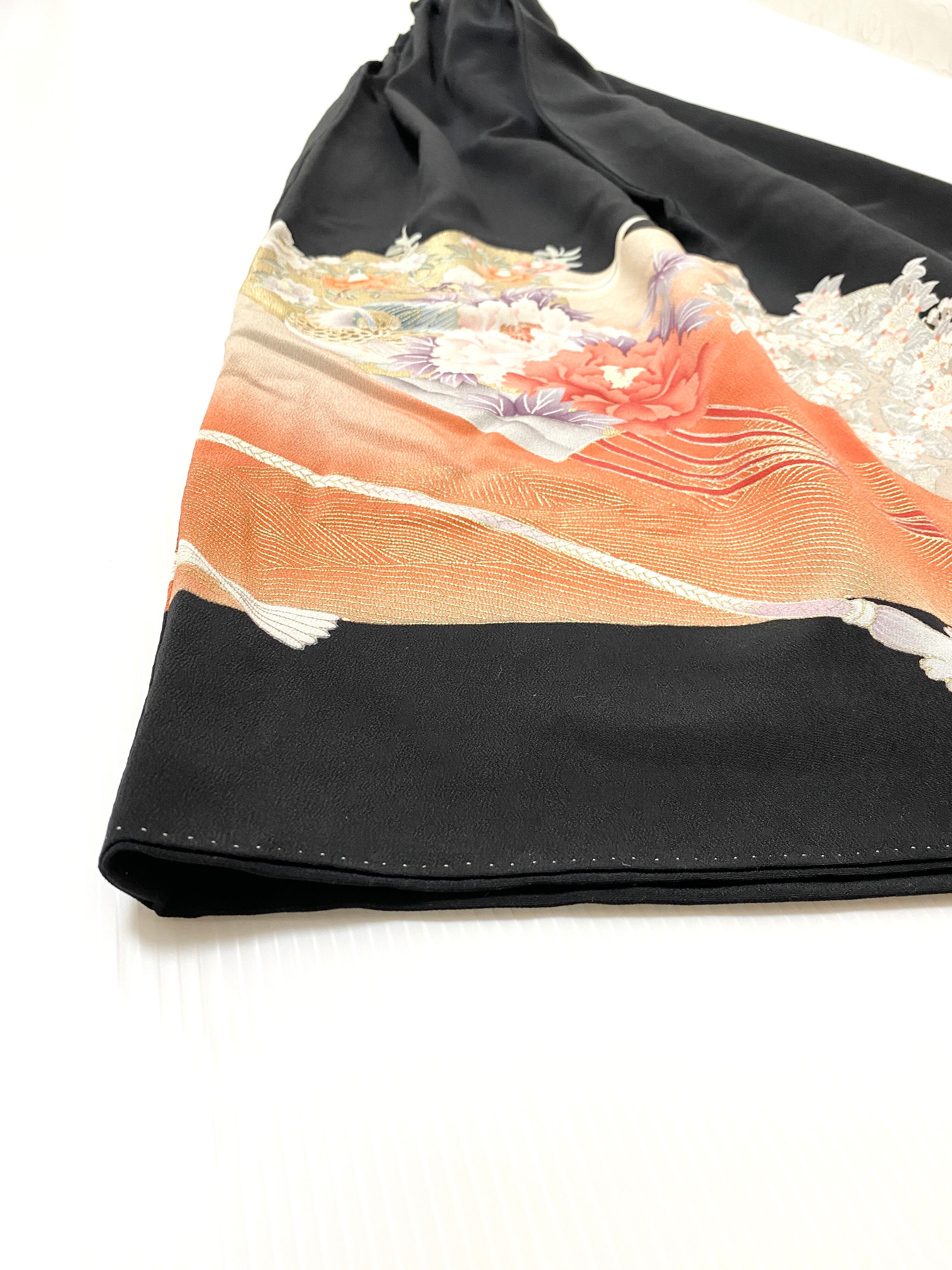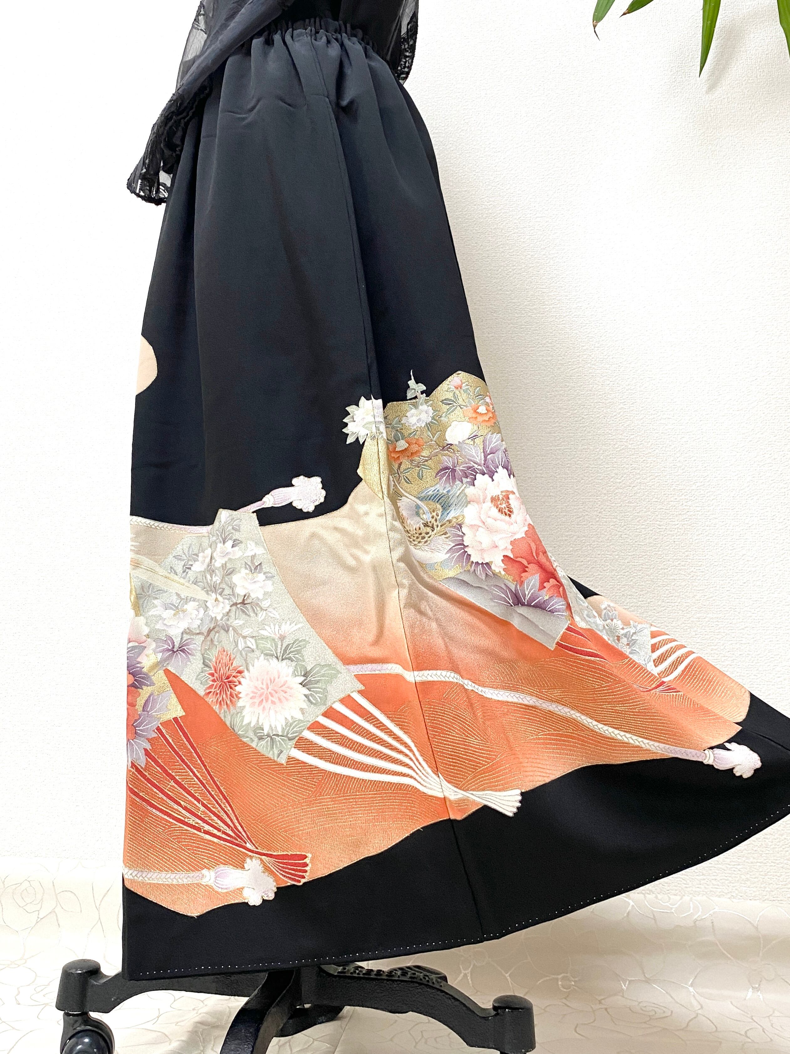 大人可愛いセレブ着物スカートフリーサイズ黒留袖着物リメイクウエストゴムロングスカート