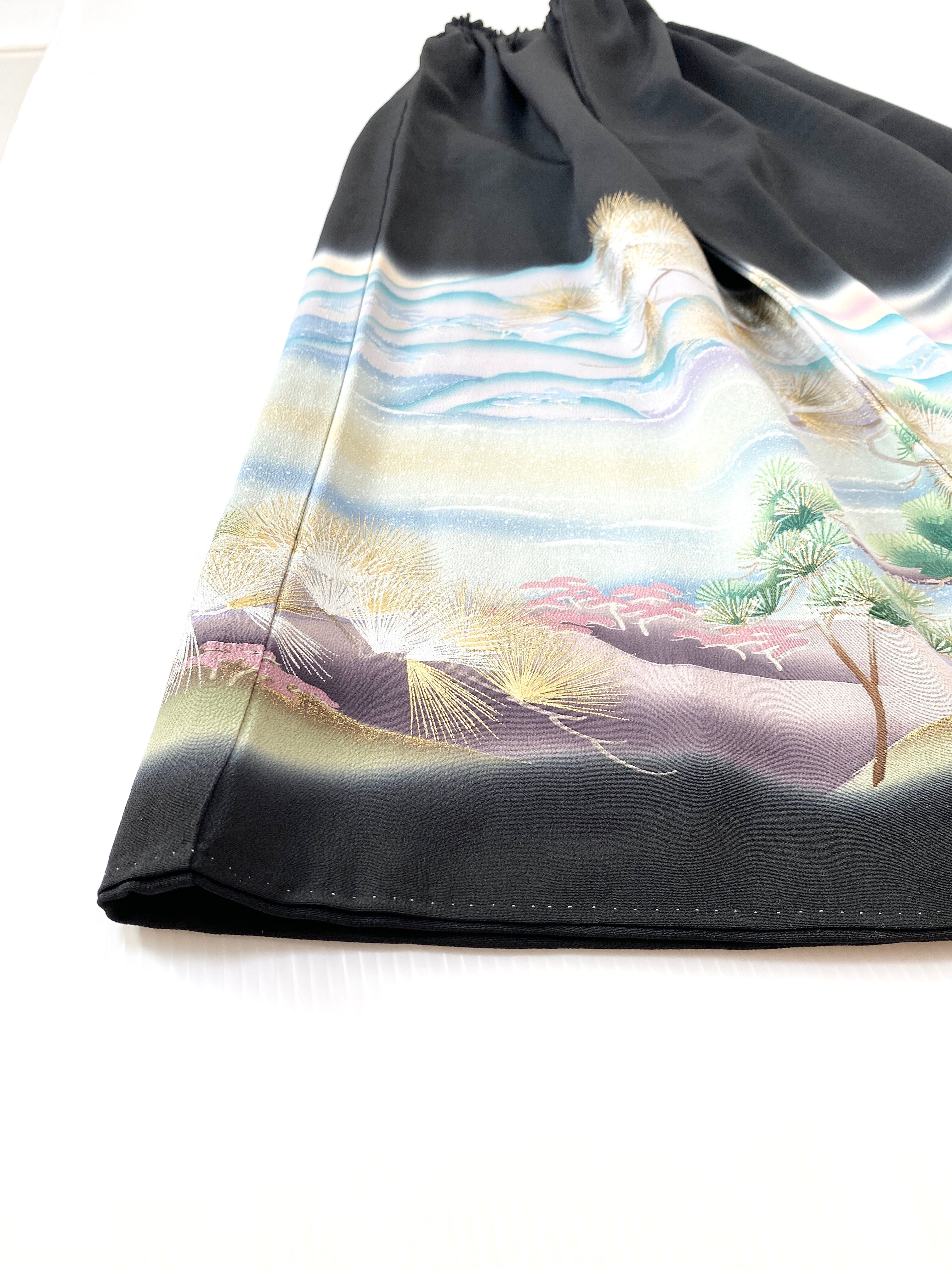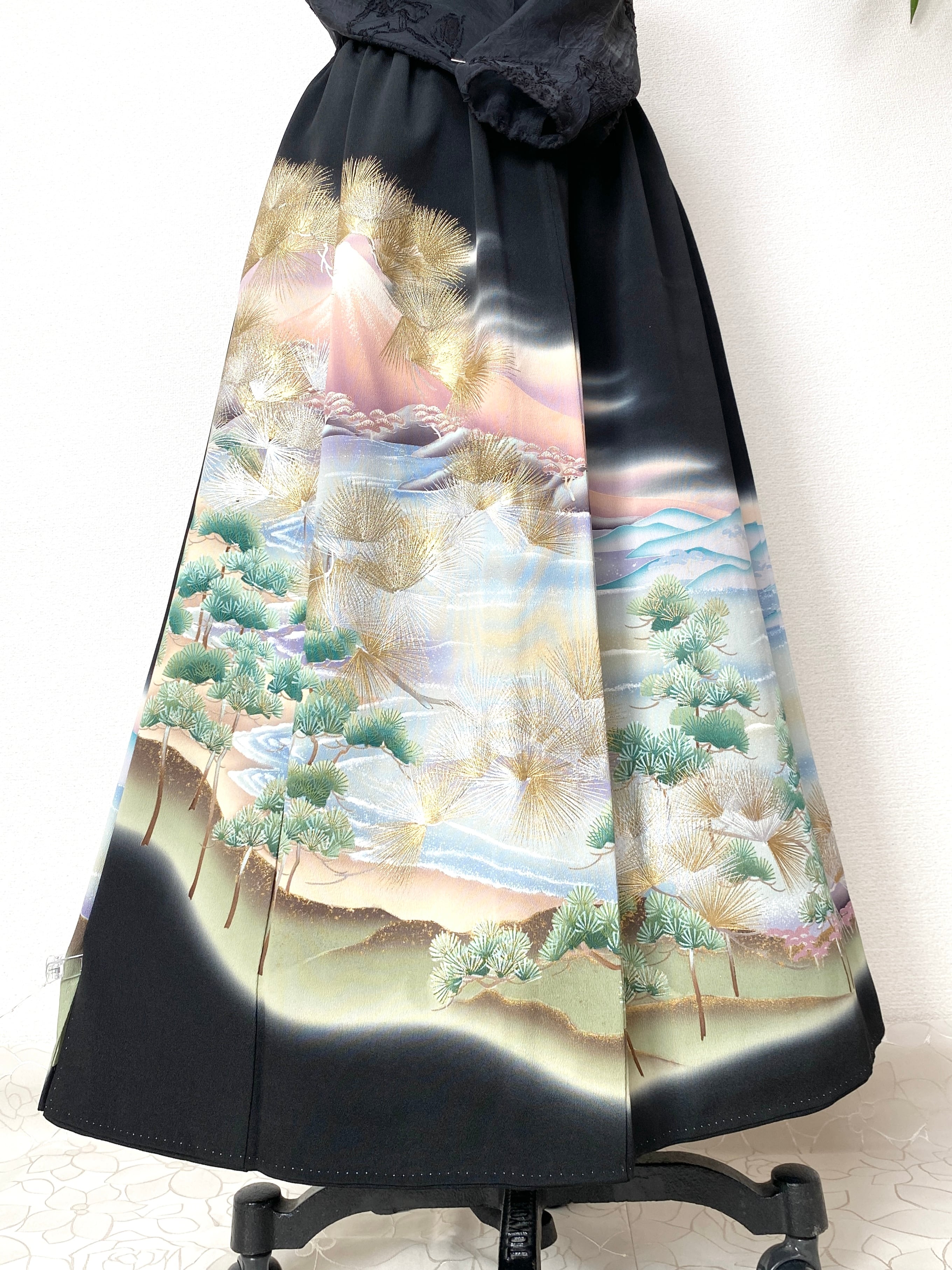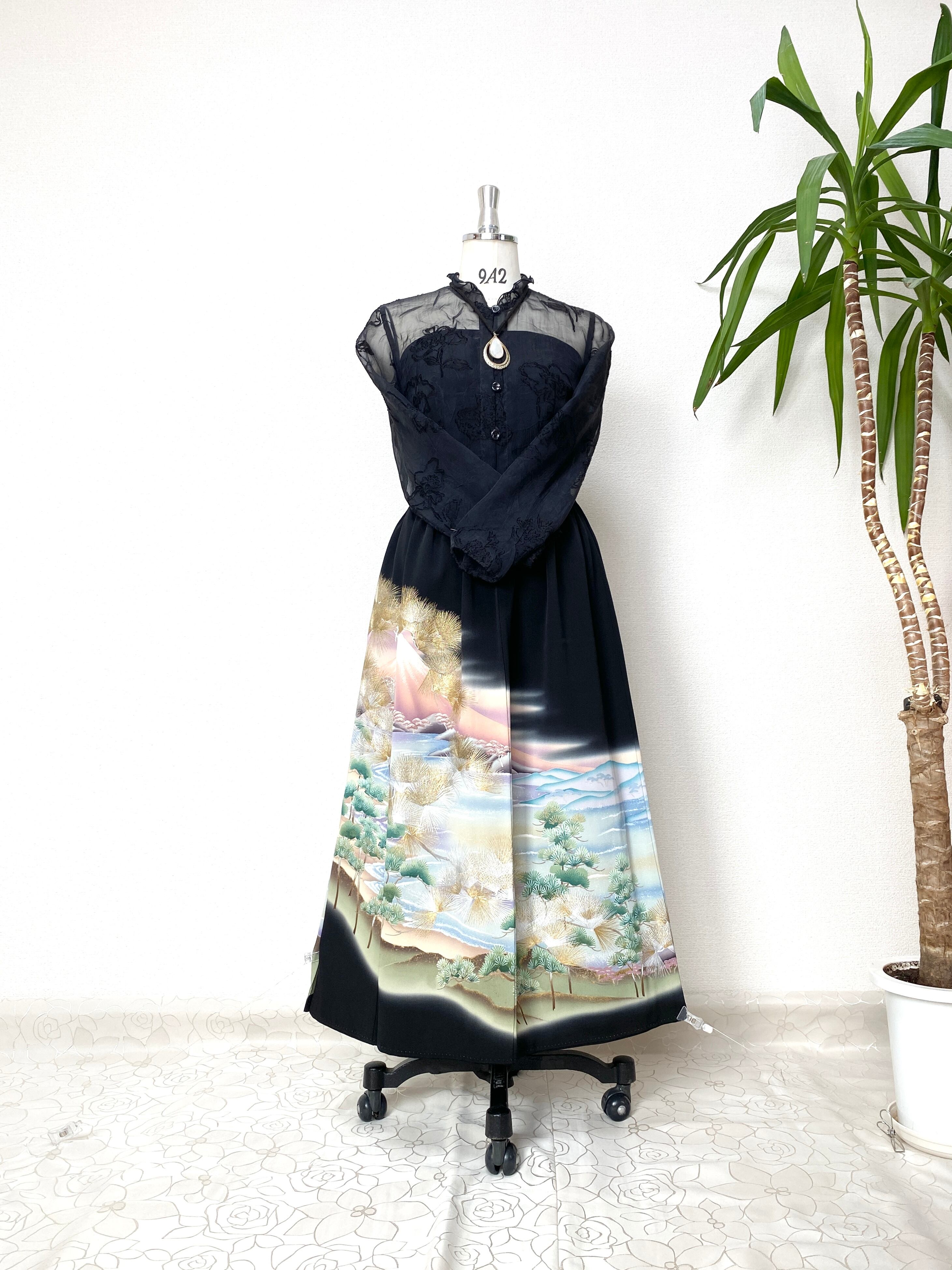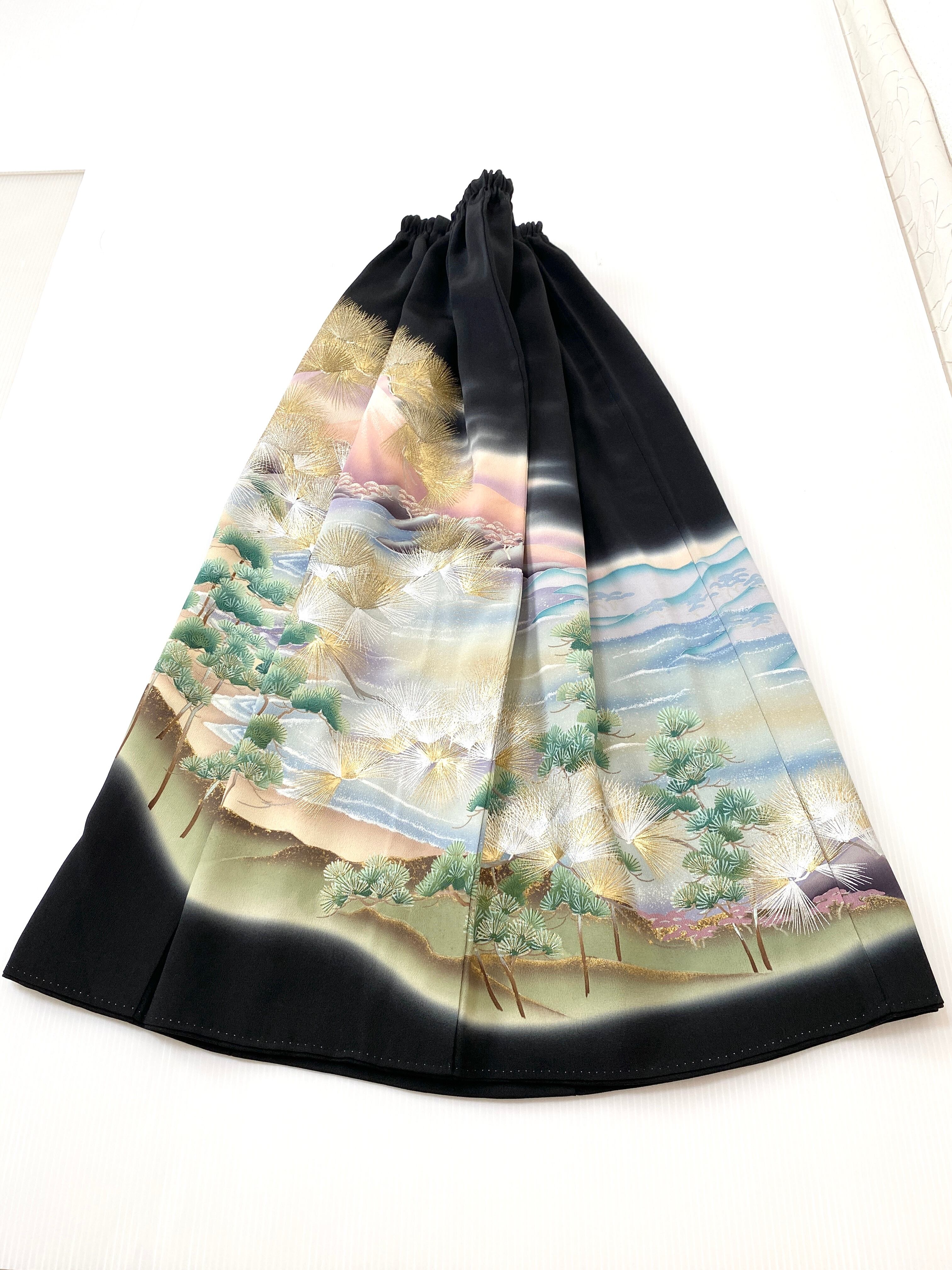 大人可愛いセレブ着物スカートフリーサイズ黒留袖着物リメイクウエストゴムロングスカート